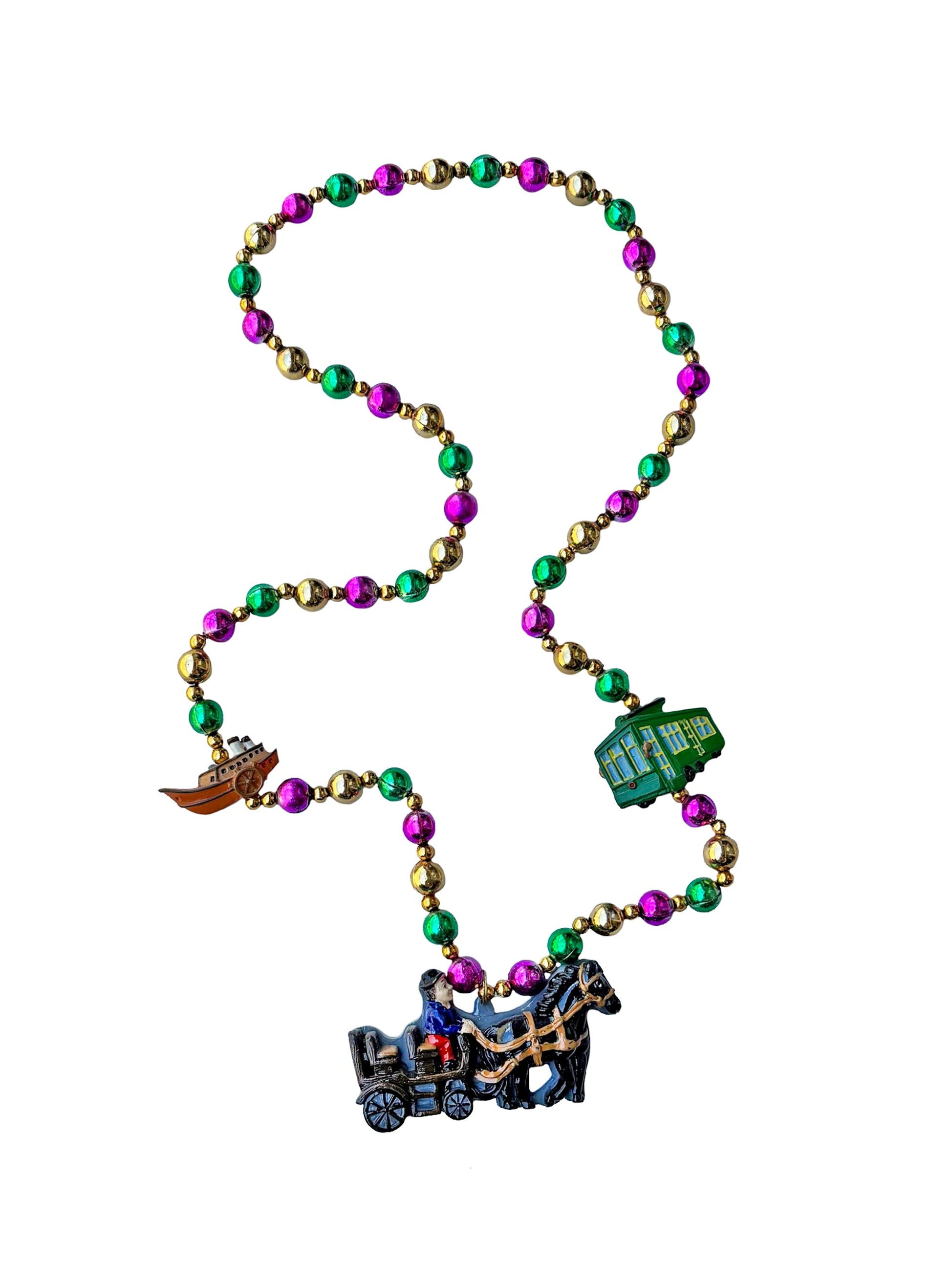 Strut down the parade route with our fabulous New Orleans Icons bead! Three tiny treasures—a steamboat, streetcar, and carriage—accent colorful Mardi Gras beads, capturing the essence of the Big Easy. These playful trinkets make you the life of the party! Perfect for revelers who want a little piece of NOLA magic to keep the good times rolling!