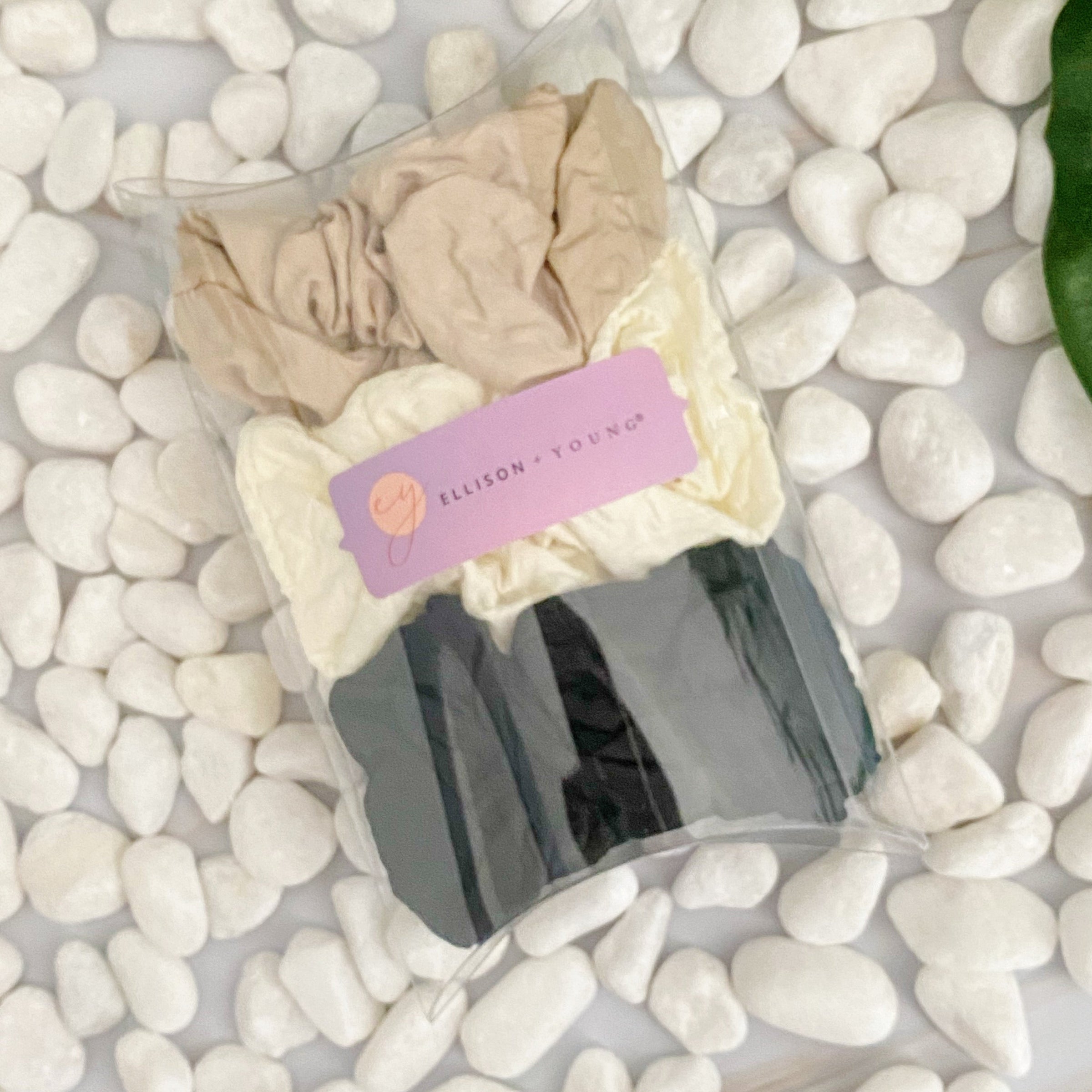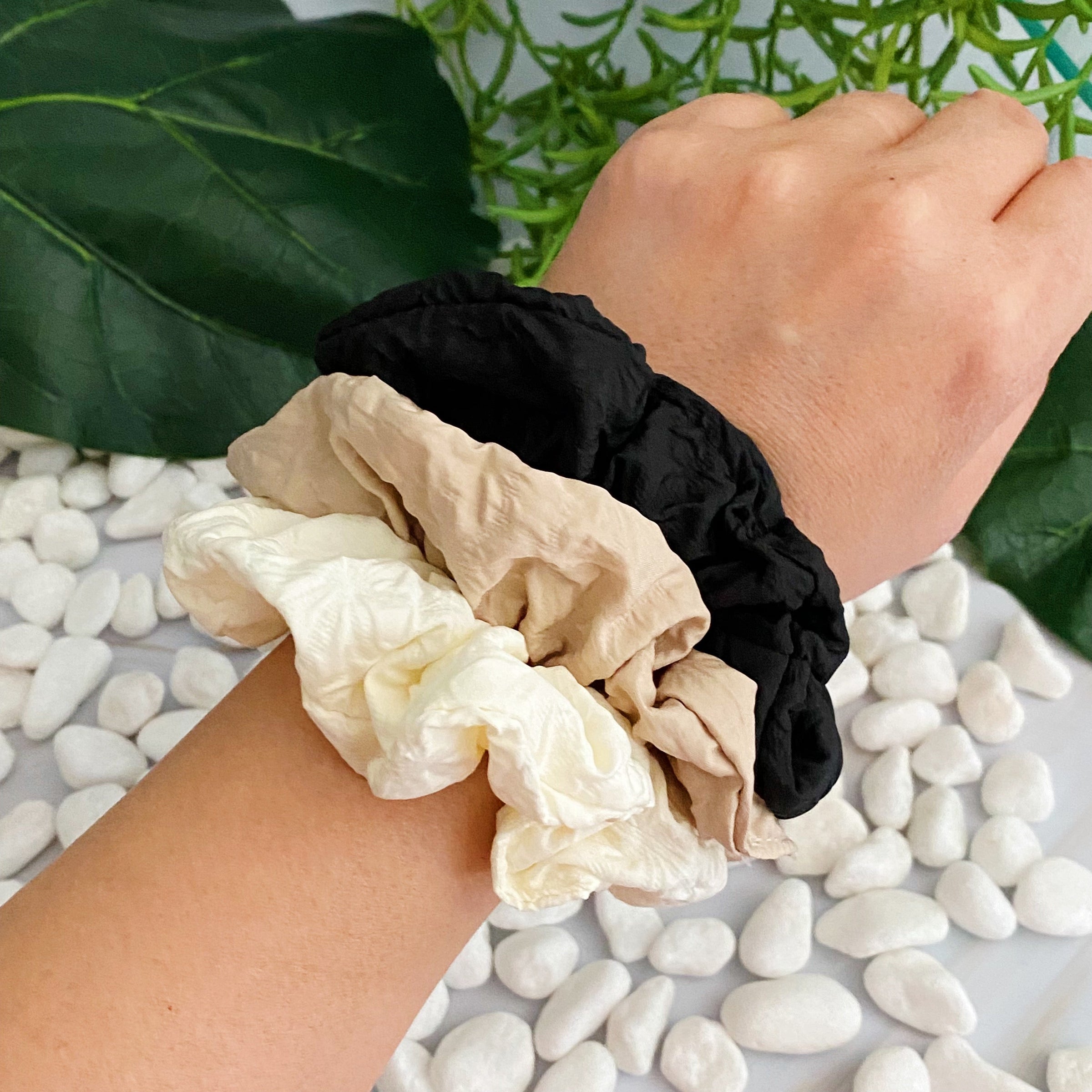 Our Palace Jacquard Scrunch Set is the perfect way to add a touch of elegance and style to your look. This set comes with 3 beautiful textile scrunches featuring different neutral colors and intricate textures. With its simple and classy design, it's great for everyday wear or as the perfect final touch for any occasion.