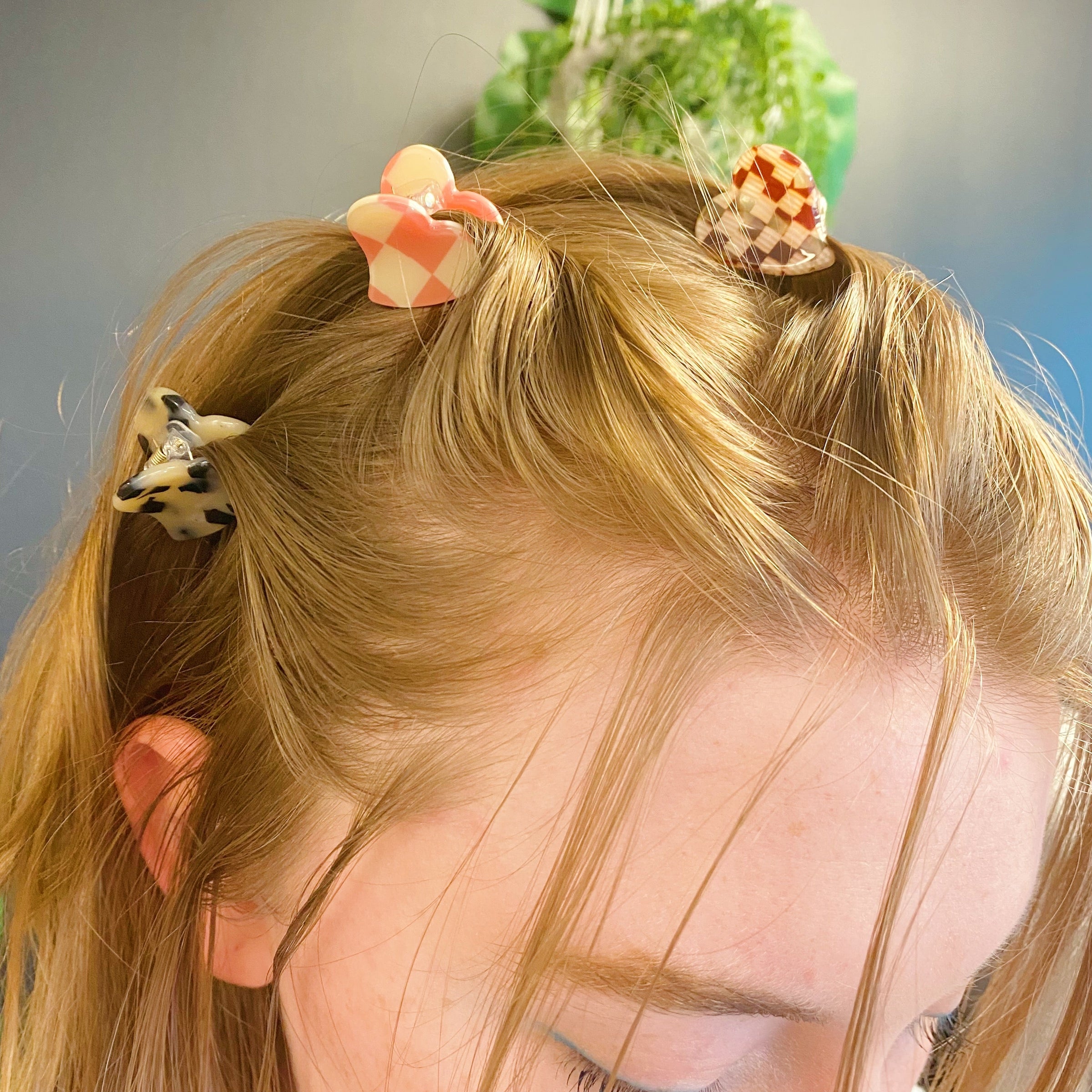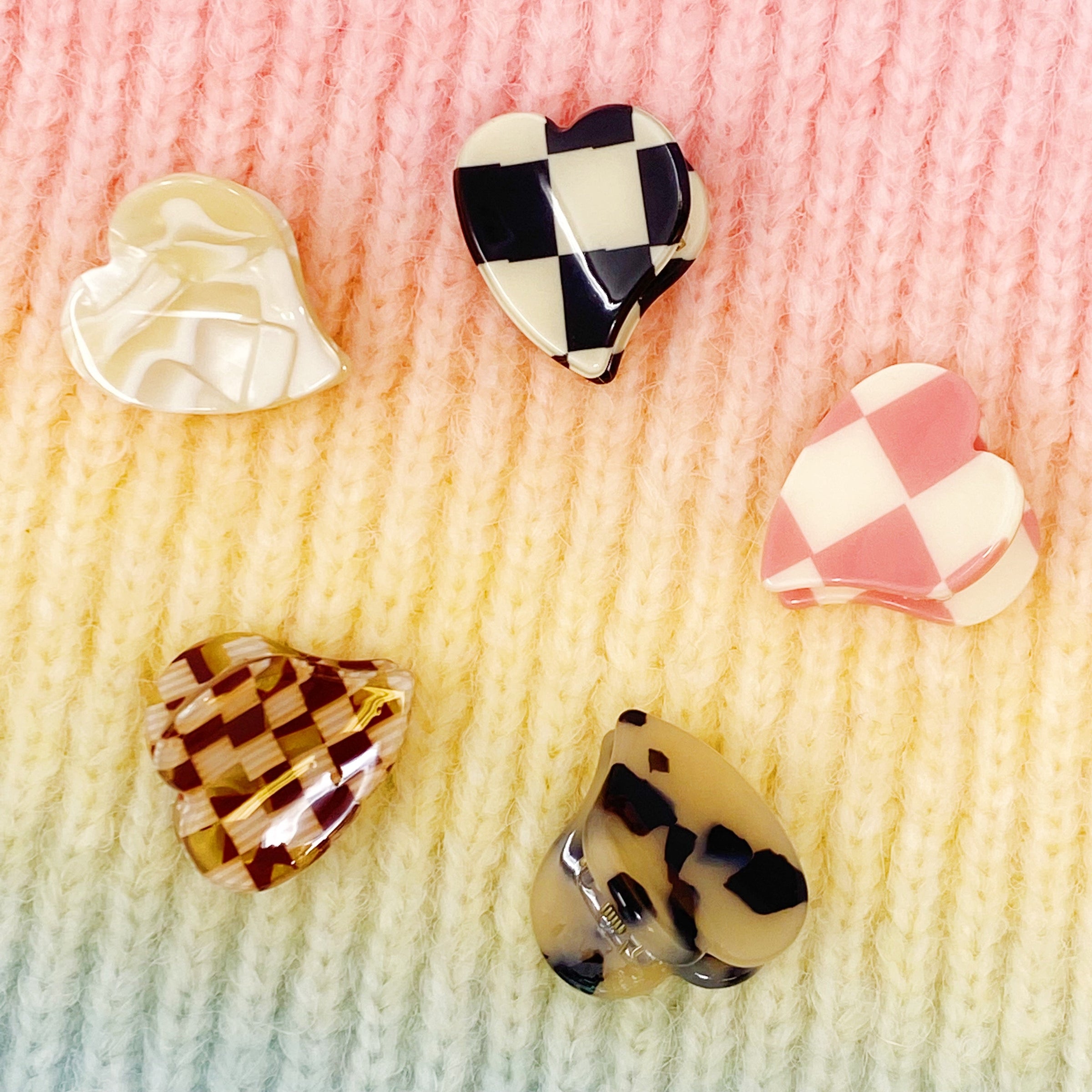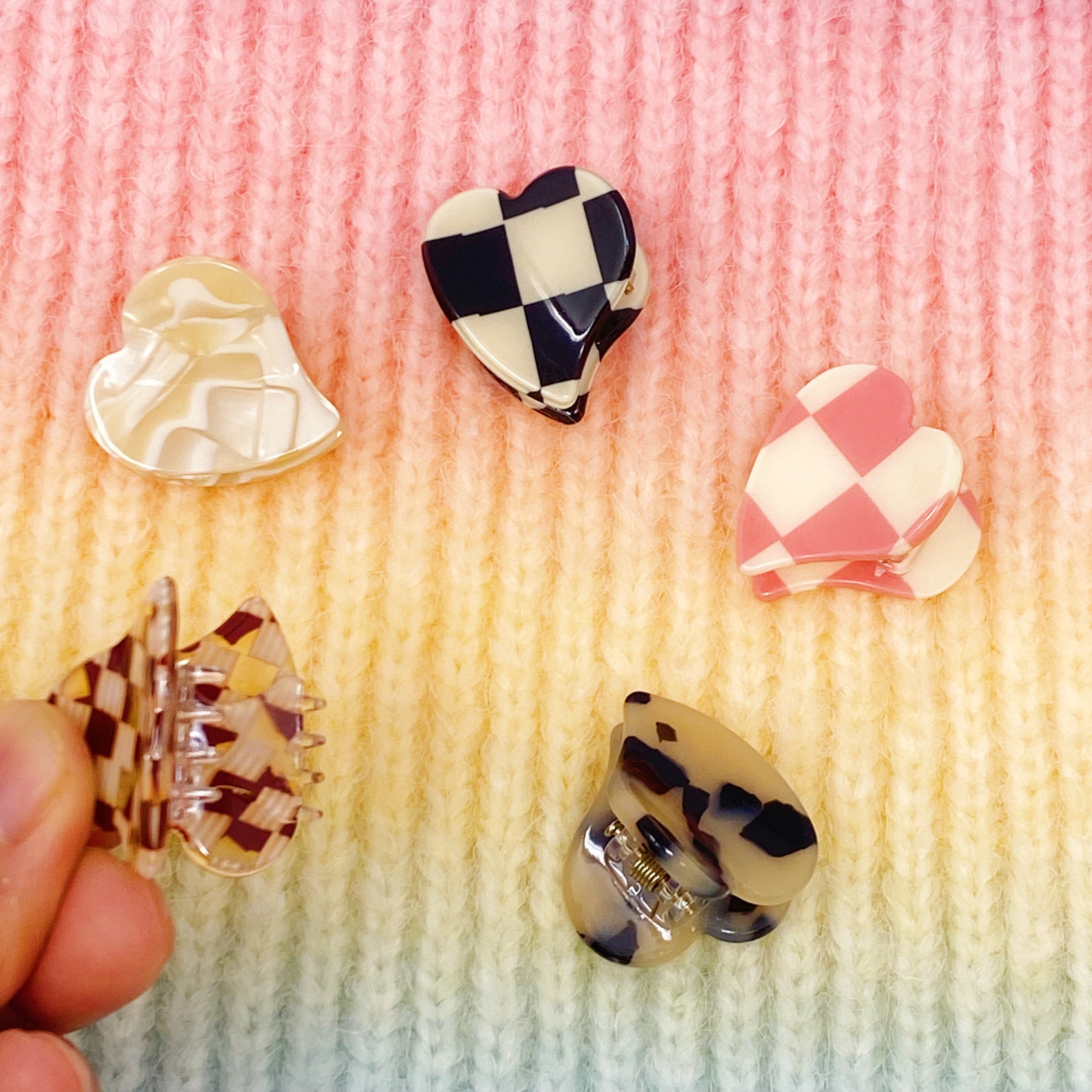 Precious mini size heart shape hair claw set! This set has 5 adorable mini clips carefully picked in classic and trendy mixture!