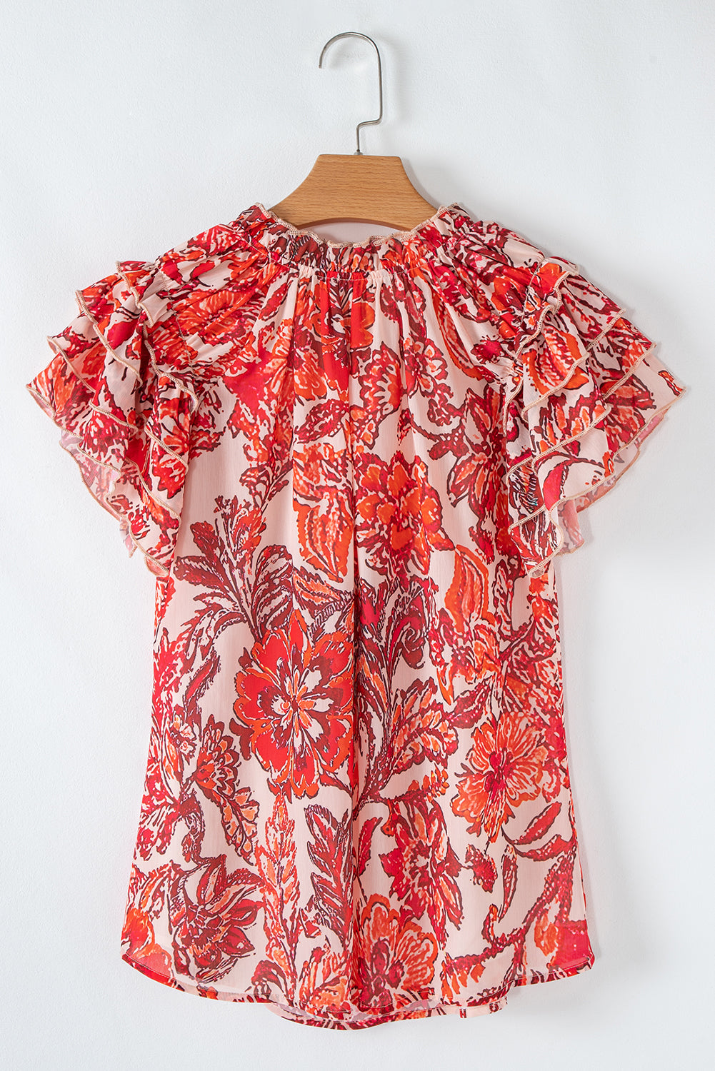 Introducing our latest addition - the Raina Vintage Floral Ruffle Sleeve V Neck Blouse! Get ready to embrace retro vibes with this chiffon top, perfect for those sunny summer days. Its split v neck comes with a tie and frilly accents for a touch of charm. And don't miss out on the flutter sleeves with their playful tiered ruffle design.