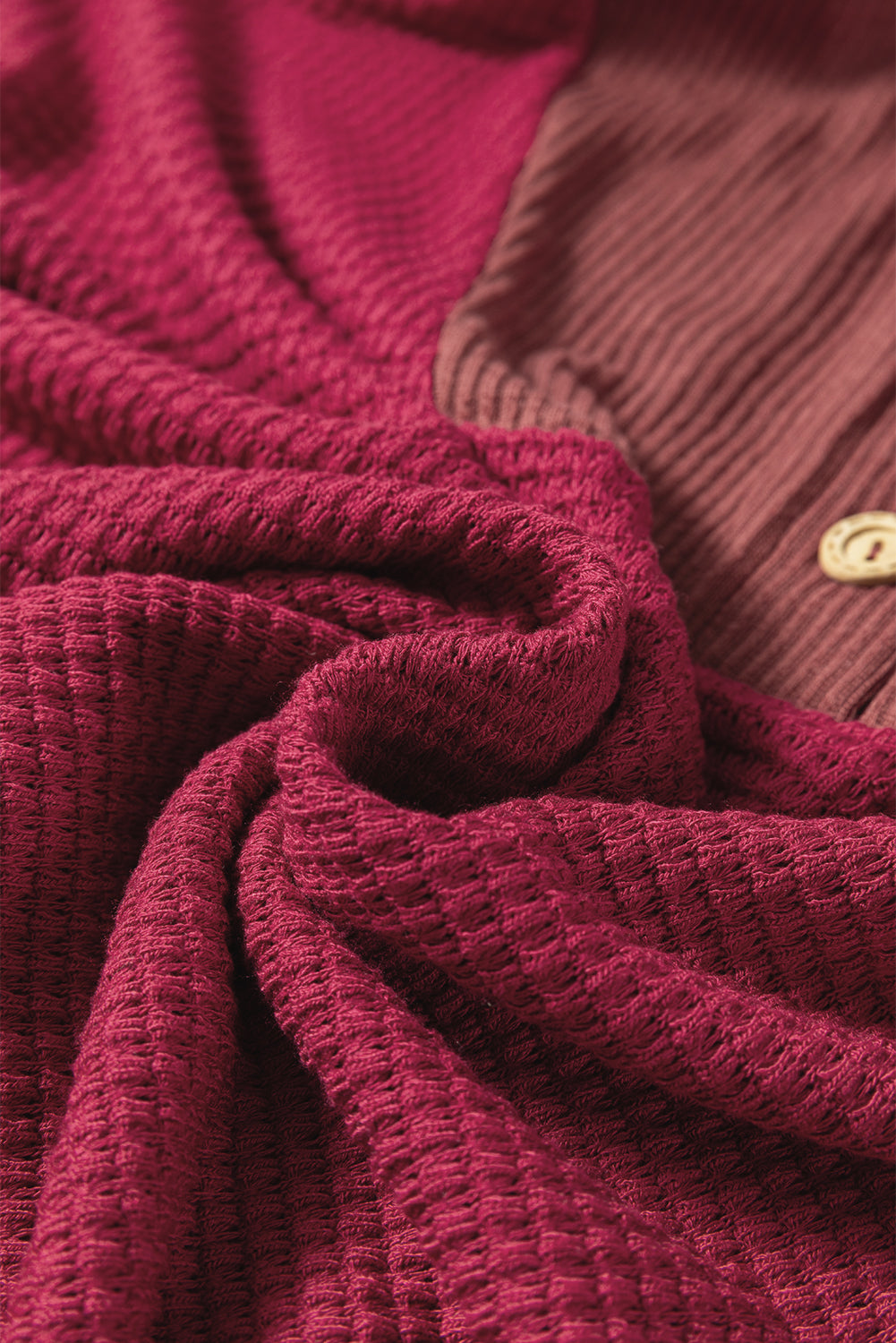 This waffle top features trendy ribbed fabric patches with a fun twist. Its hood adds a cool, casual vibe, while the button-up front keeps things stylish and simple. The relaxed drop shoulder design makes it perfect for a laid-back look.