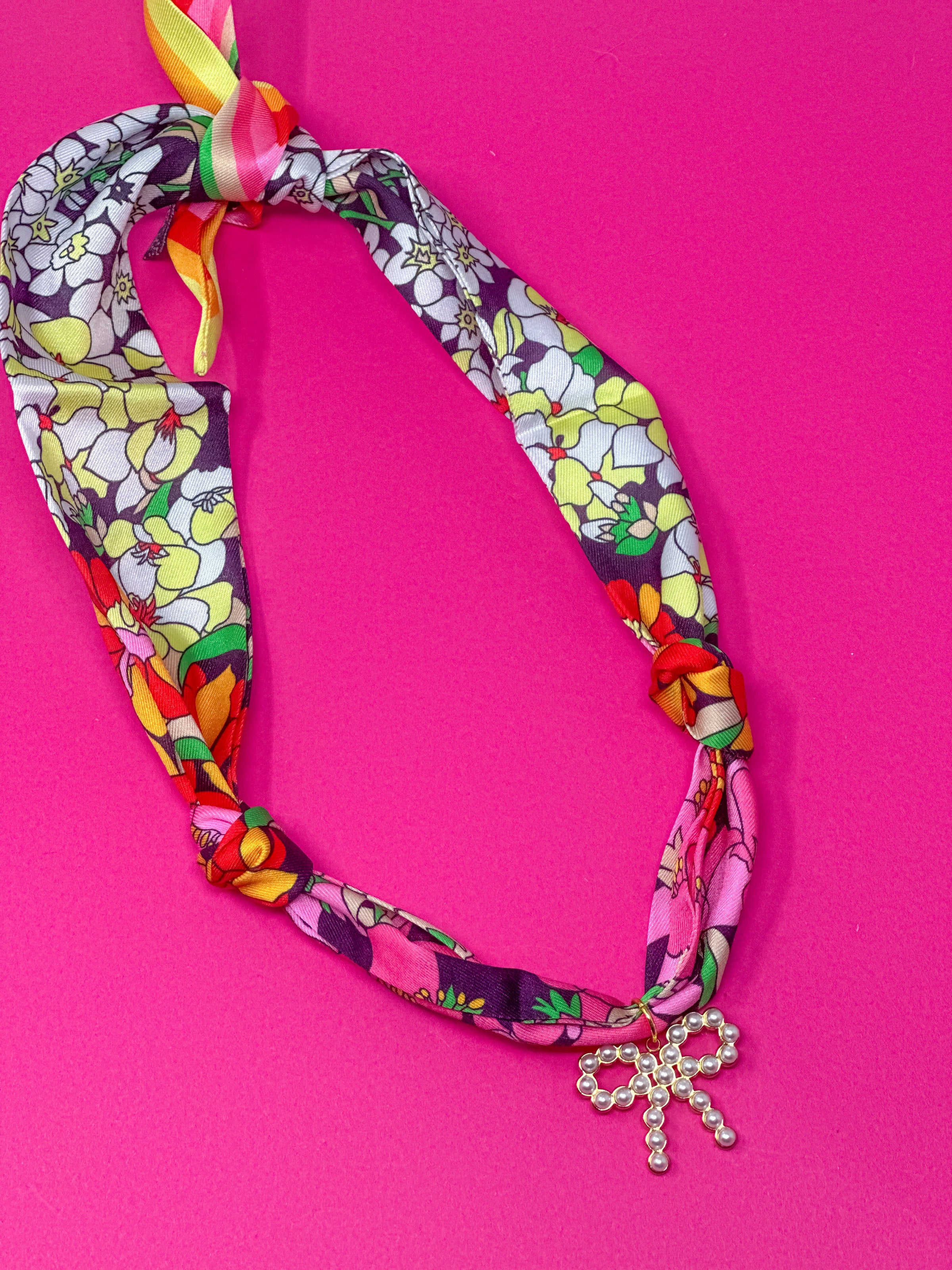 Chic meets charm in this Black Floral Scarf Charm Necklace featuring a dainty pearl-encrusted bow pendant. The black floral scarf brings an elegant contrast with soft, romantic florals, while the shimmering pearl bow adds a touch of grace and sophistication. Whether dressed up or down, this necklace is a timeless statement piece that effortlessly elevates any look.