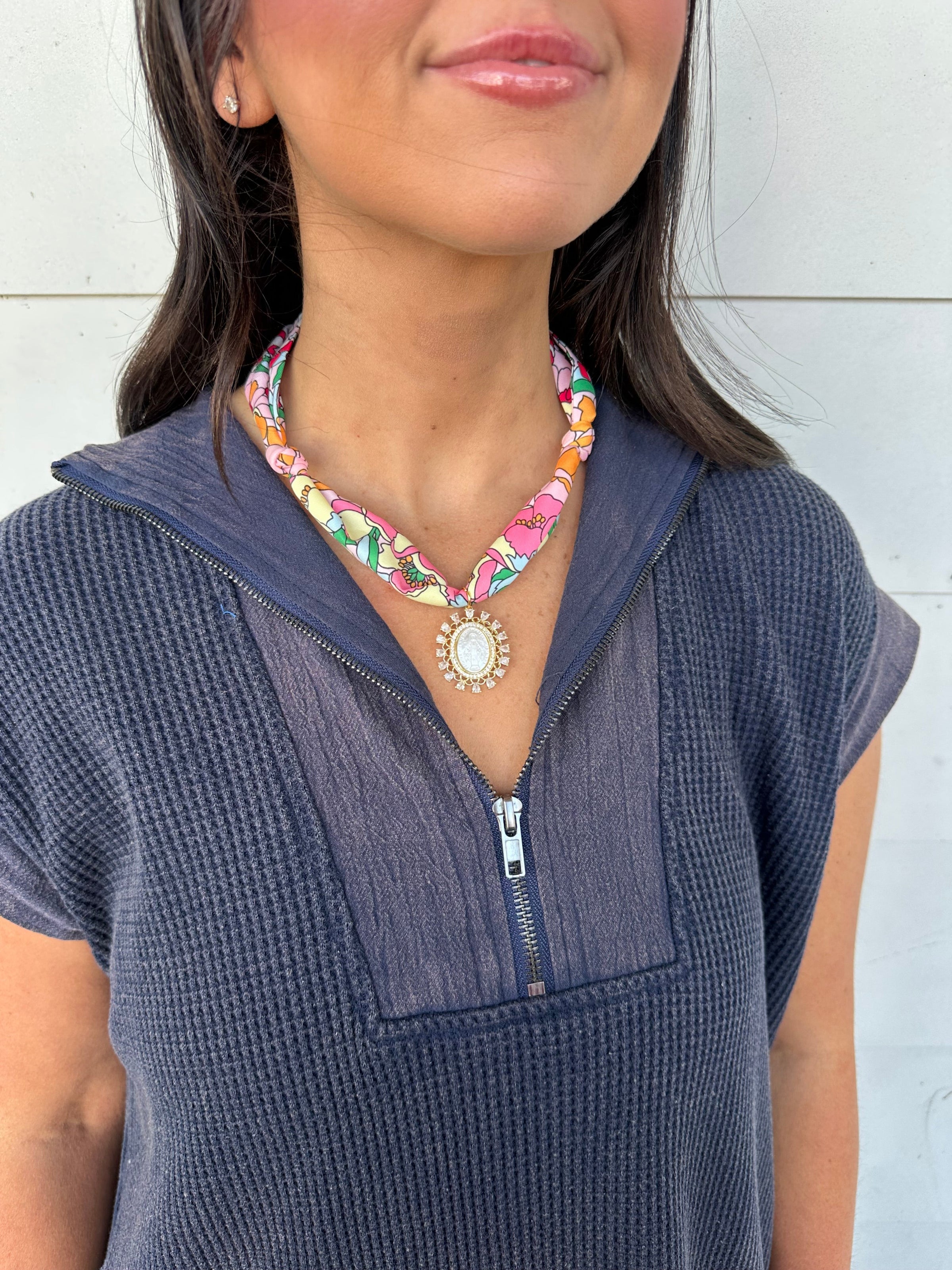 Scarf Charm Necklace – Pink and Purple Multi with Mother of Mary Rhinestone Charm