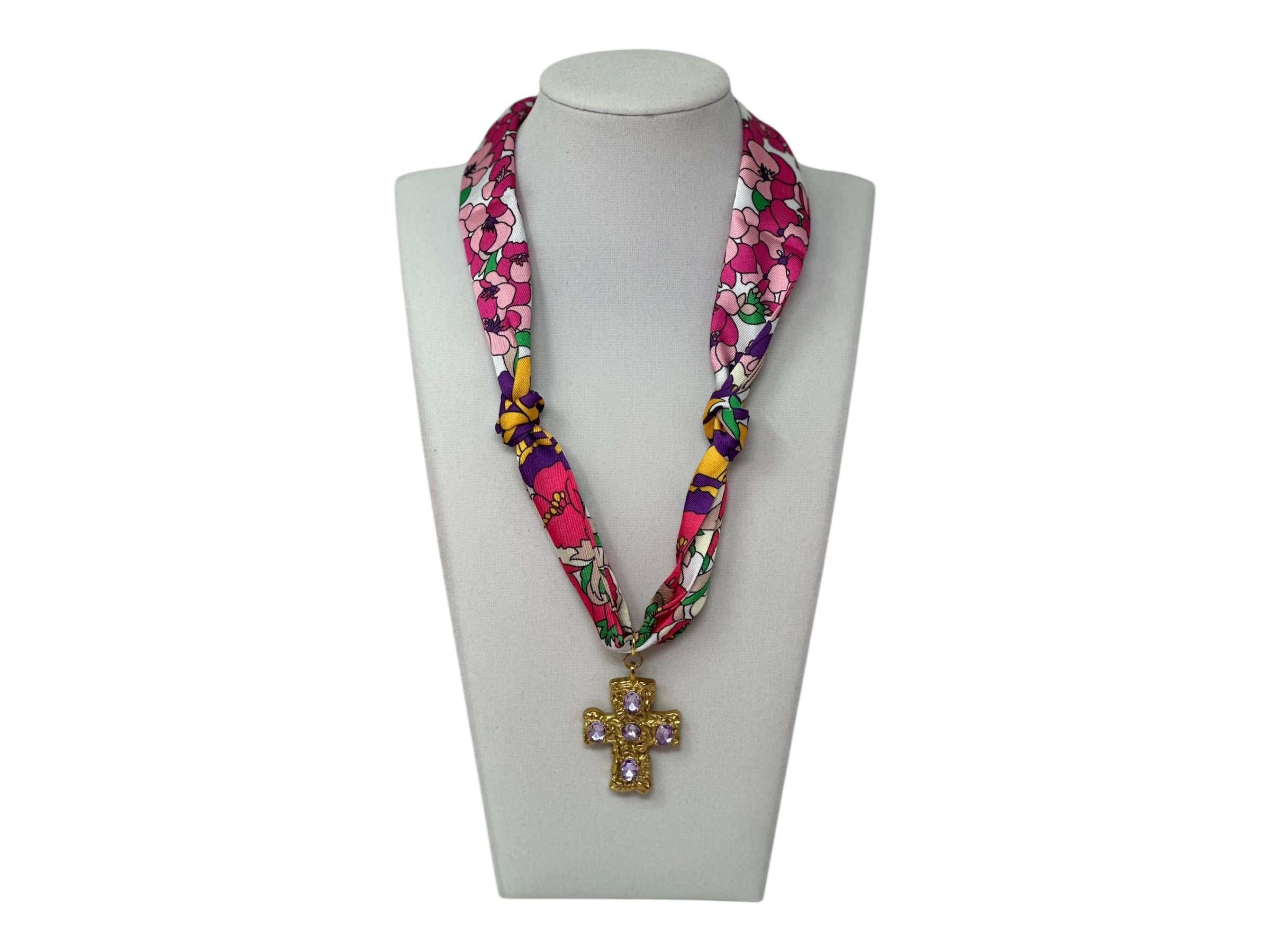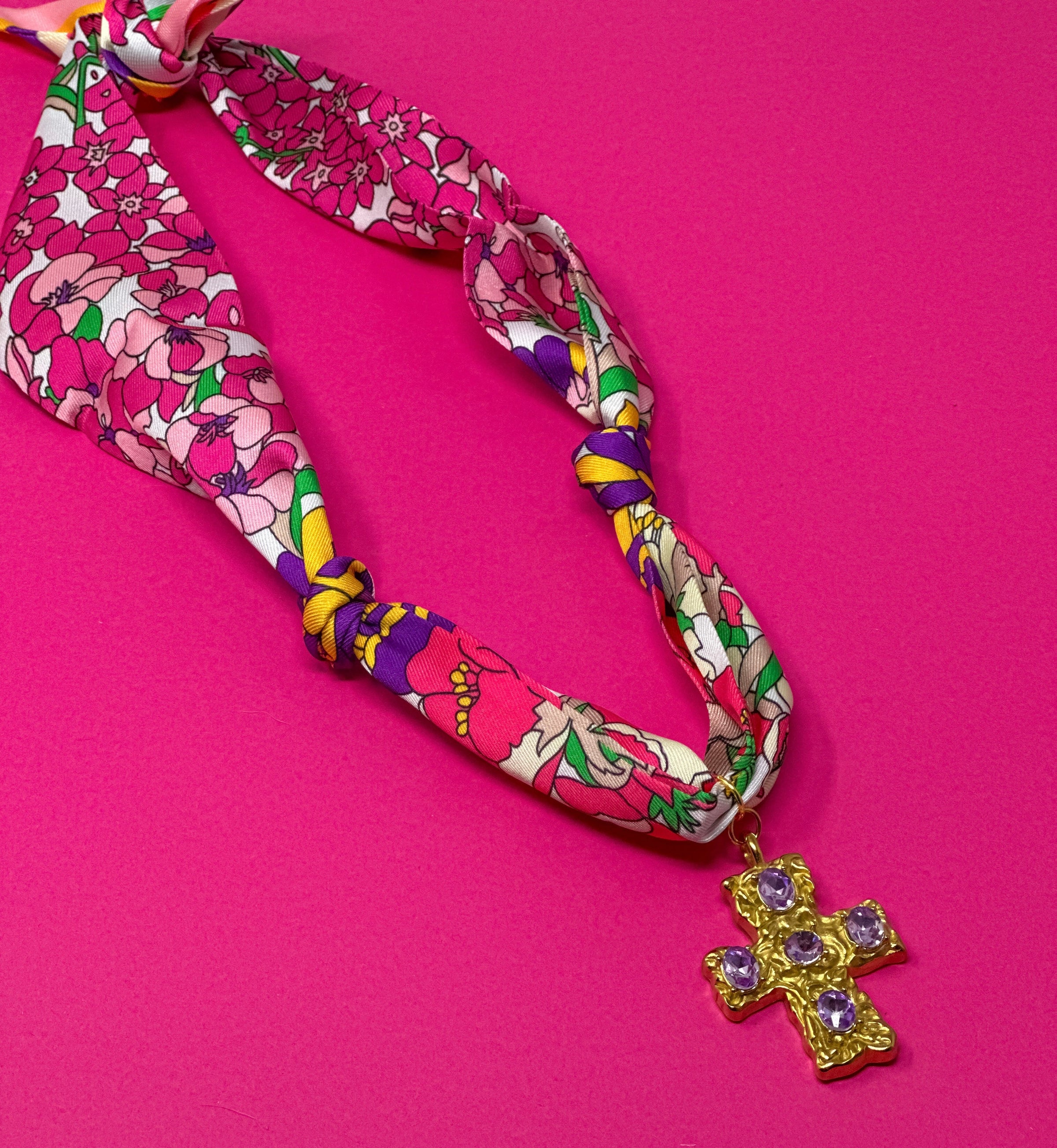 Scarf Charm Necklace - Pink Scarf Necklace with Purple Rhinestone Cross