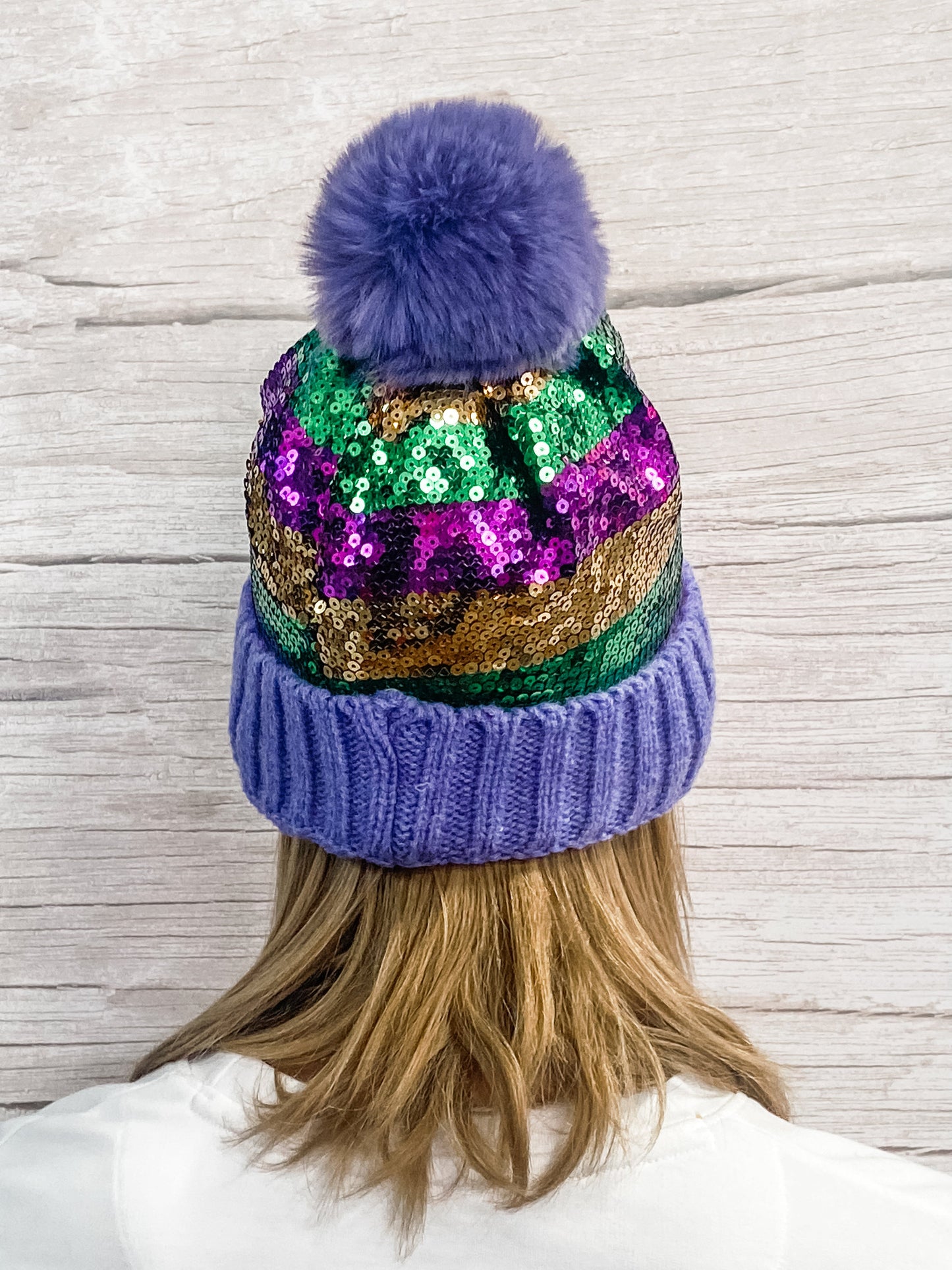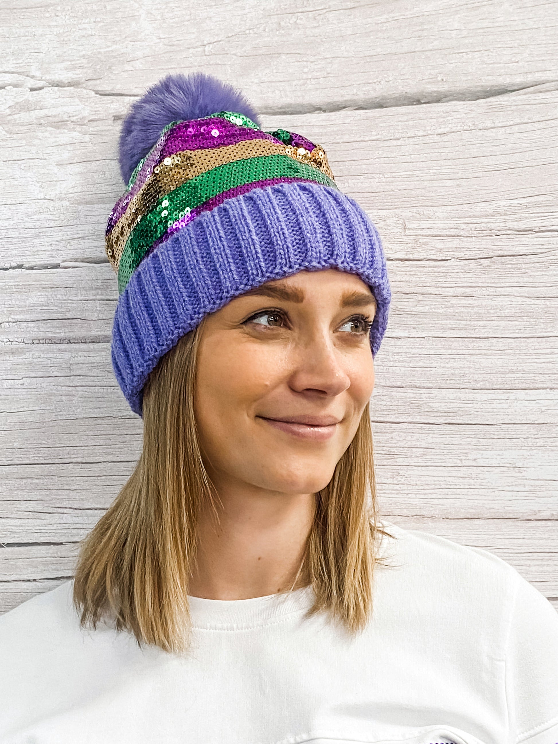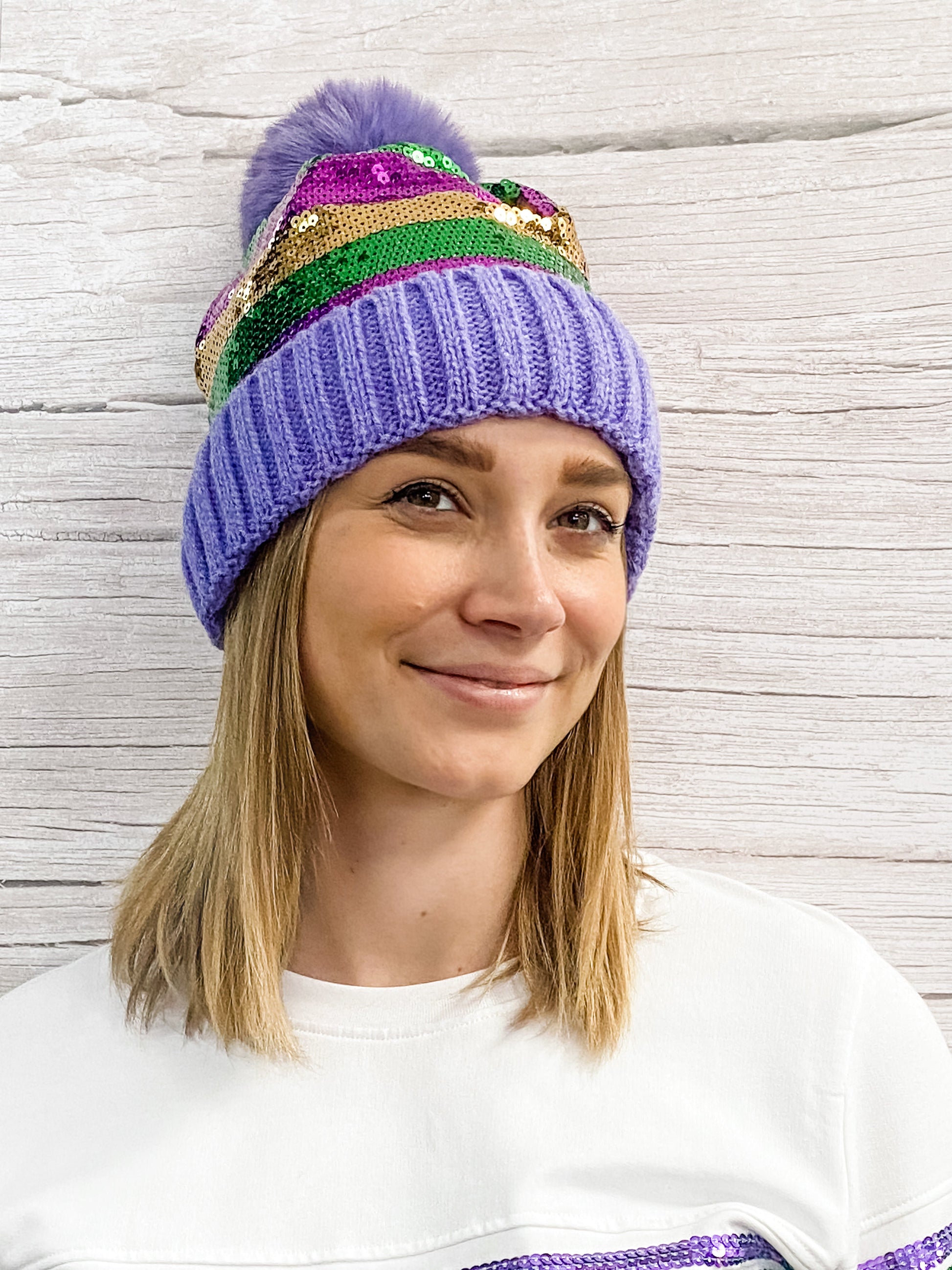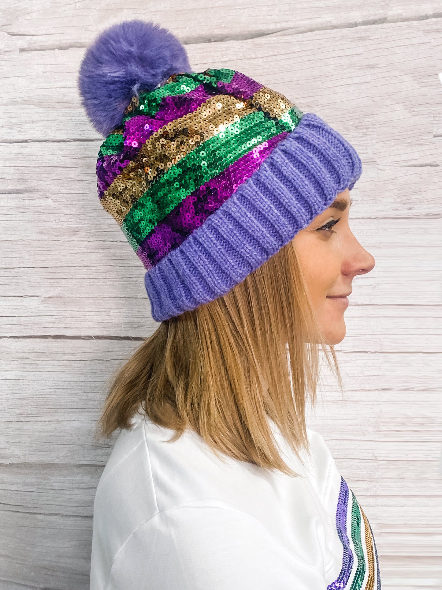 This sequin beanie is the perfect accessory for a cold Mardi Gras. Featuring a classic striped design, colorful pom pom and purple, green and gold sequins, it's a look that will turn heads. Keep warm and look great!