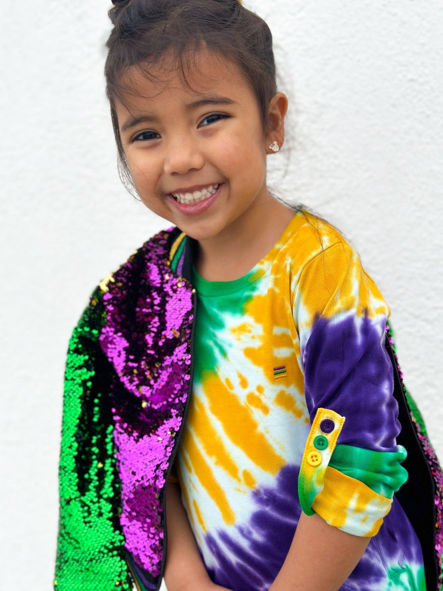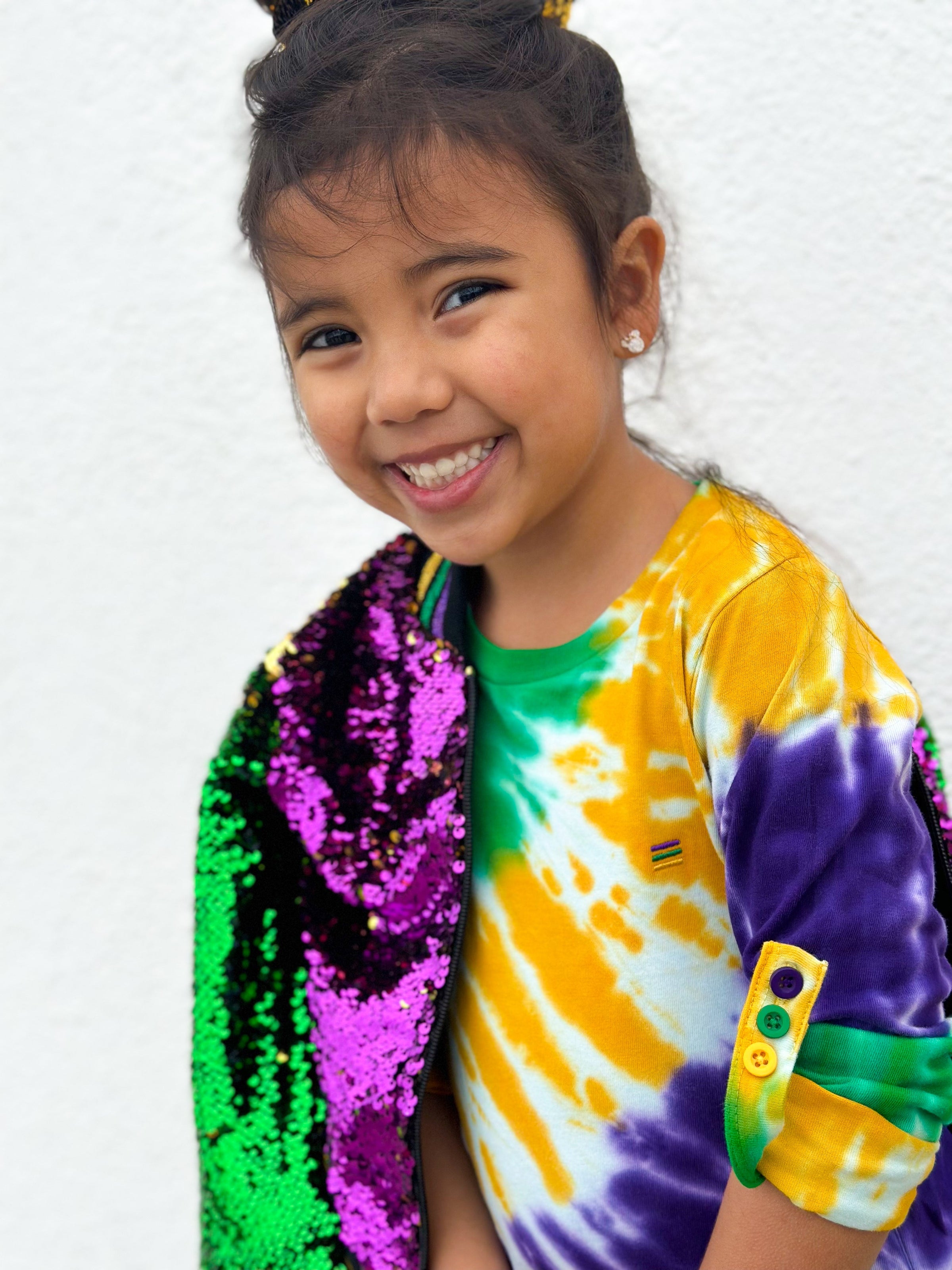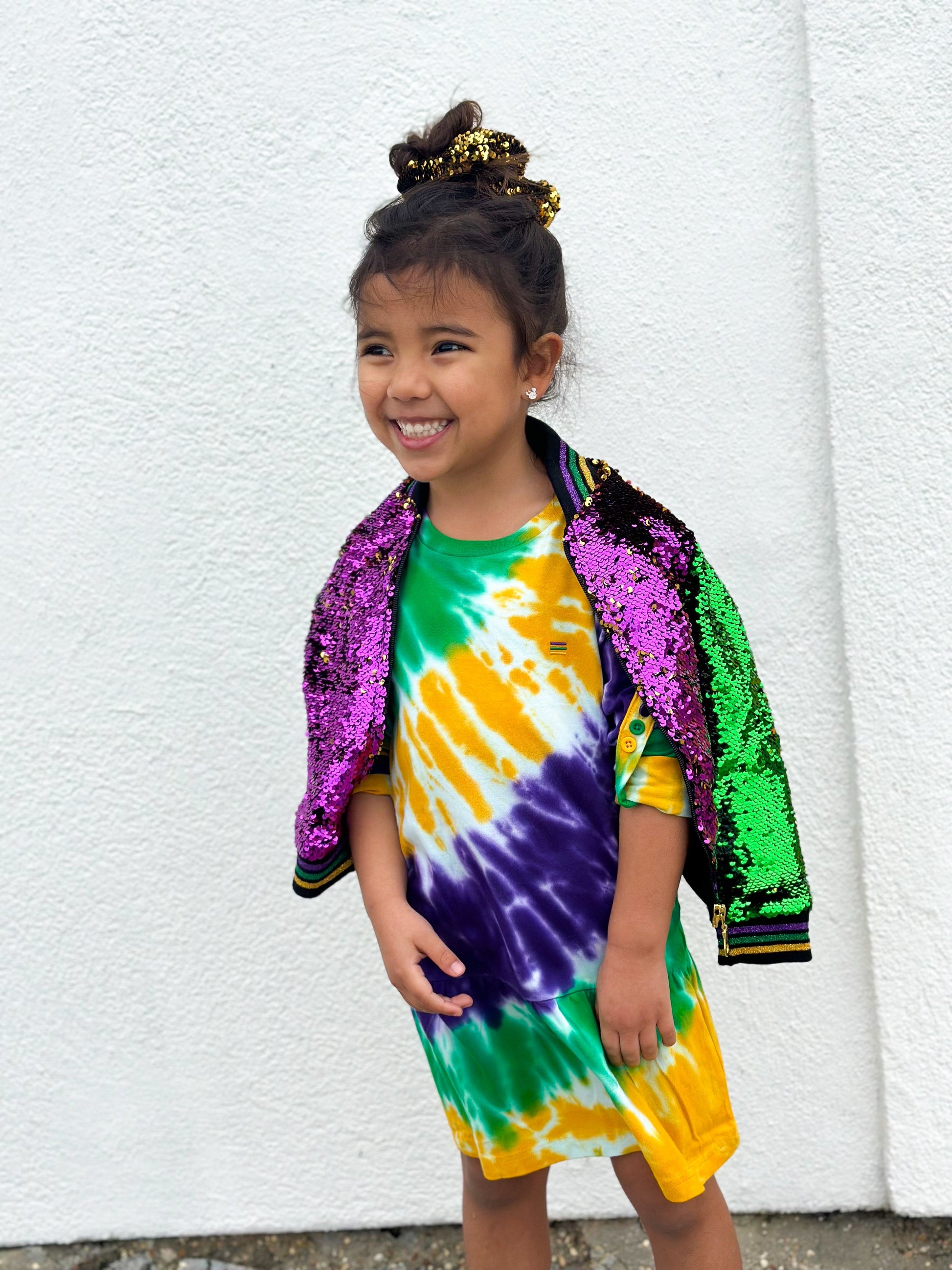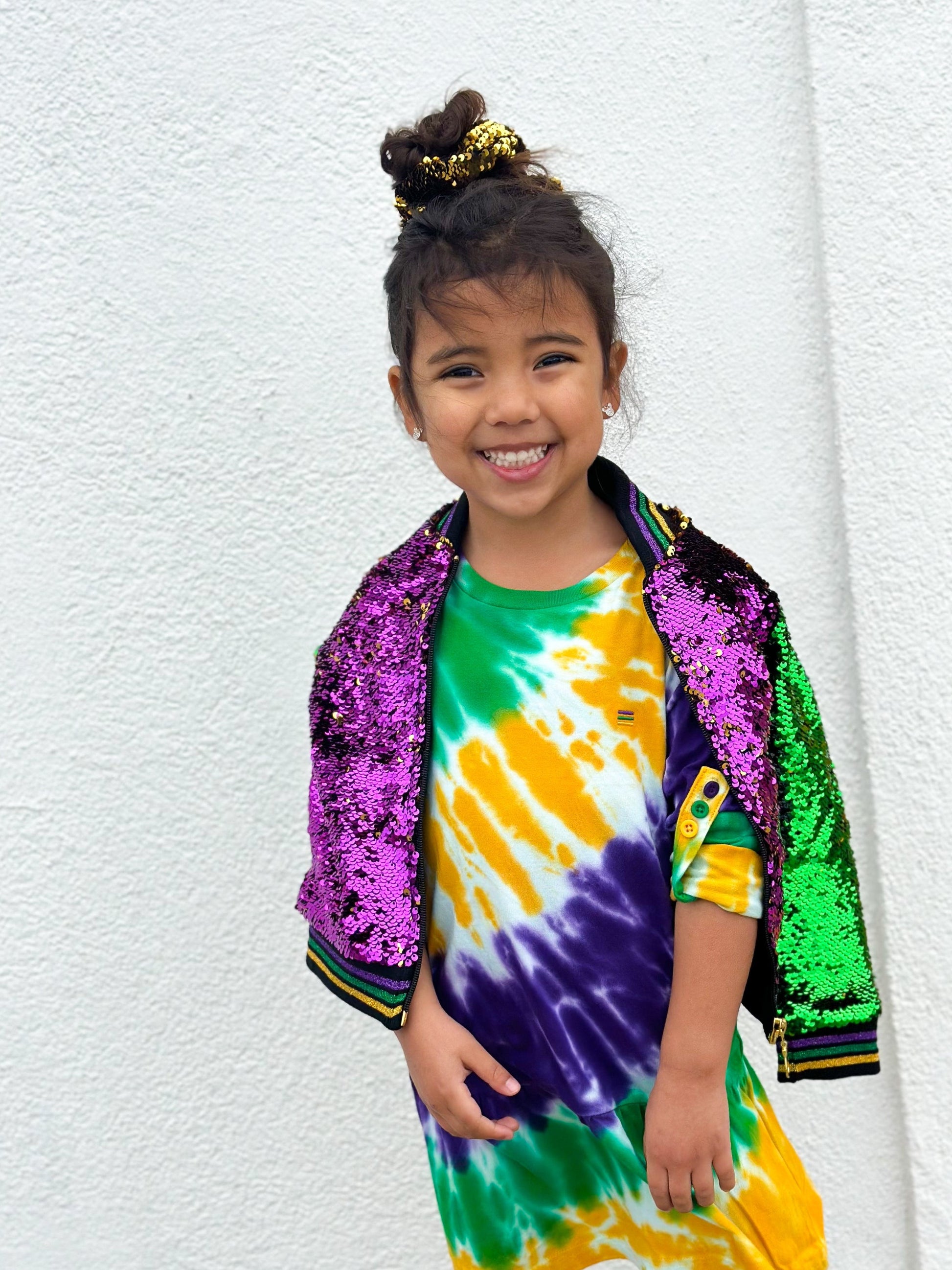 Dazzle the streets in true Carnival style with this sequin jacket for your little one! Featuring a purple, green, and gold colorblock design inspired by Mardi Gras, your child will stay warm while looking too cute! The perfect way to match your littles!