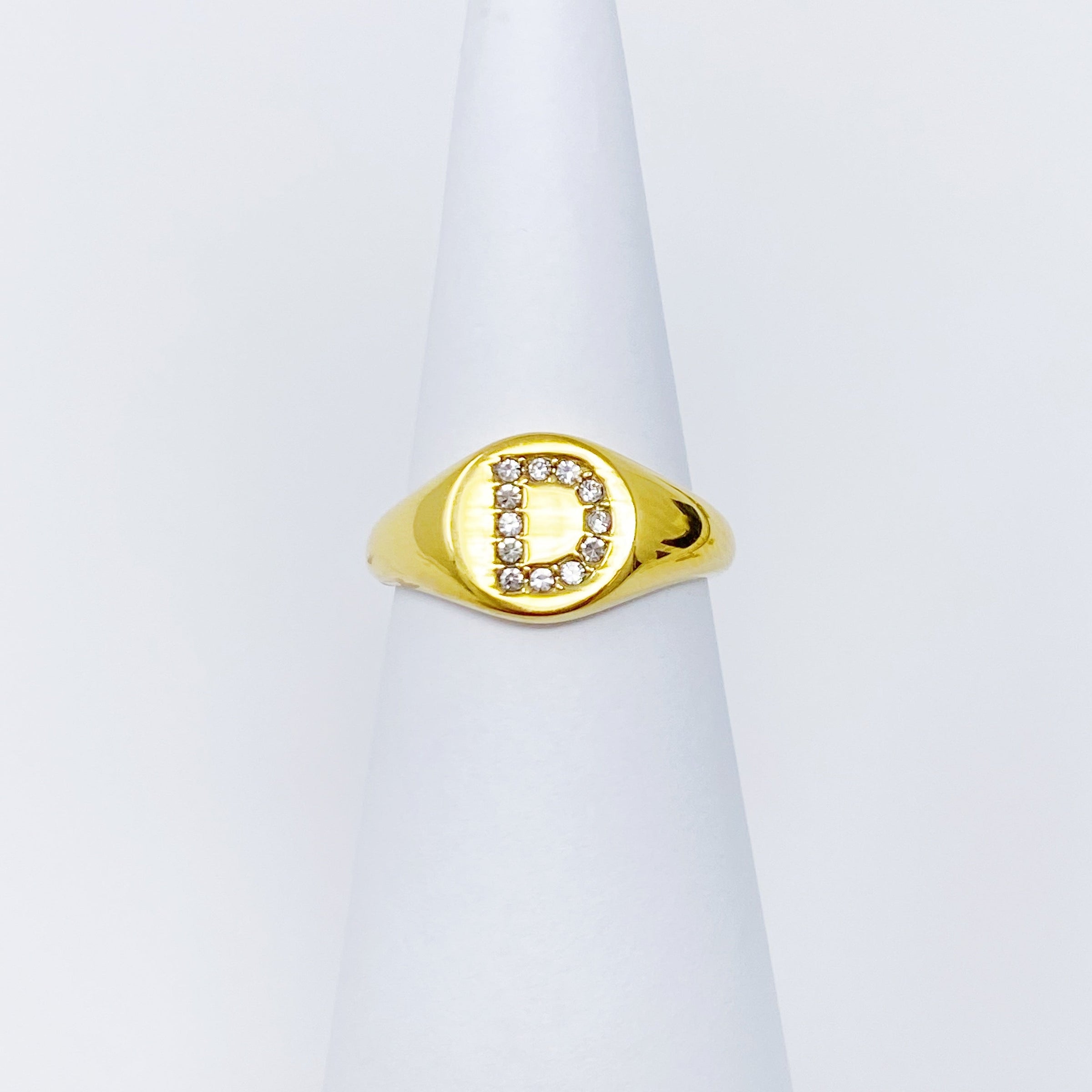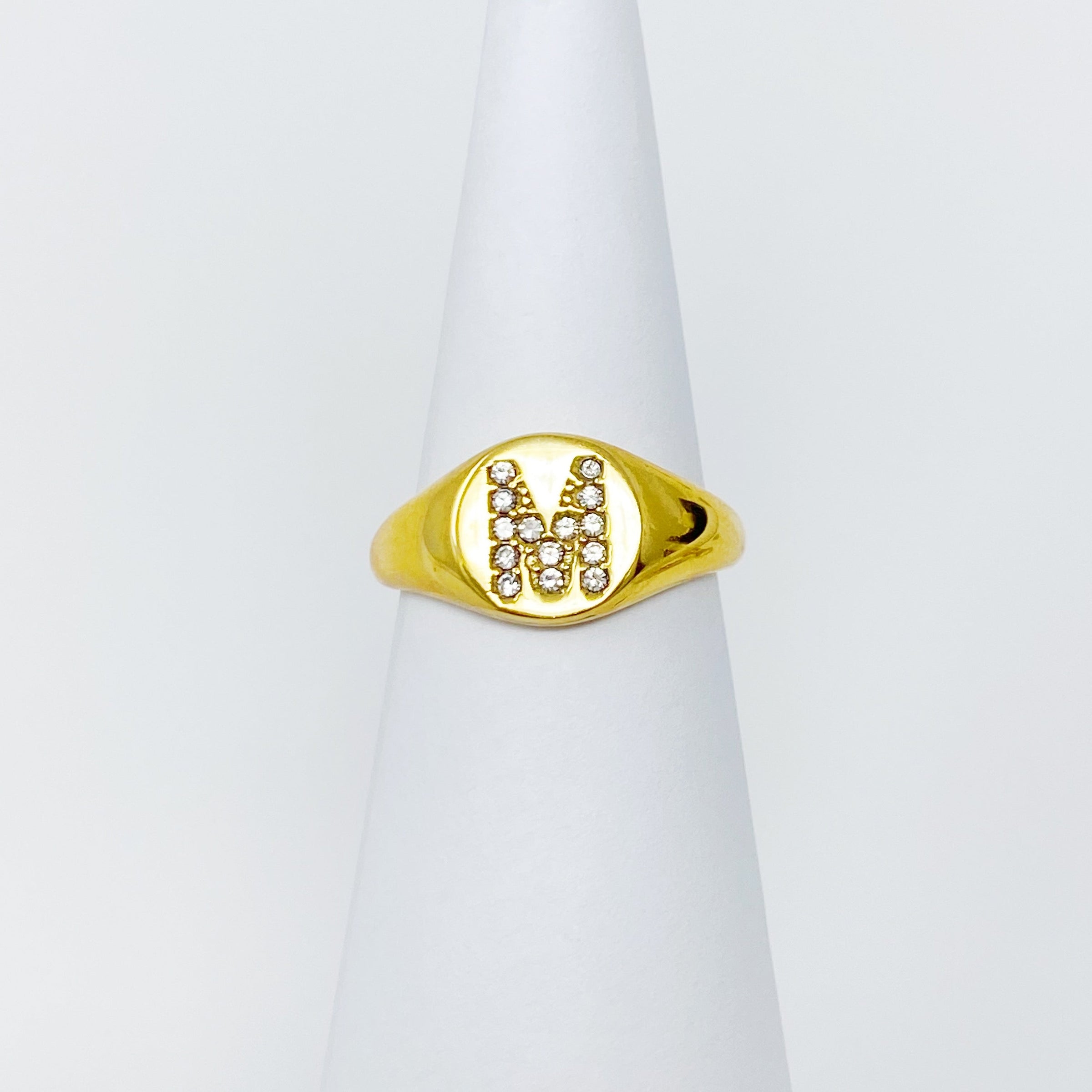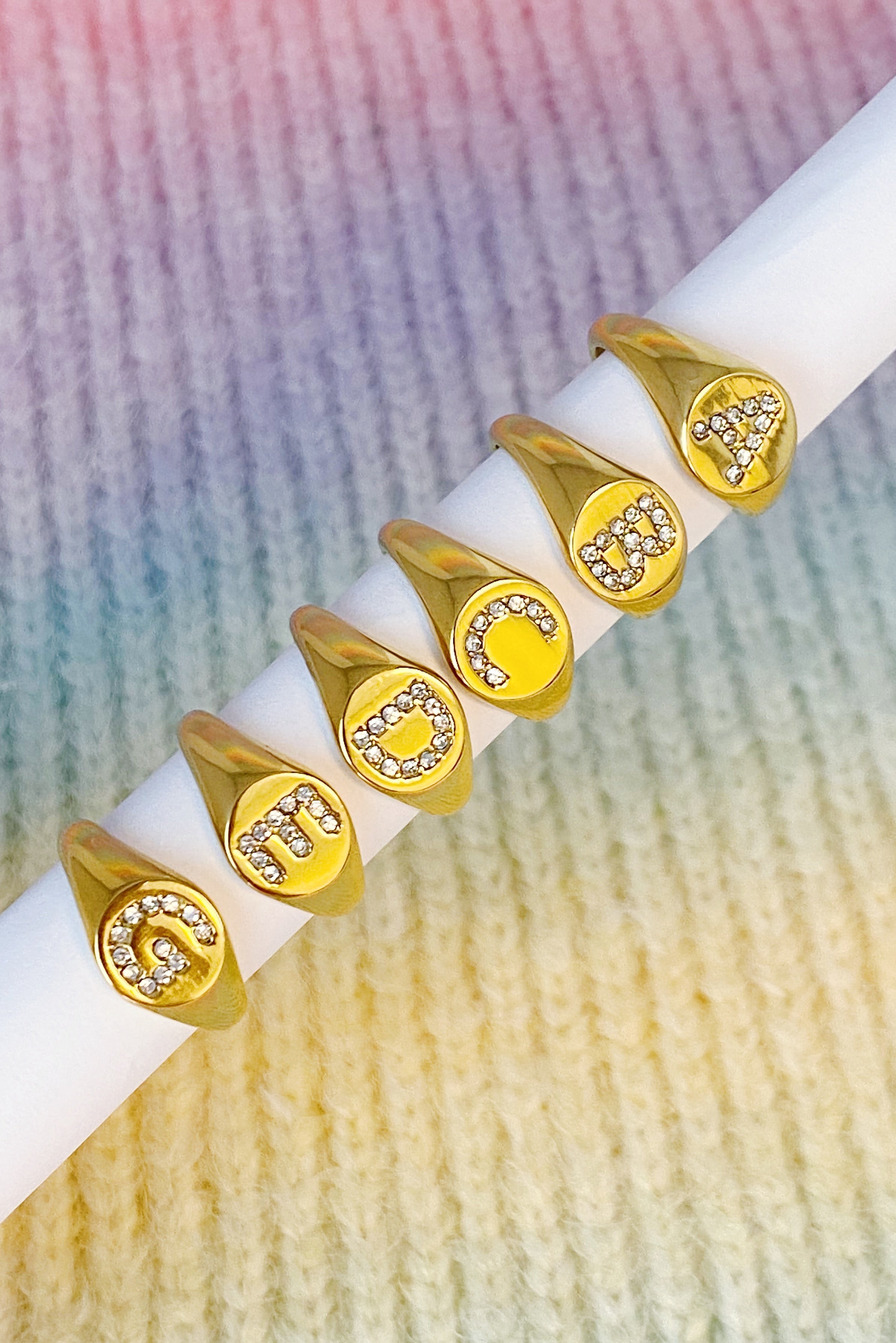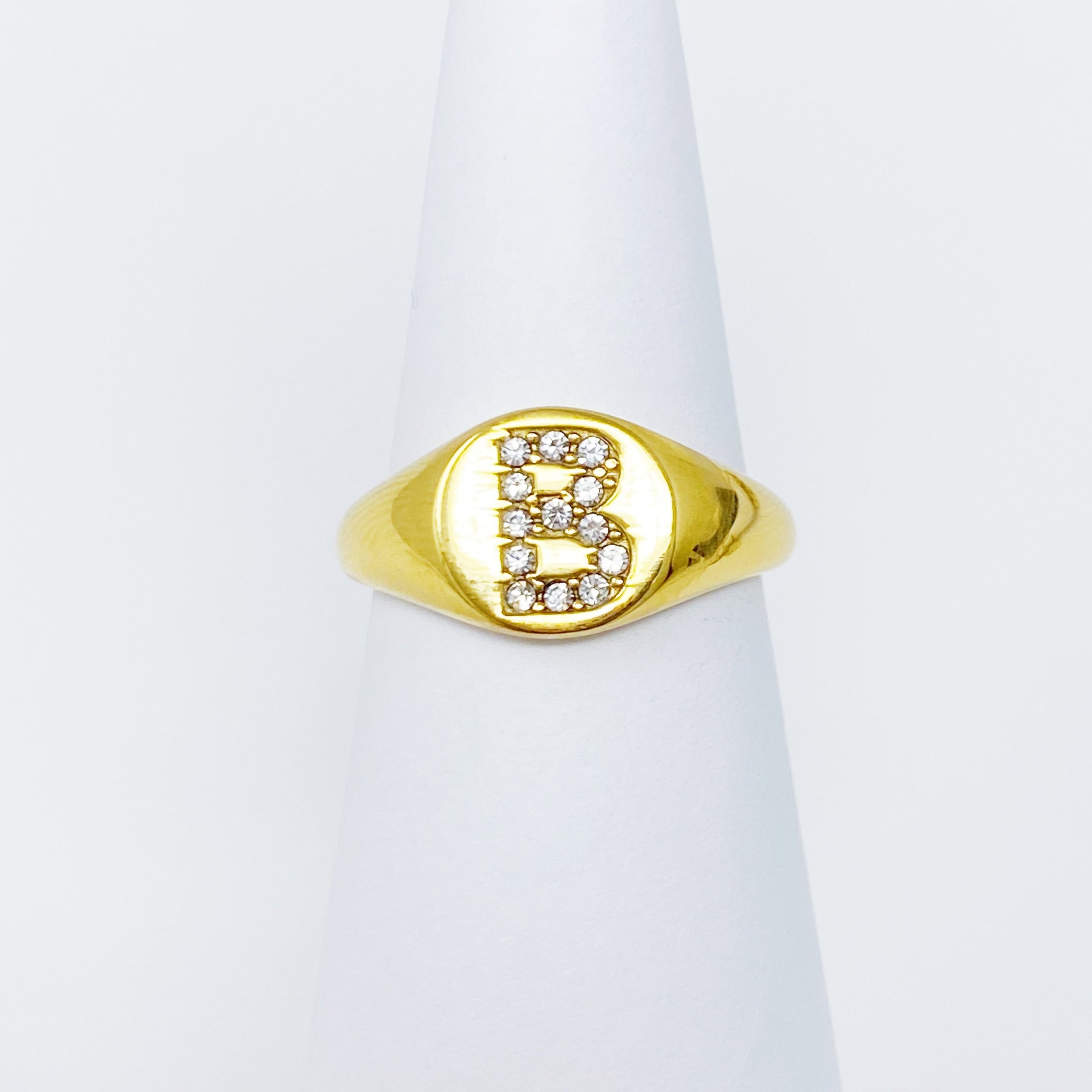 In style bold golden ring with initial paved with shiny stones. Popular 15 initials available