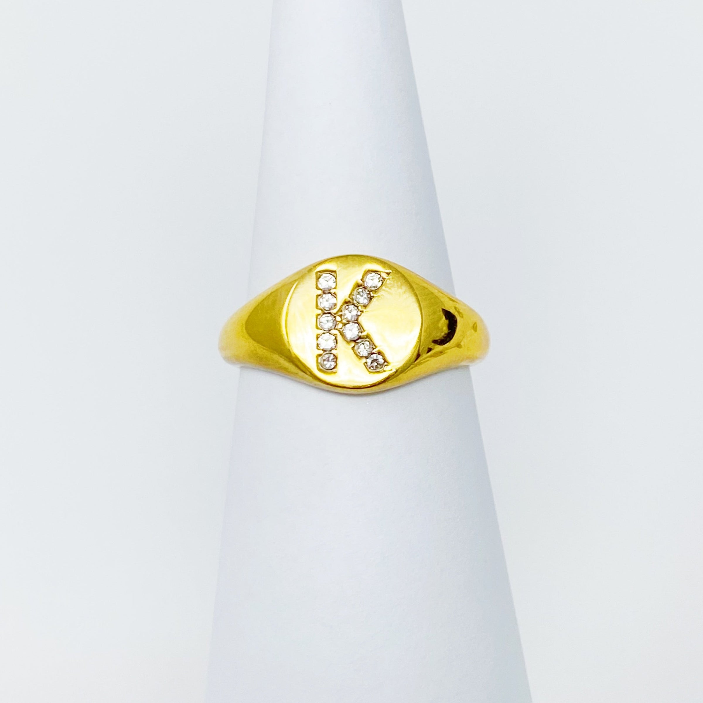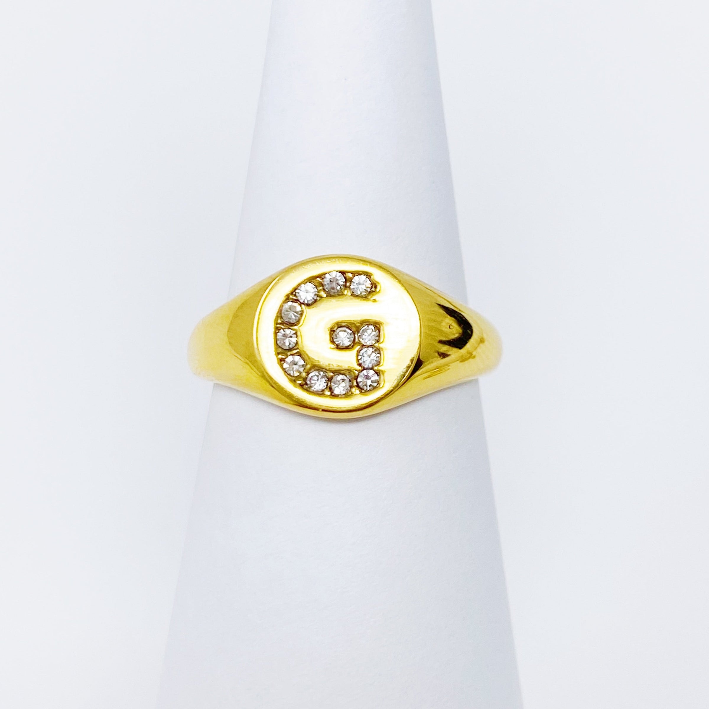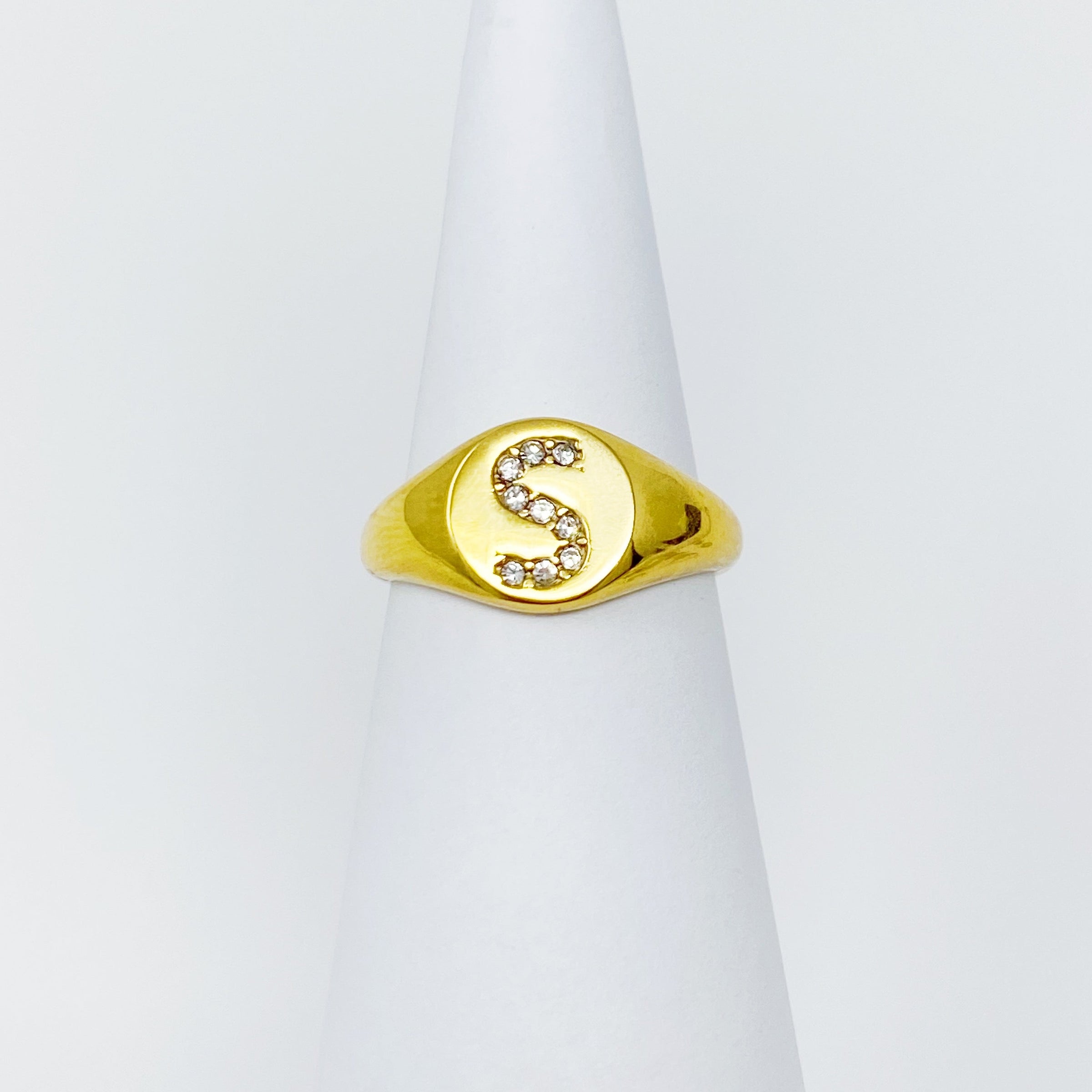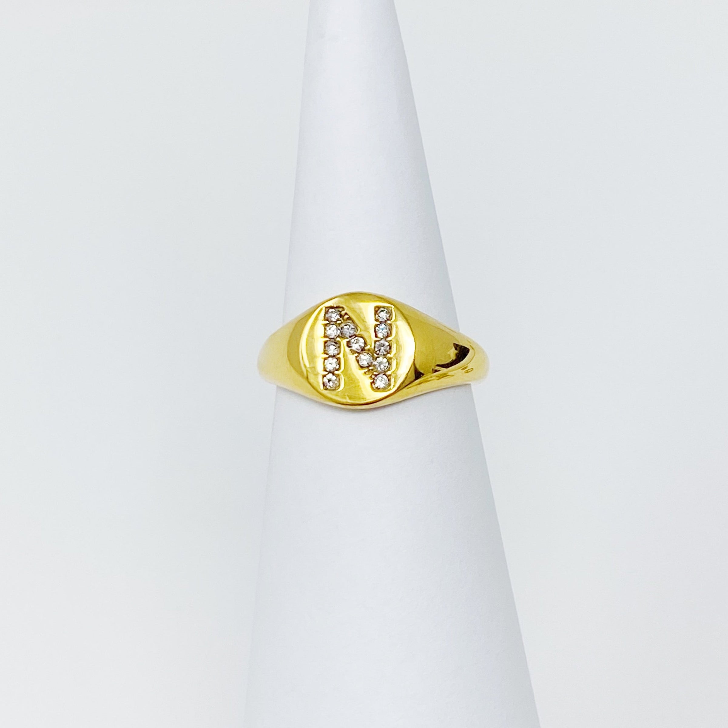 In style bold golden ring with initial paved with shiny stones. Popular 15 initials available