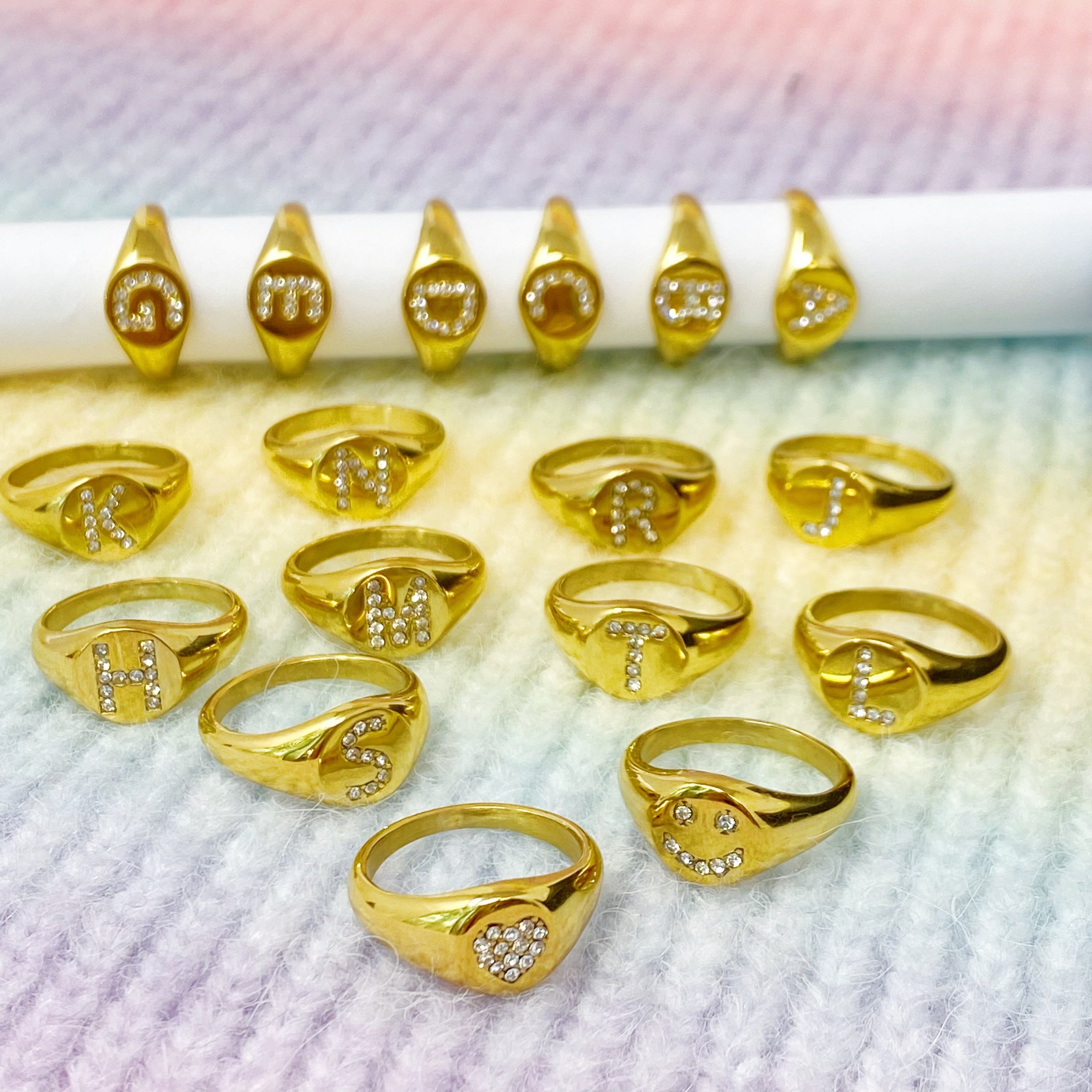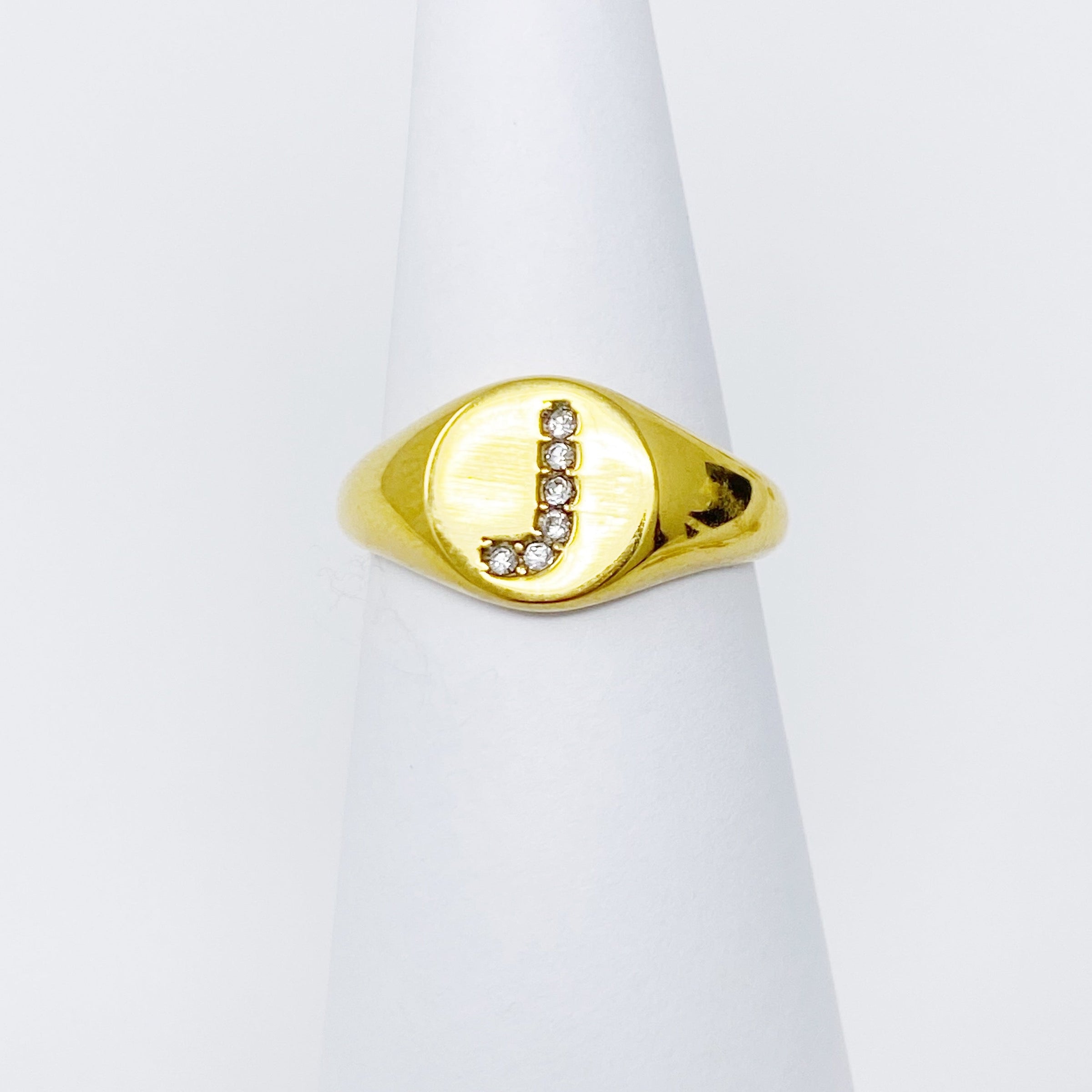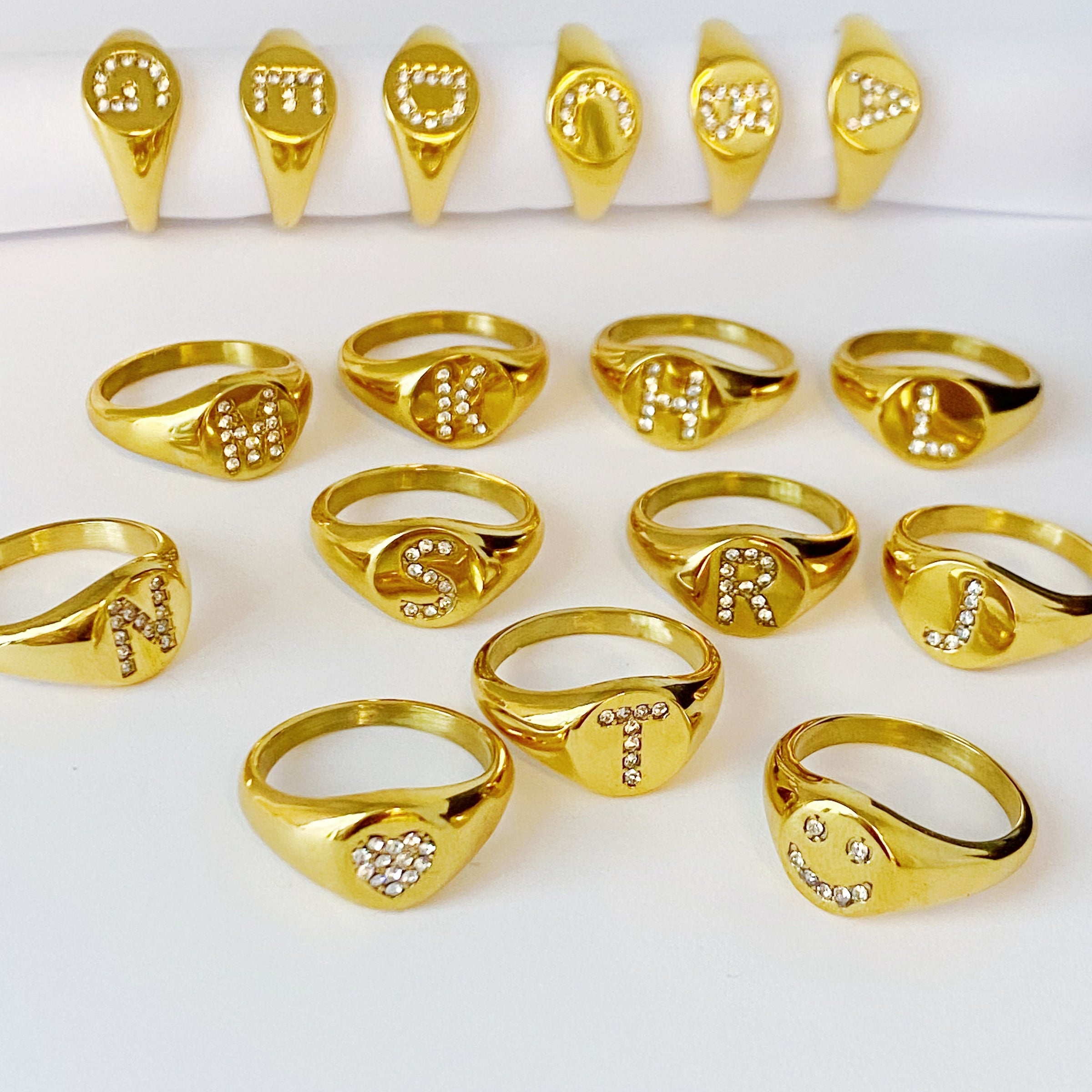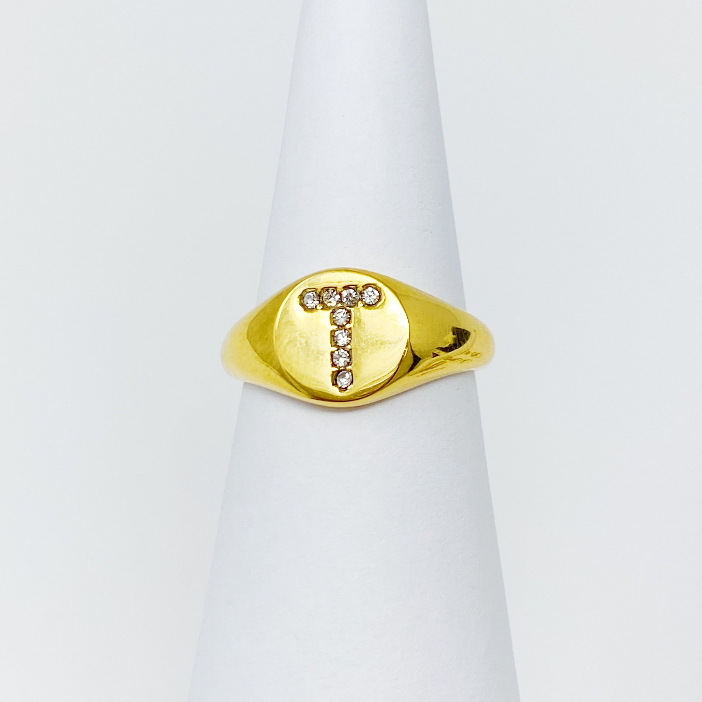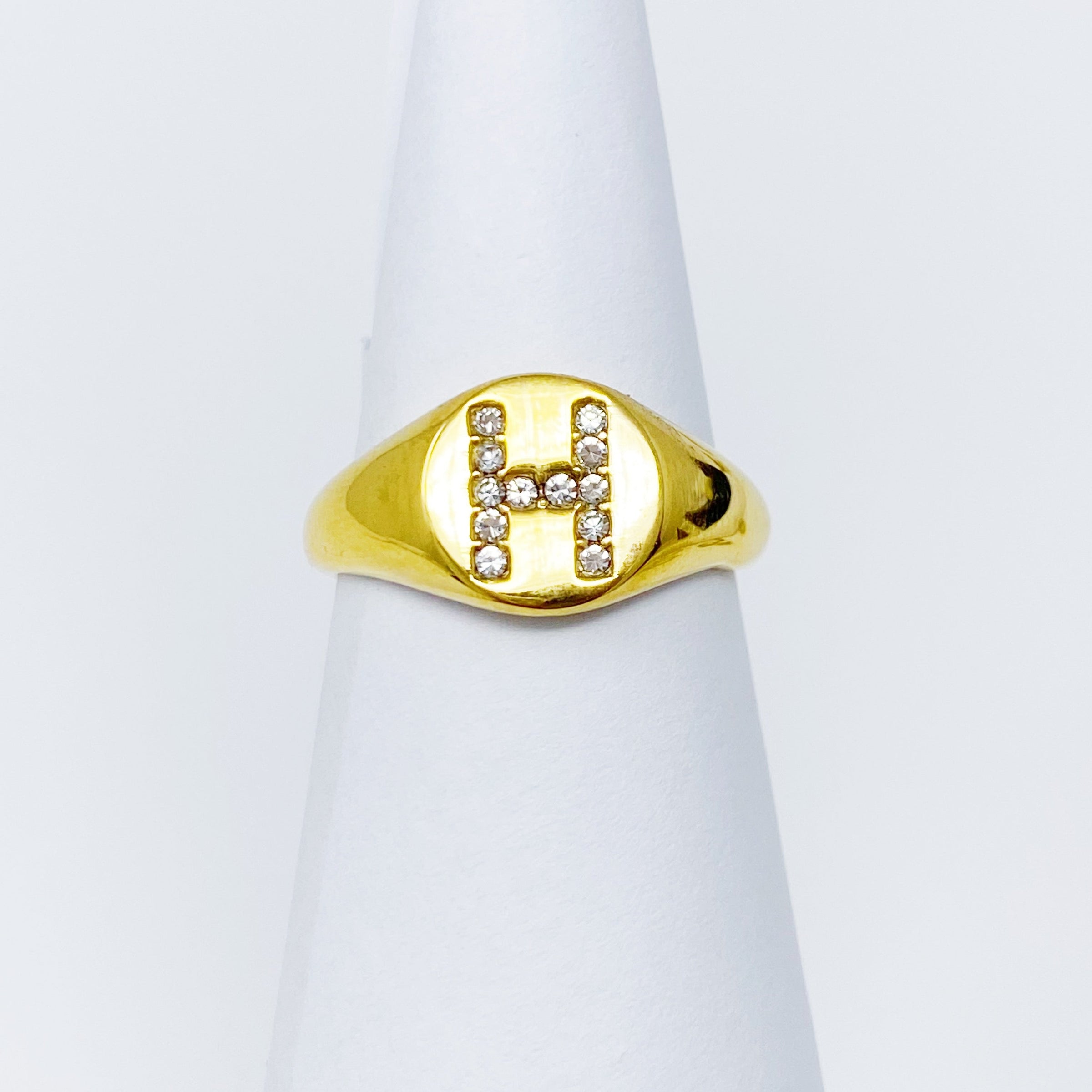 In style bold golden ring with initial paved with shiny stones. Popular 15 initials available