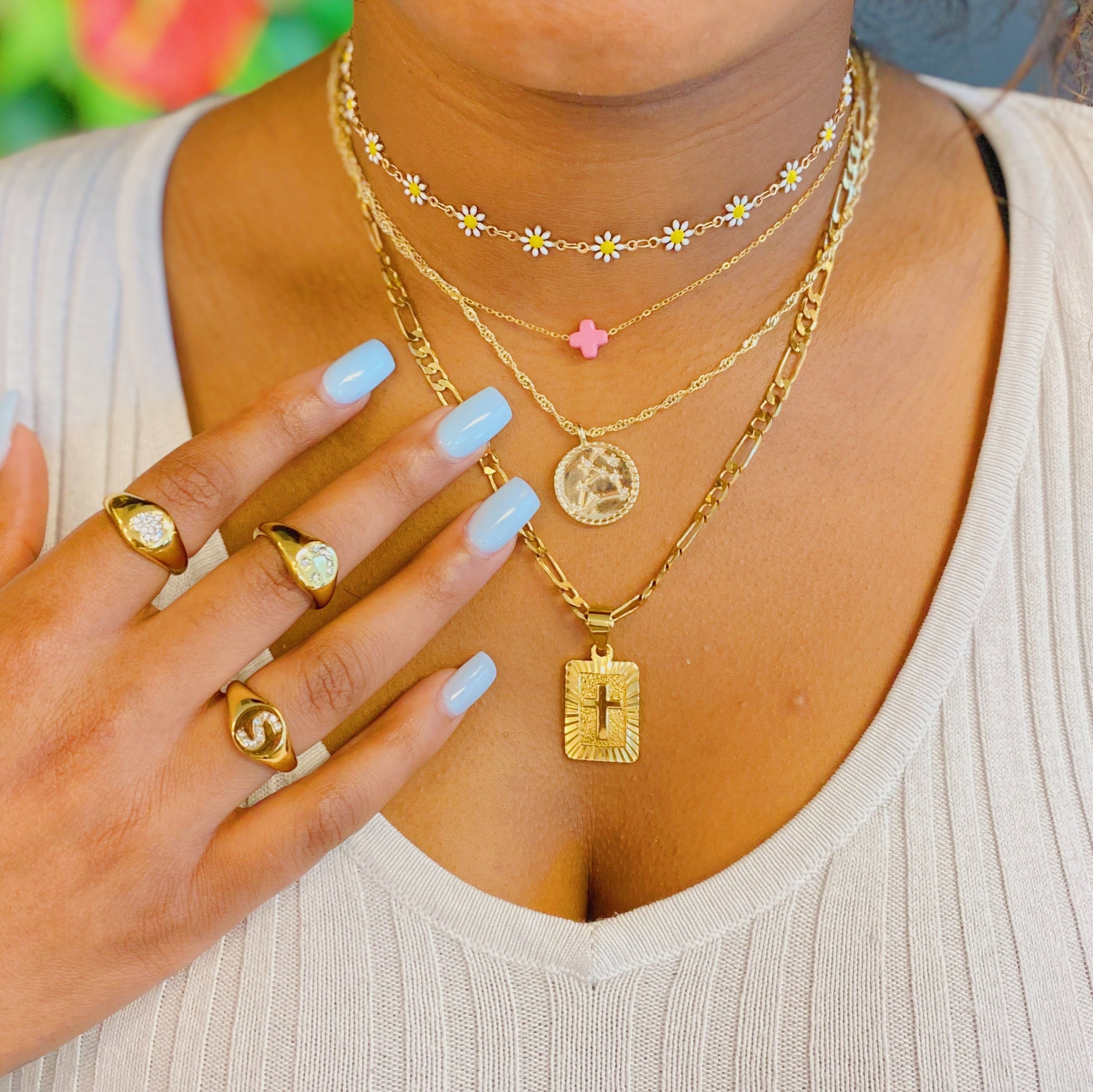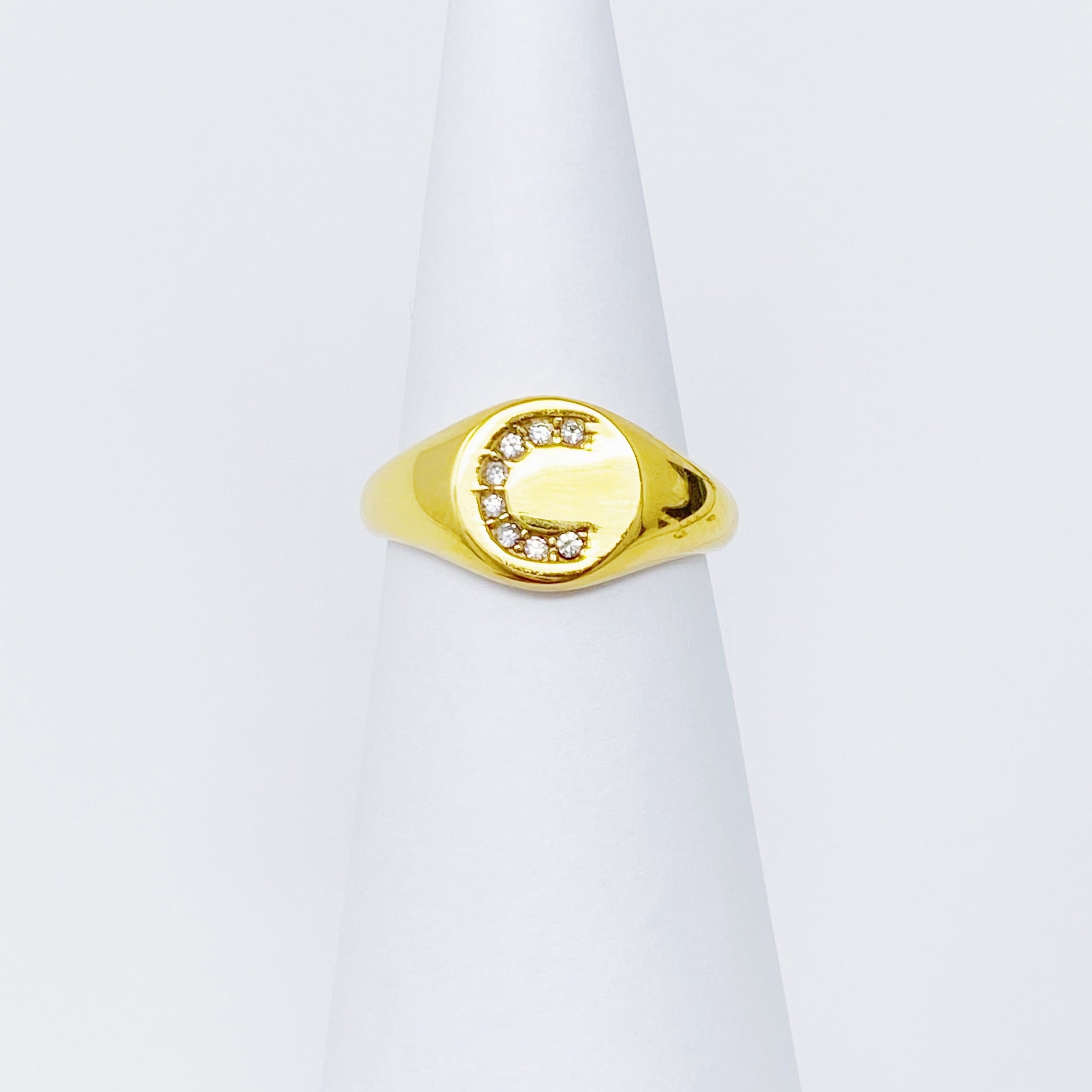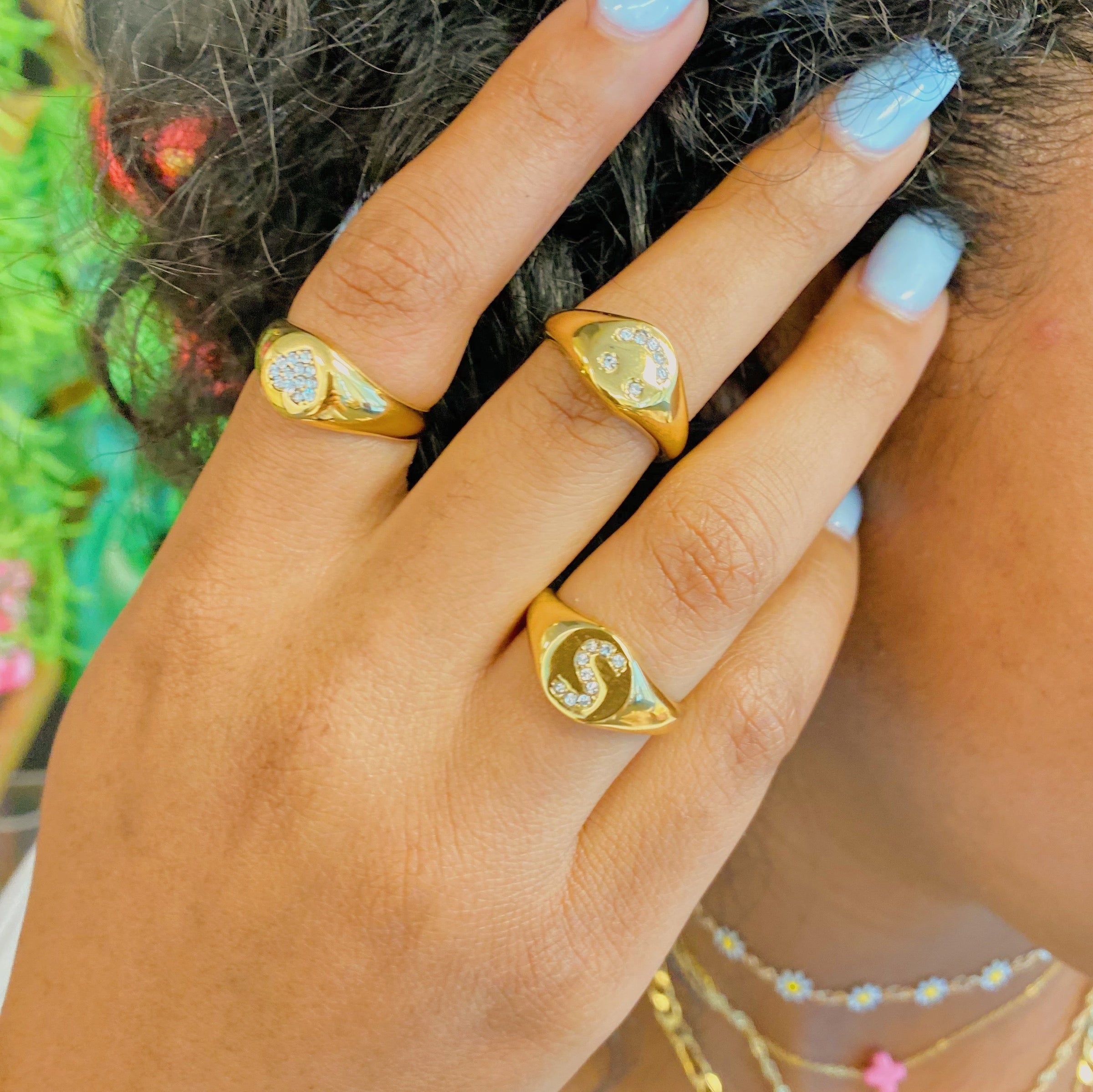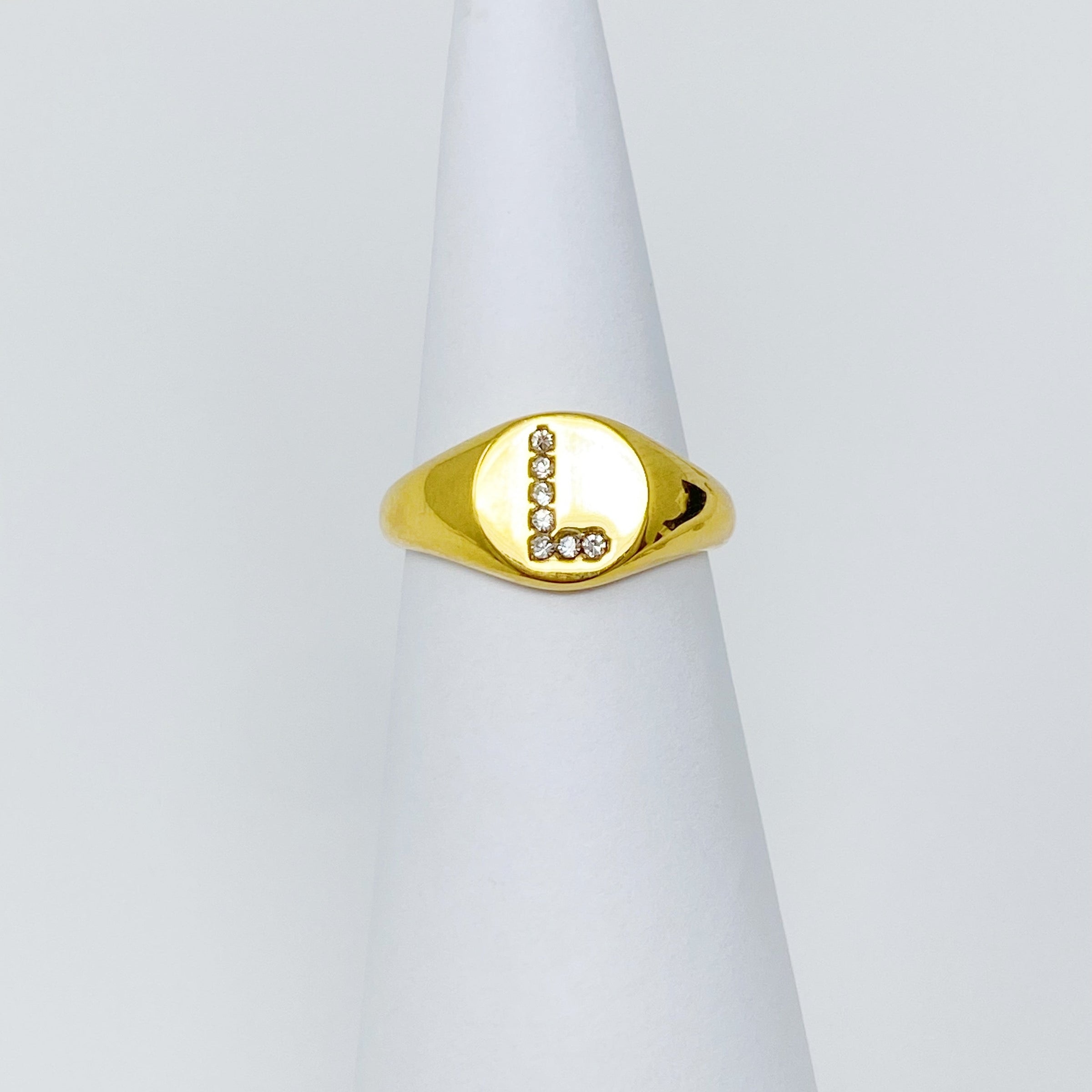 In style bold golden ring with initial paved with shiny stones. Popular 15 initials available