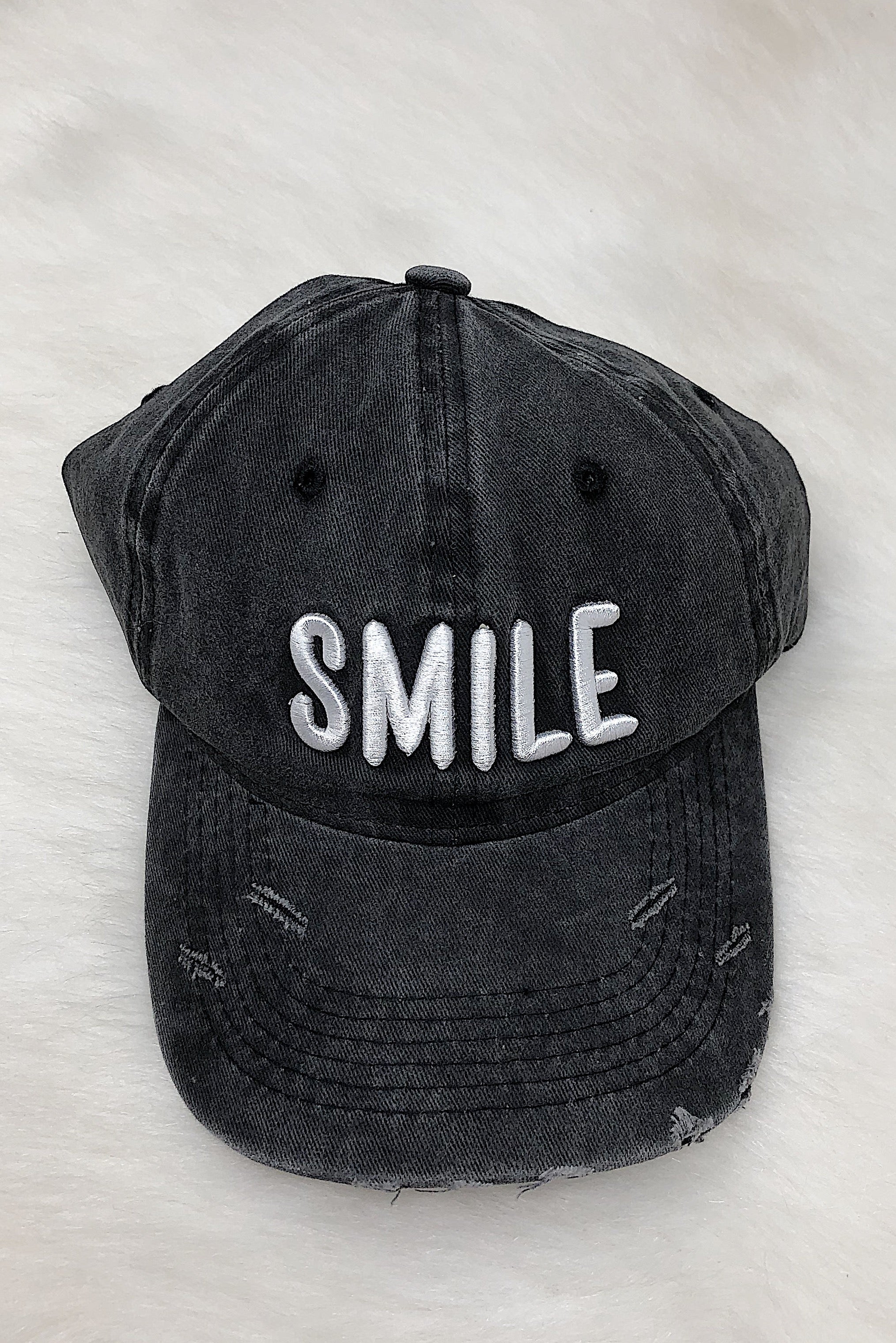 Let's smile and be happy with the cutest "SMILE" hat. Neutral dark gray distressed baseball cap with white embroidery on the front. Features a curved bill and is finished with an adjustable strap at the back. This hat is perfect for summer!