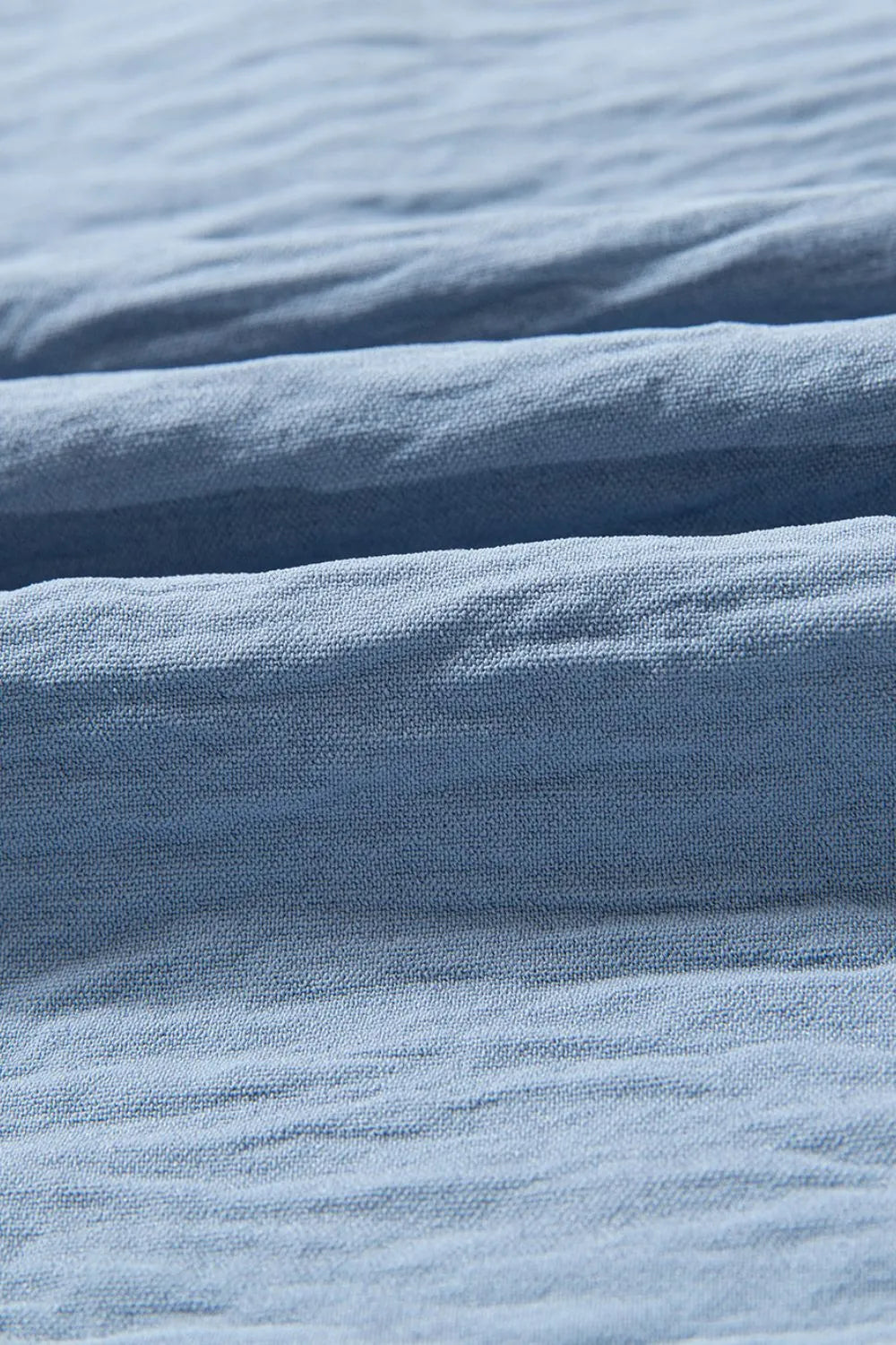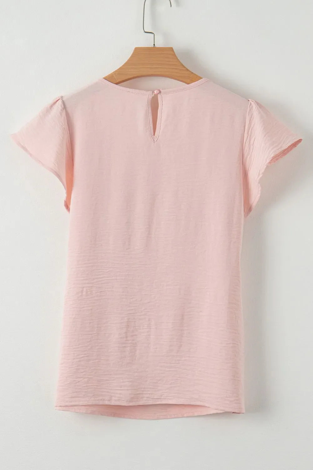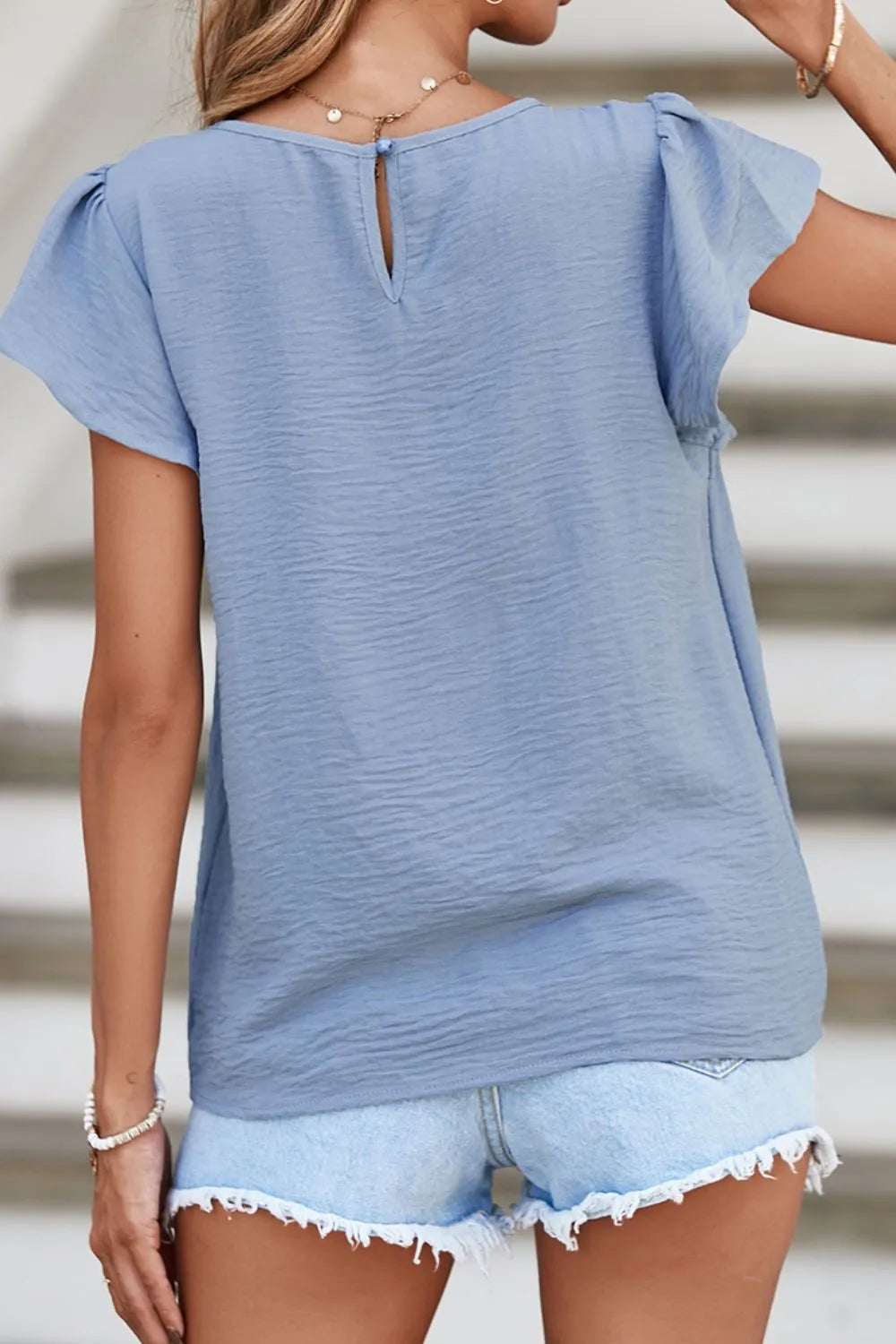 Solid Color Flounce Sleeve Pleated Round Neck Blouse