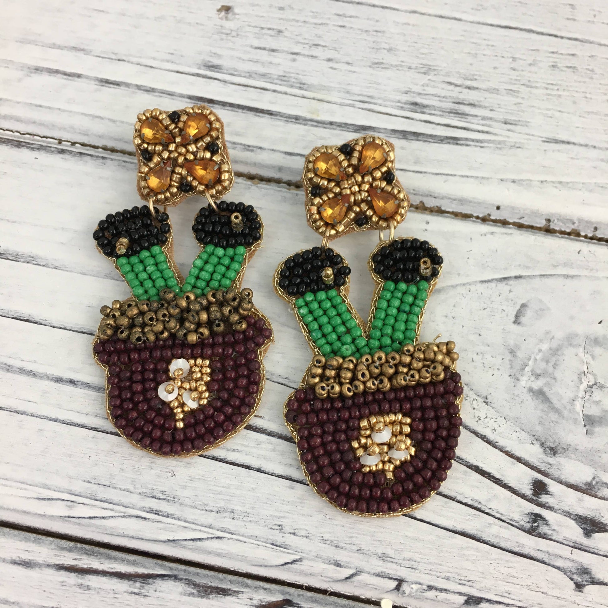 These fun little earrings are pots of gold with leprechaun feet sticking out of them. Celebrate St. Patrick's day with these adorable beaded earrings!