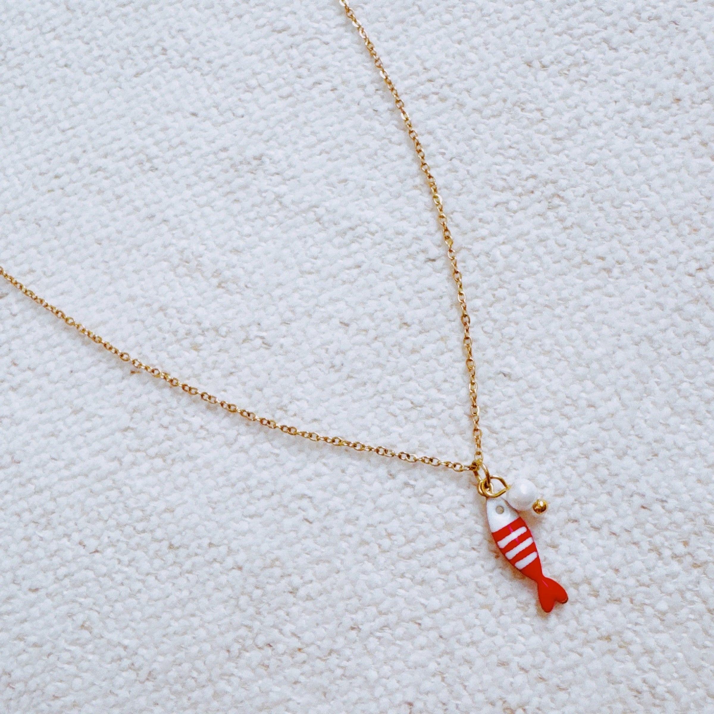 Make a splash with the Red Striped Fish & Pearl Necklace. Featuring a charming red striped fish pendant paired with a lovely pearl accent, this necklace brings a fun, nautical vibe to any outfit.