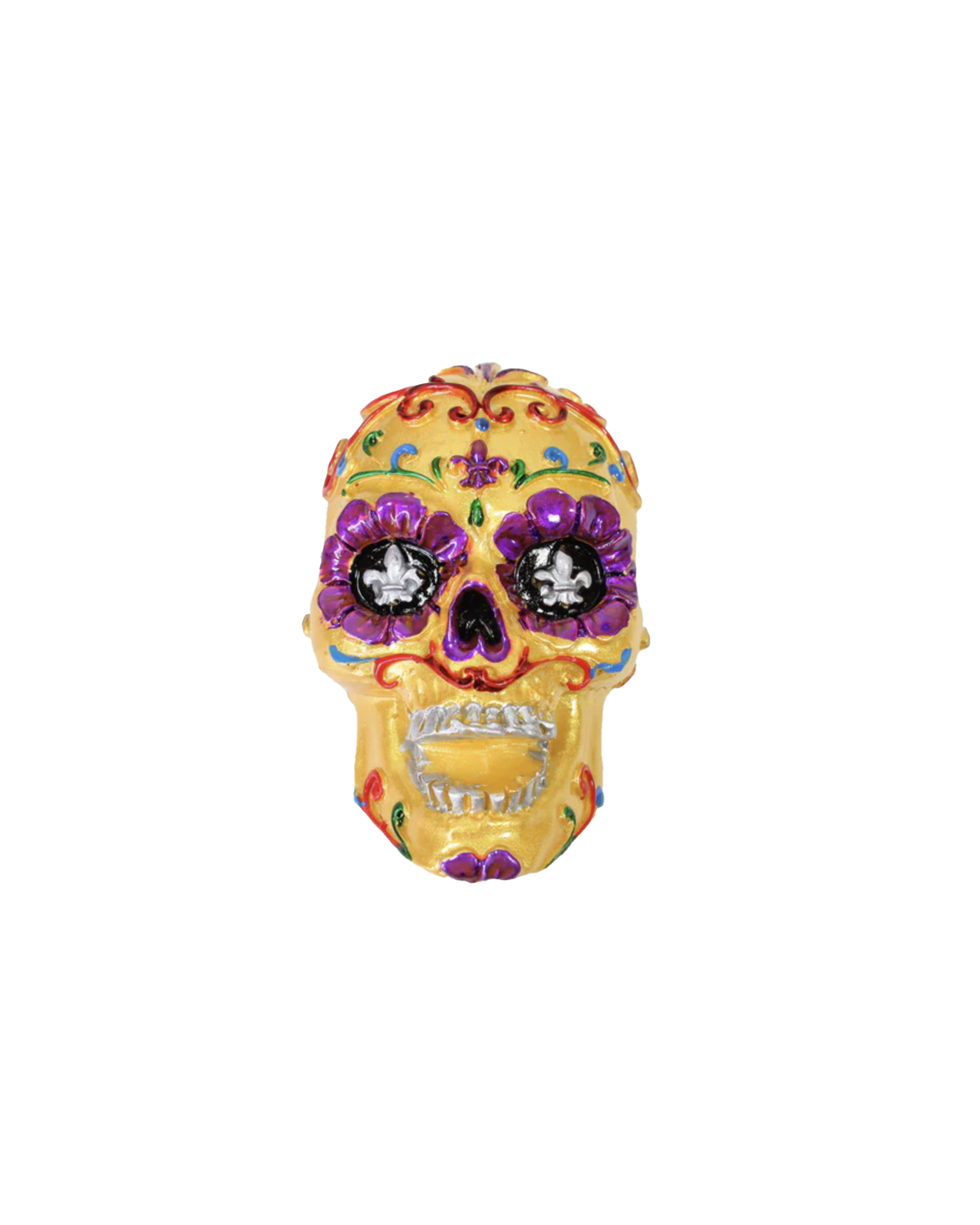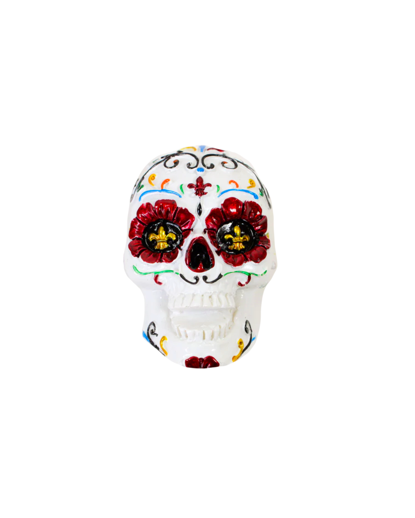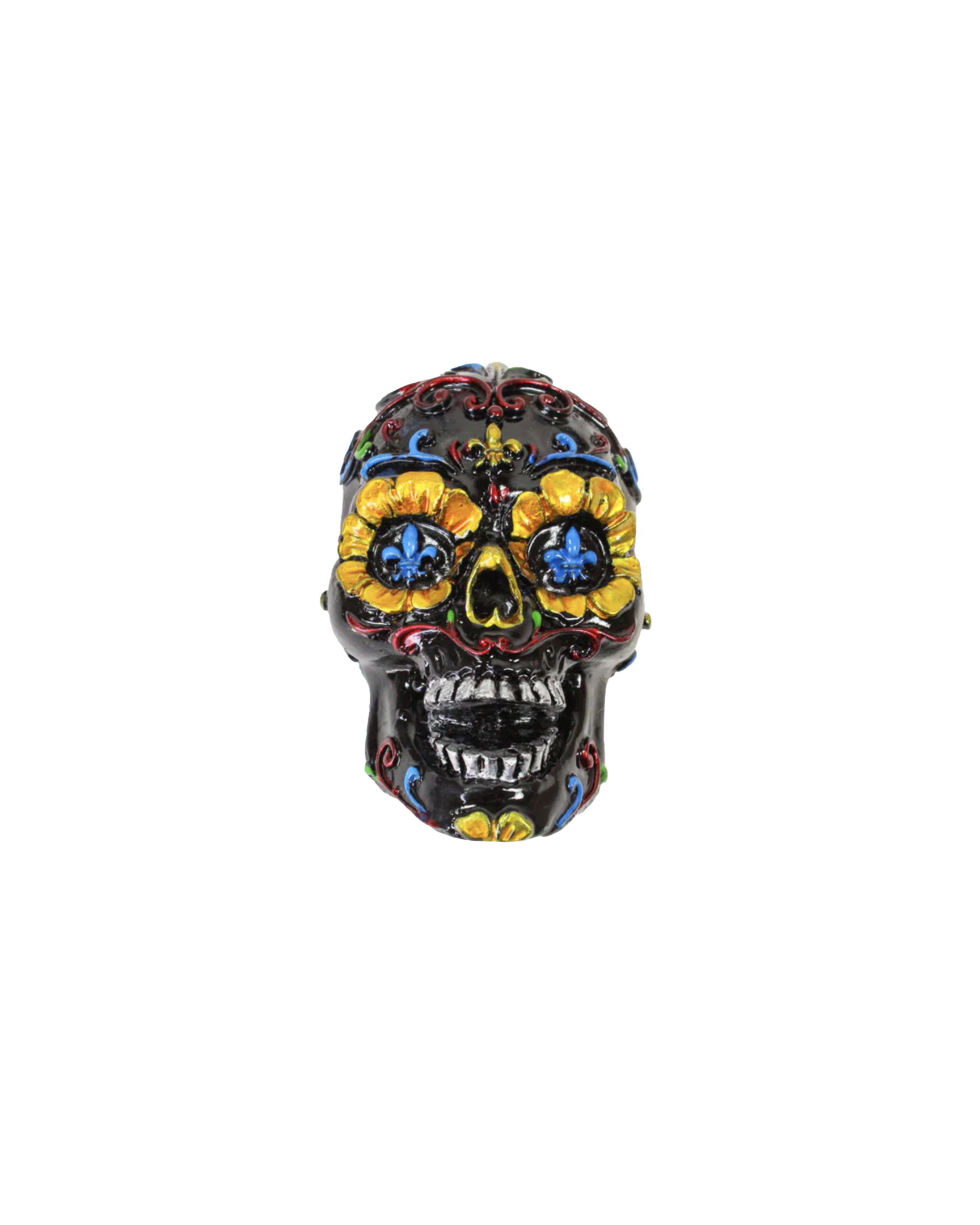 This sugar skull/day of the dead magnet has a beautiful and colorful pattern with Fleur de Lis for the eyes.