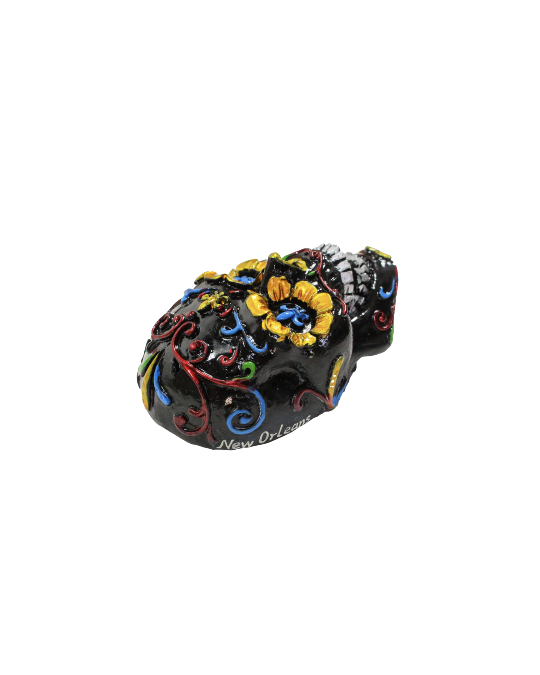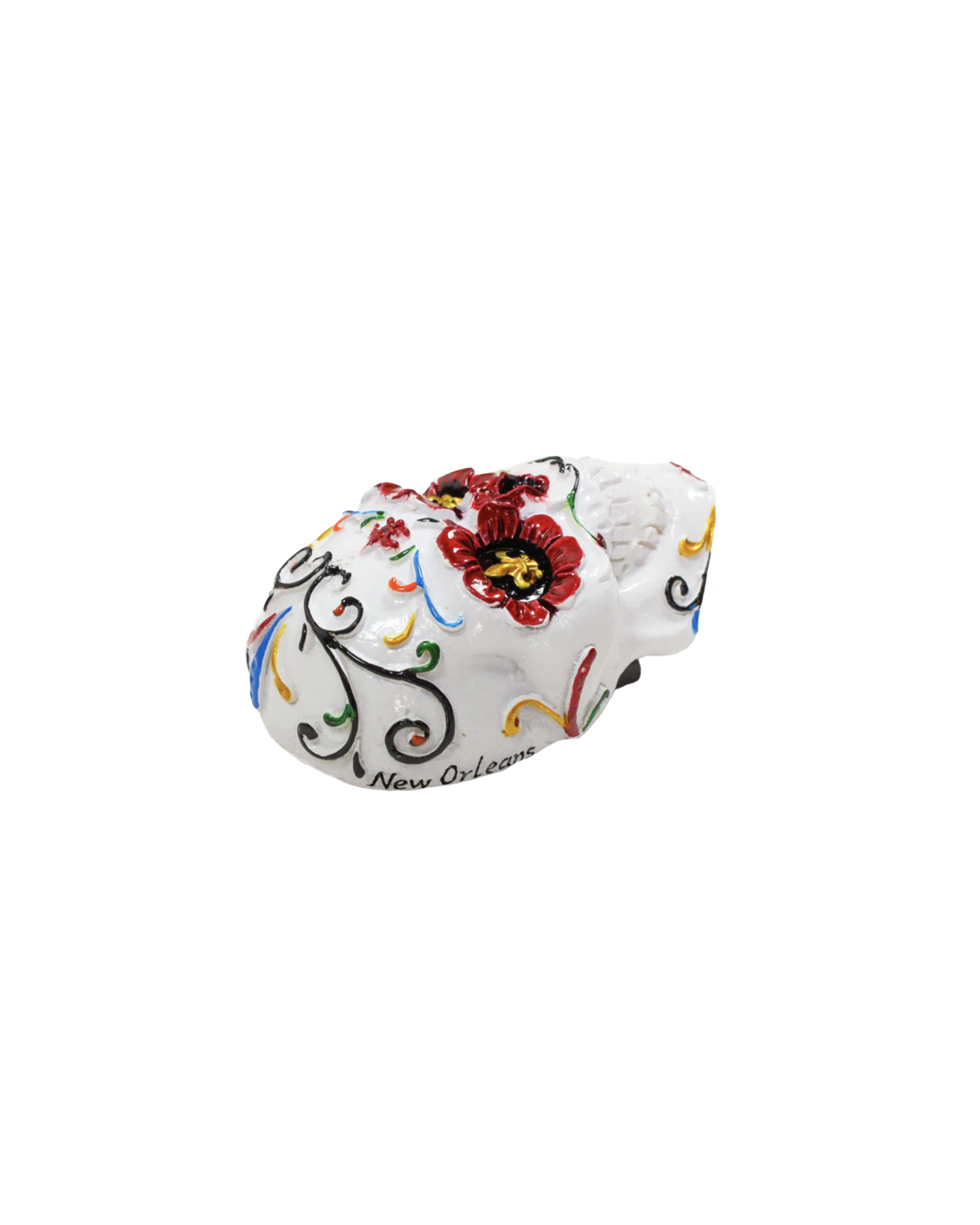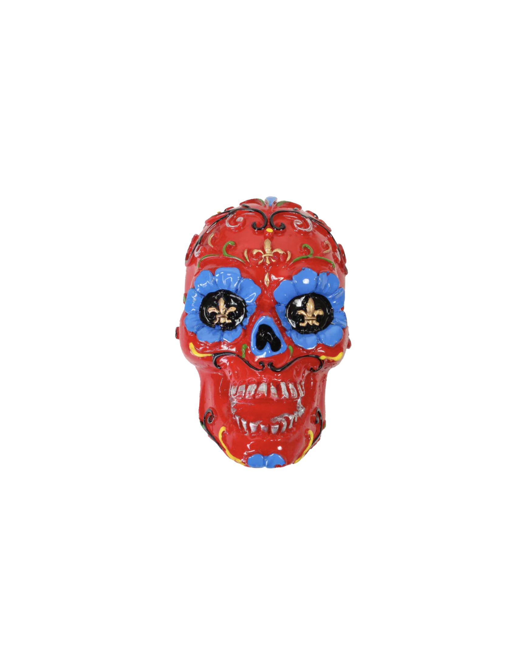 This sugar skull/day of the dead magnet has a beautiful and colorful pattern with Fleur de Lis for the eyes.