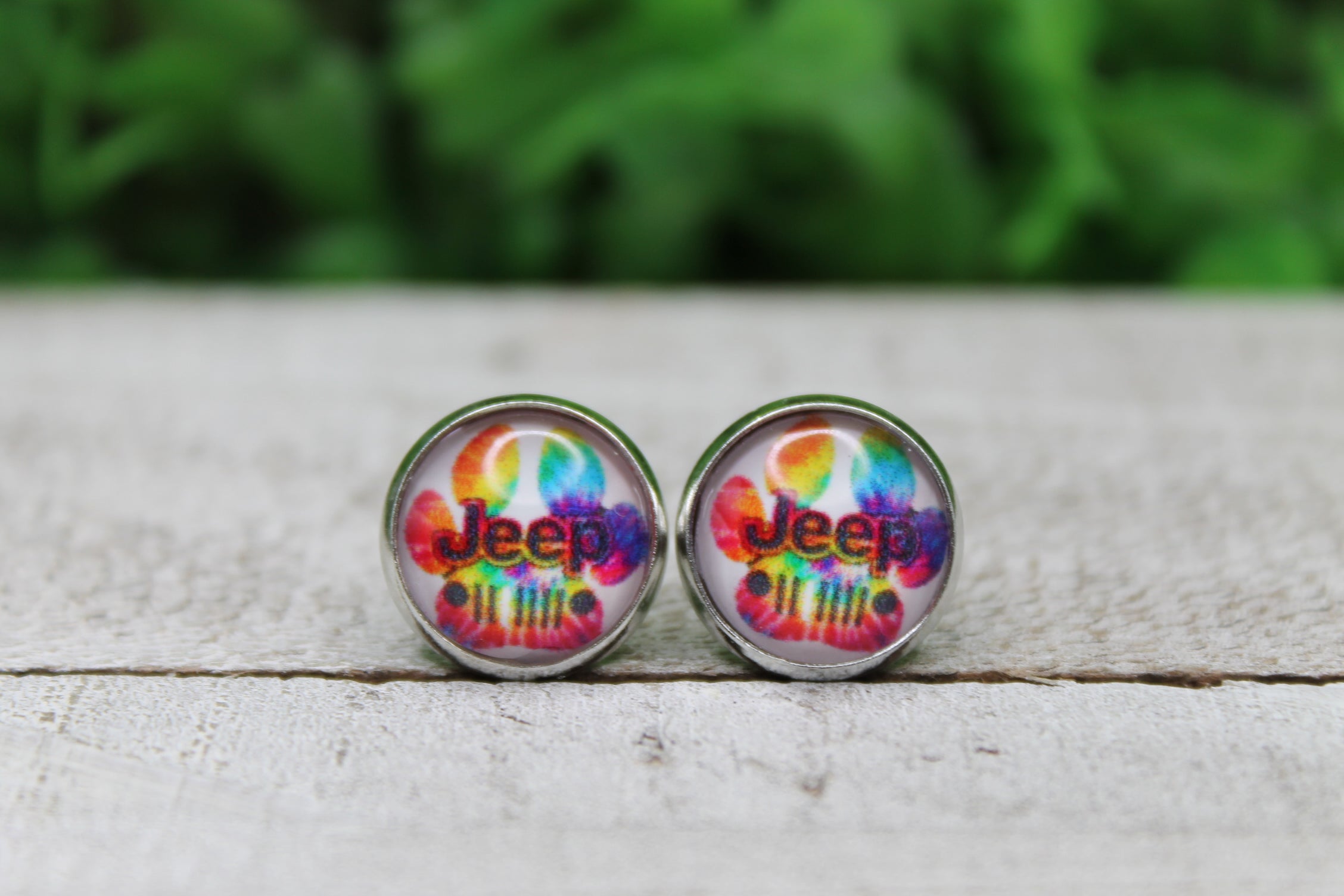 Tie Dye Paw Print Jeep 12mm Glass Stud Earrings || Hypoallergenic