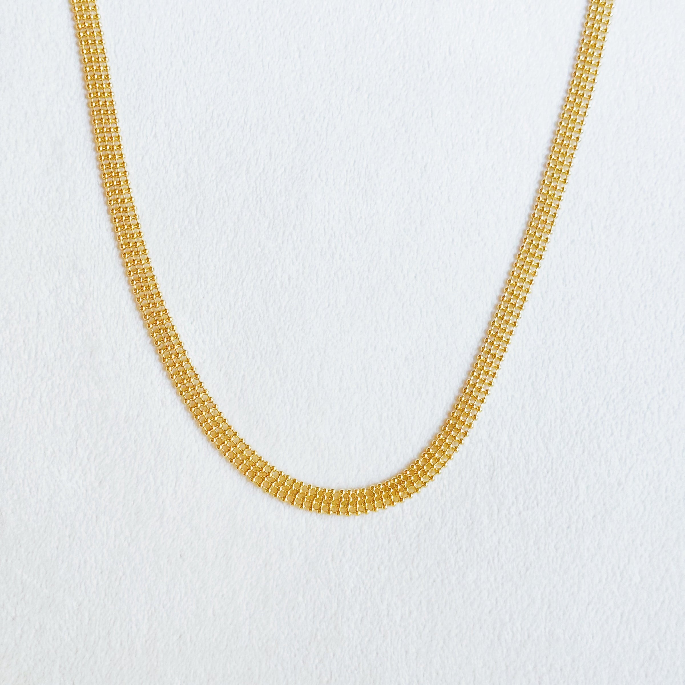 This layered gold bead choker necklace features velvety sash ties that can be worn in various ways, such as around the neck, as a necklace, or in the hair. The versatile design allows for multiple styling options, perfect for any occasion. Elevate your look with this elegant and trendy accessory.