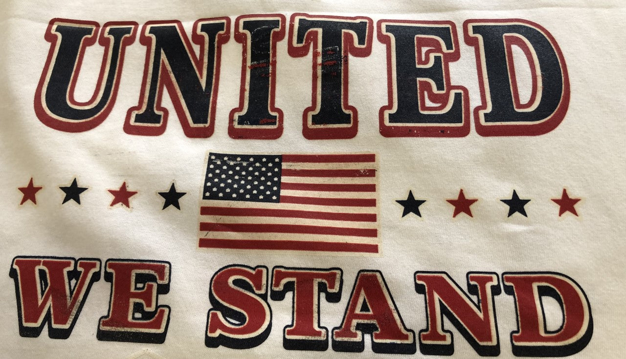 Celebrate 4th of July in style! This white t-shirt features a "United We Stand" design in red white, and blue with an American flag.