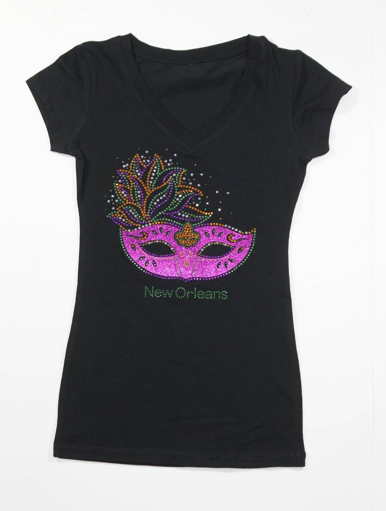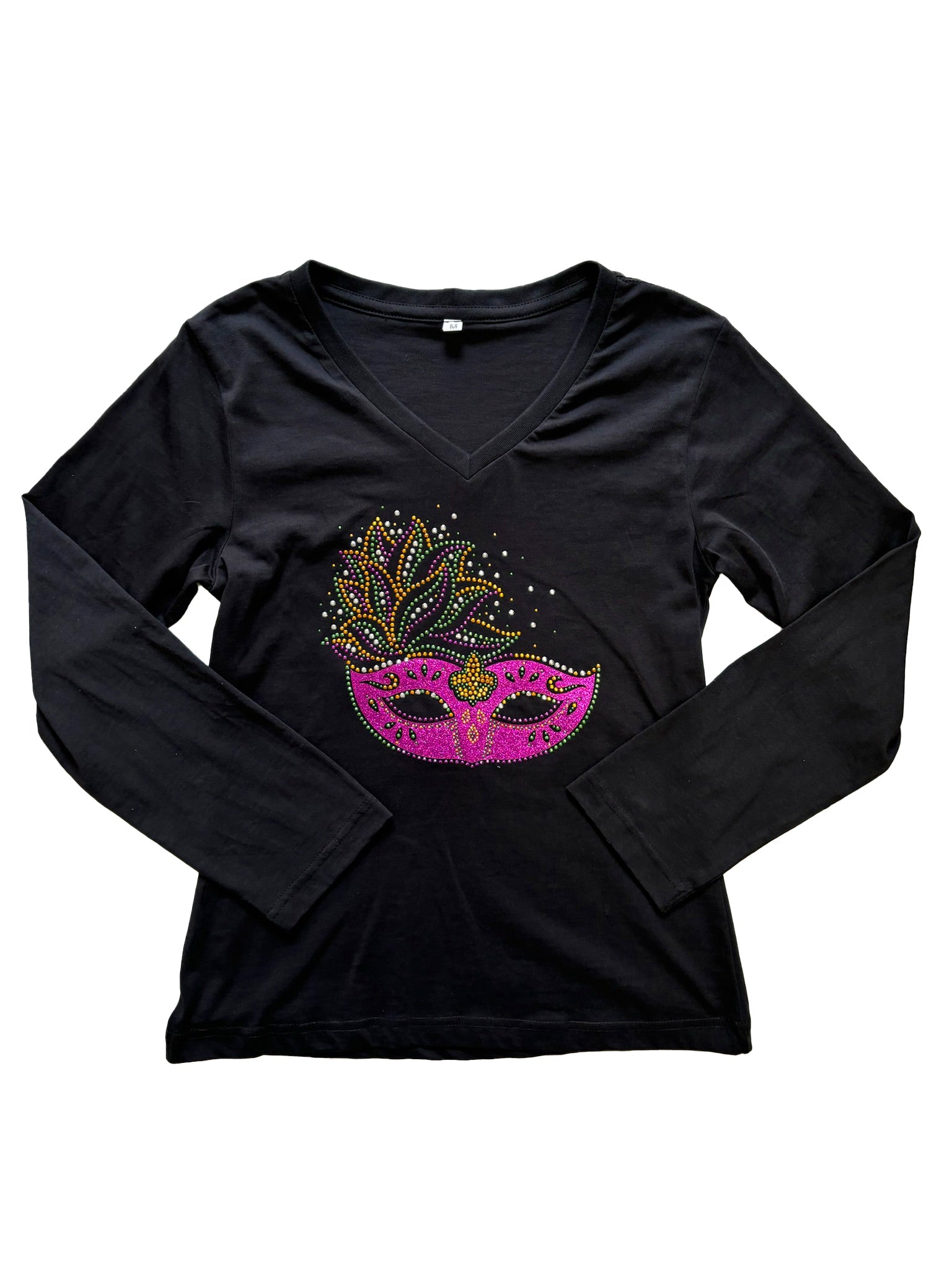 Enhance your look with this stunning fitted shirt featuring a beautiful purple glitter mask adorned with rhinestones and delicate side feathers. The perfect addition to your wardrobe for a touch of sophistication and luxury. Stand out from the crowd and exude elegance with this unique and exclusive piece.