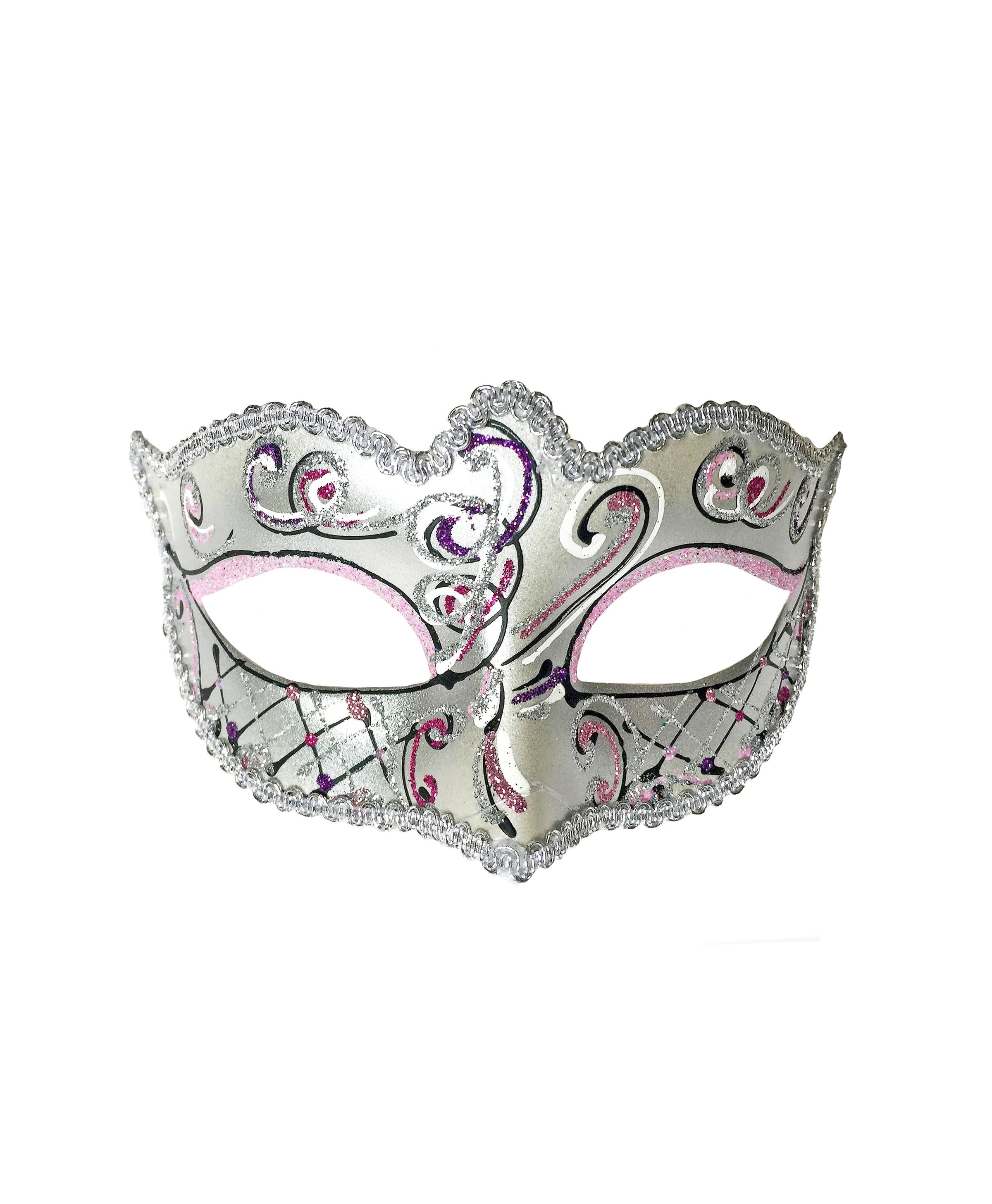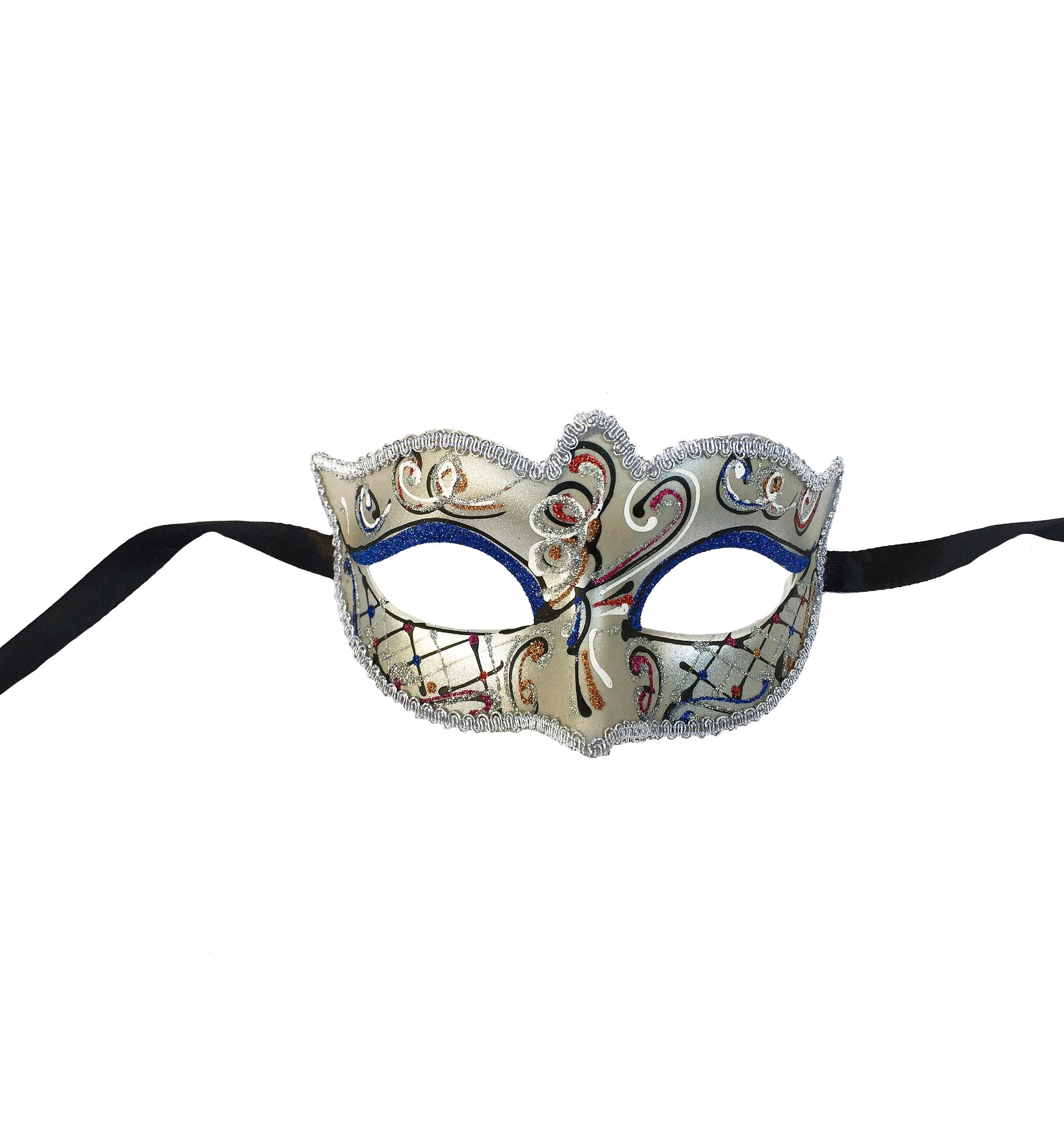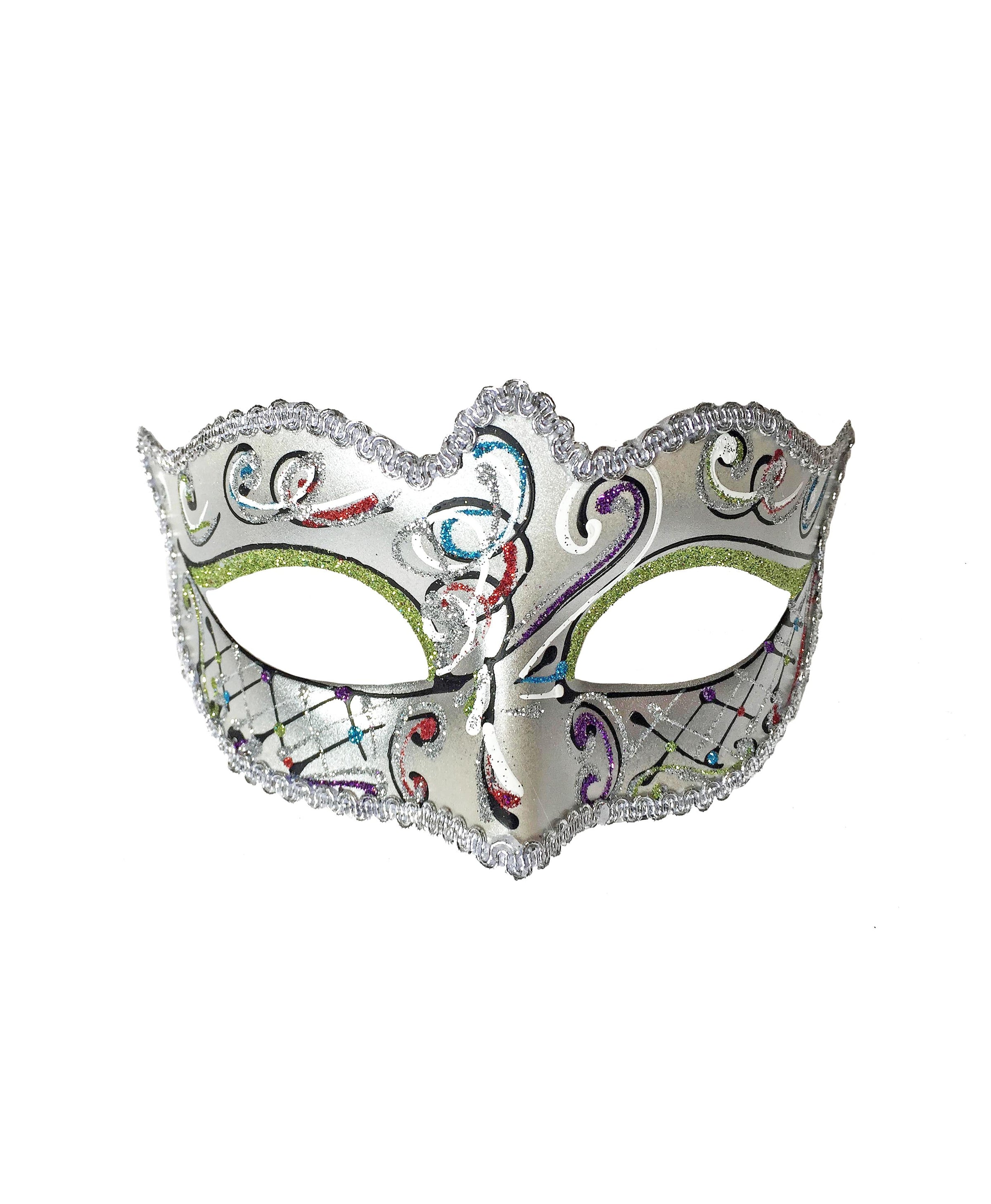 This more victorian eyelet swirl mask gives you a beautiful display of color in swirls and criss cross patterns across the mask face. Each eyelet is accented with a solid glitter corresponding color. Each mask has black ribbon to tie.