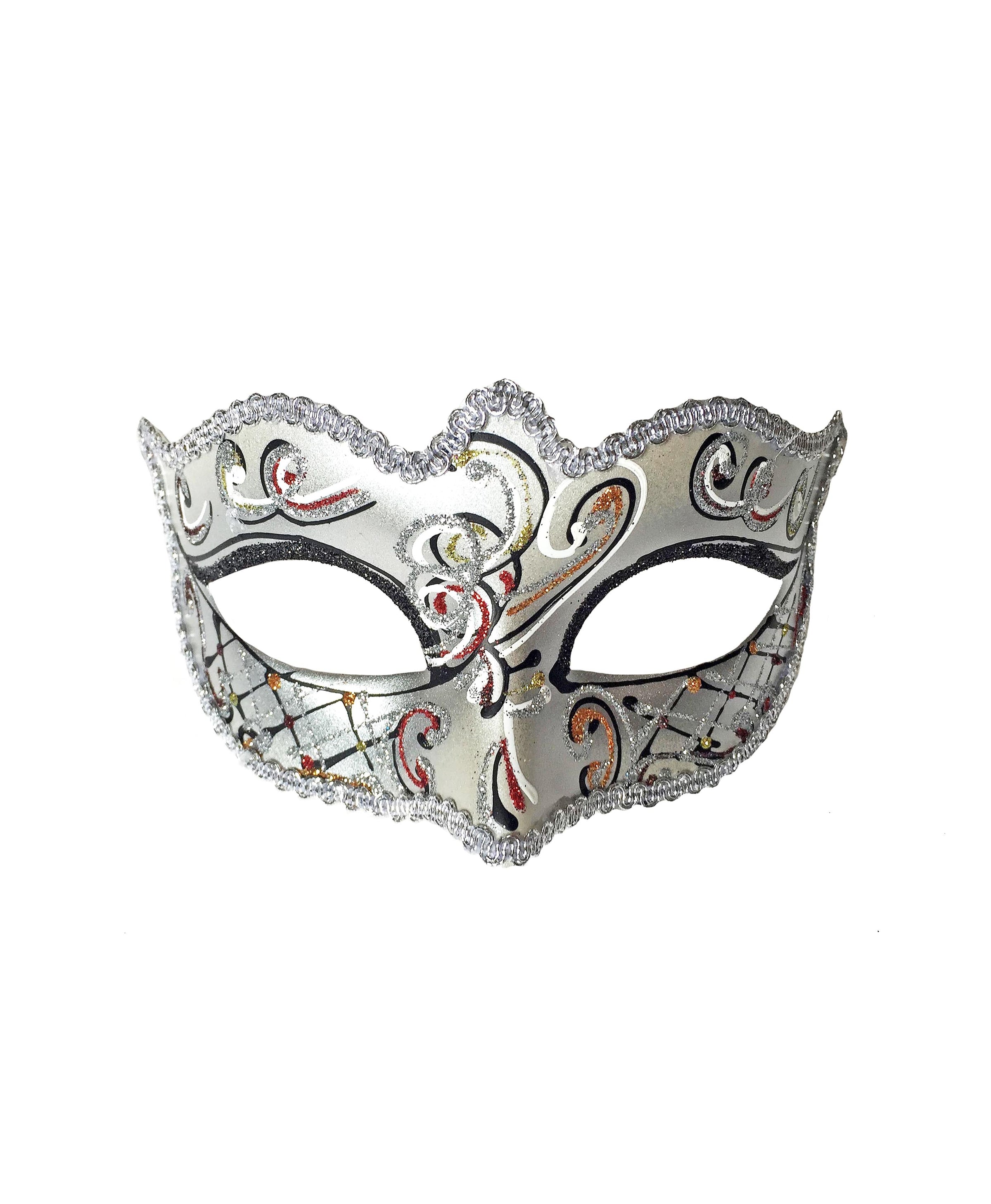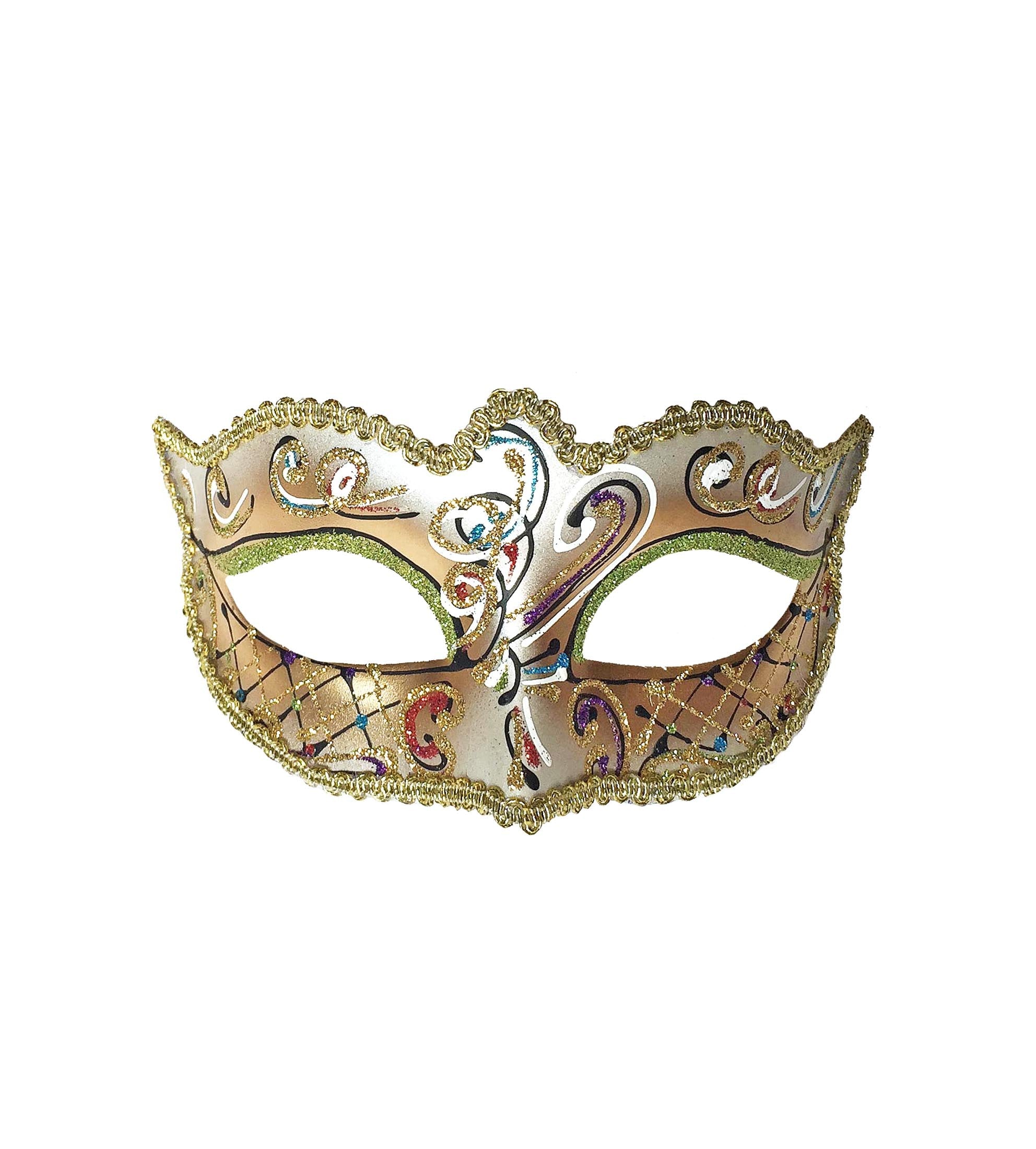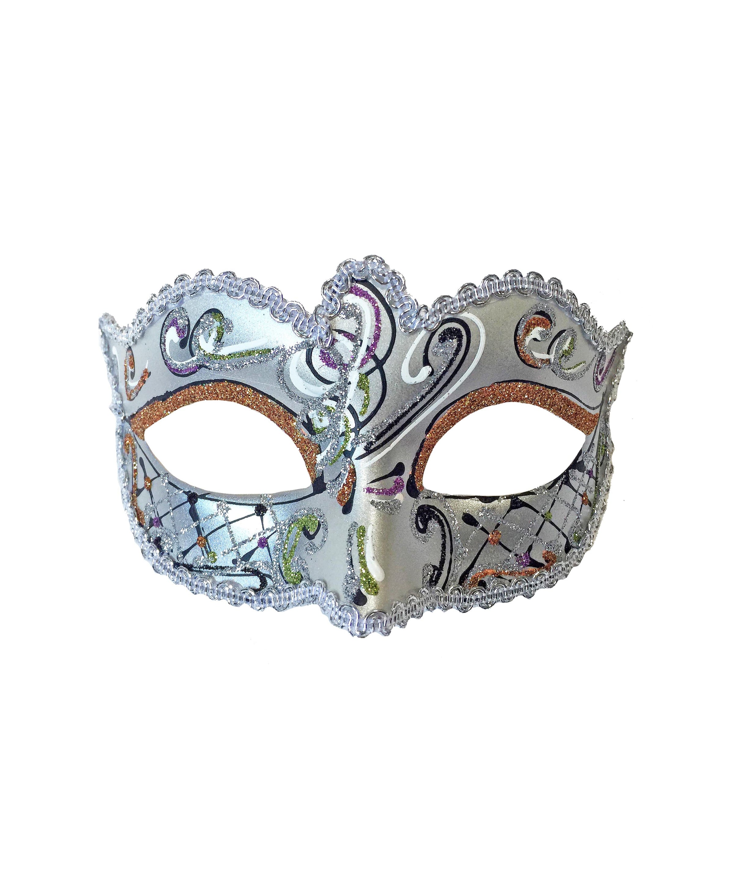 This more victorian eyelet swirl mask gives you a beautiful display of color in swirls and criss cross patterns across the mask face. Each eyelet is accented with a solid glitter corresponding color. Each mask has black ribbon to tie.