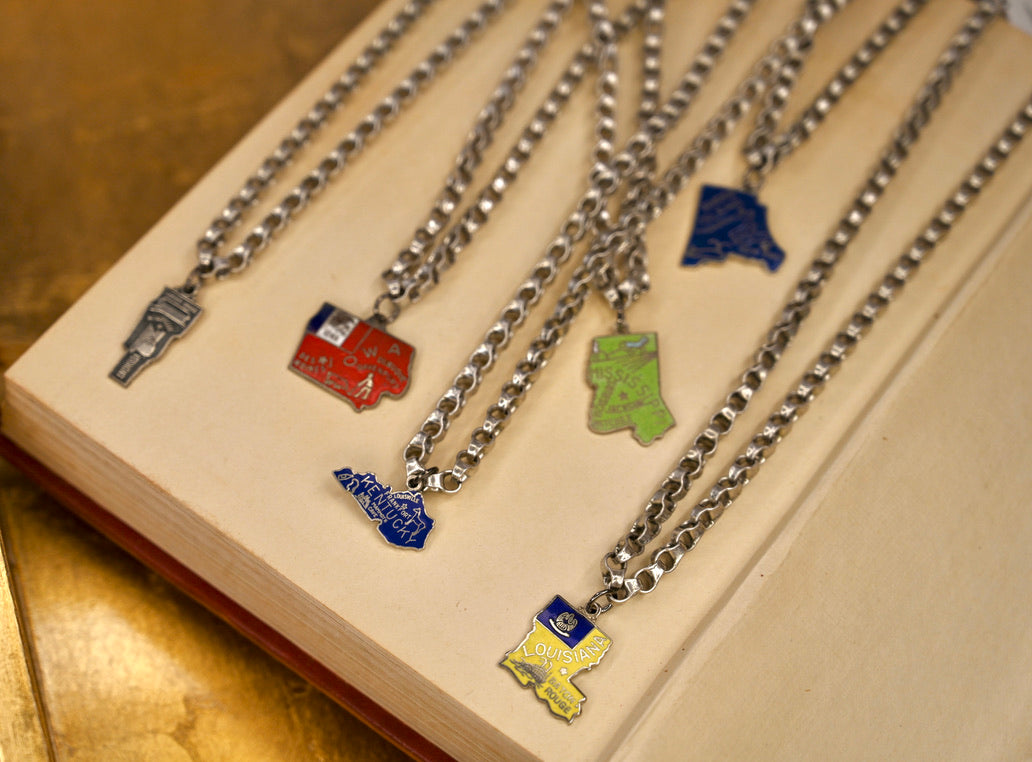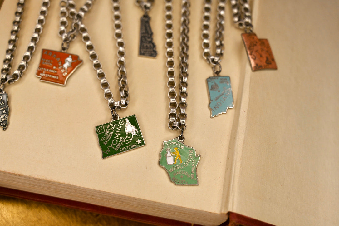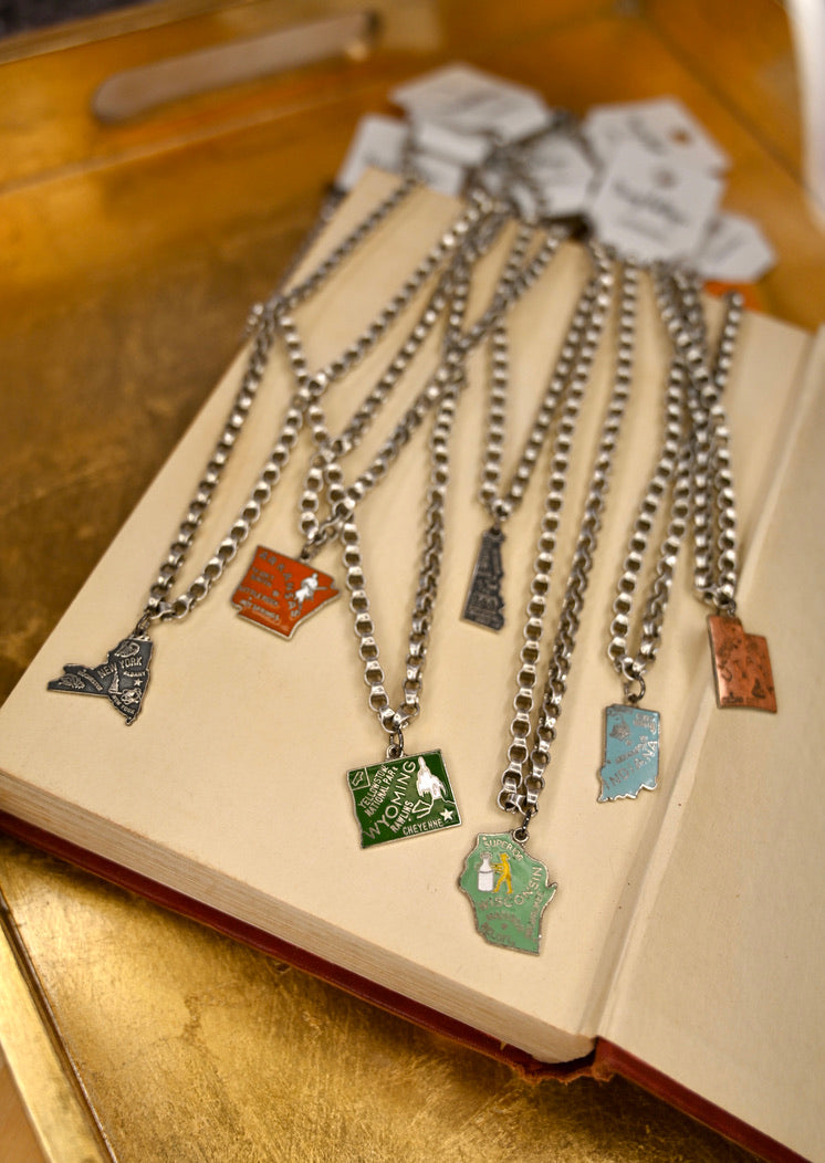 The Vintage State Necklace is a timeless piece that showcases your state pride. Handcrafted with vintage materials, this necklace is a unique and stylish addition to any outfit. Made with quality and care, it's perfect for everyday wear or as a thoughtful gift.