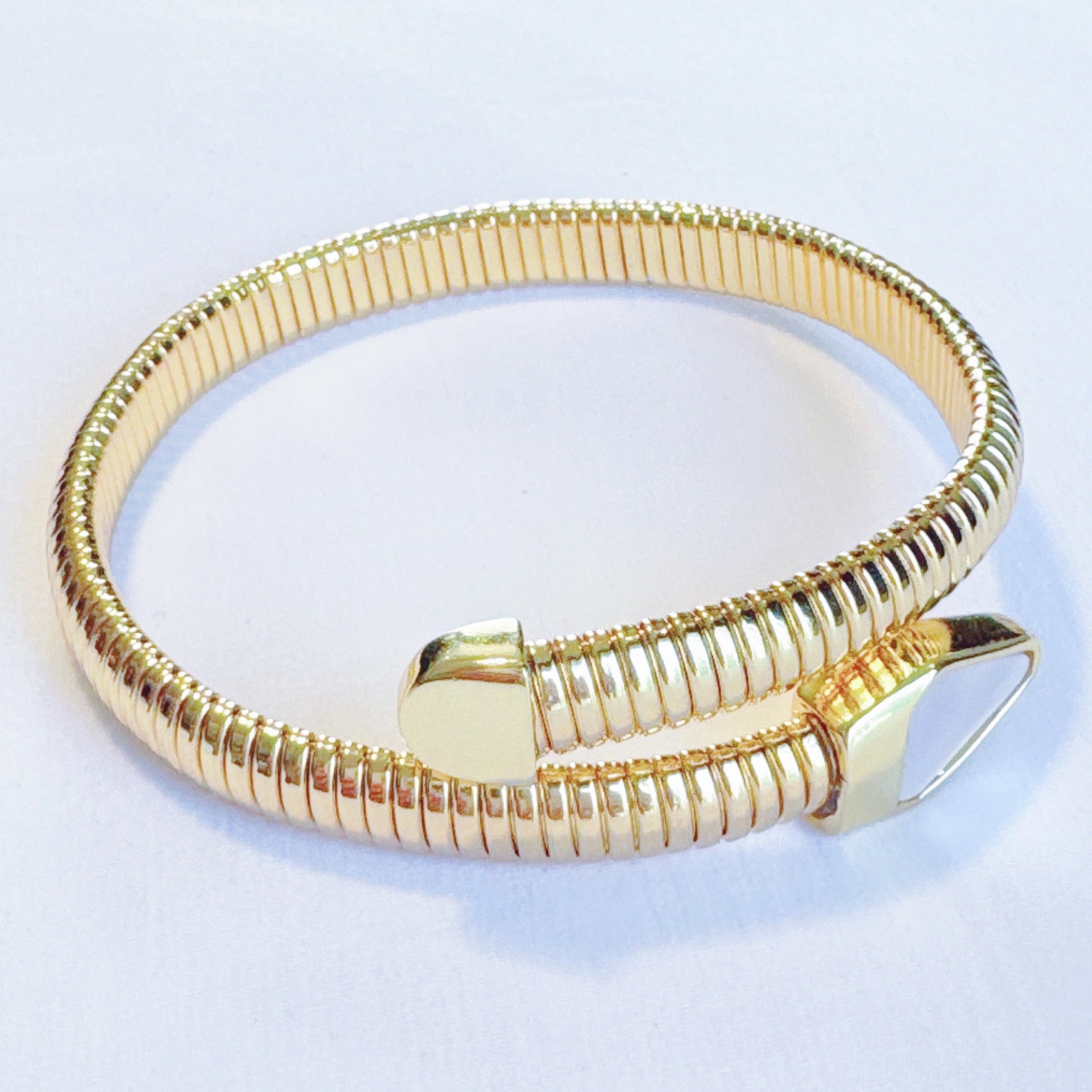 Elevate your style with the Viper Golden Coil Bangle Bracelet. This modern and chic piece features a unique golden coil design, perfect for stacking or wearing solo. A must-have for a bold and stylish look.