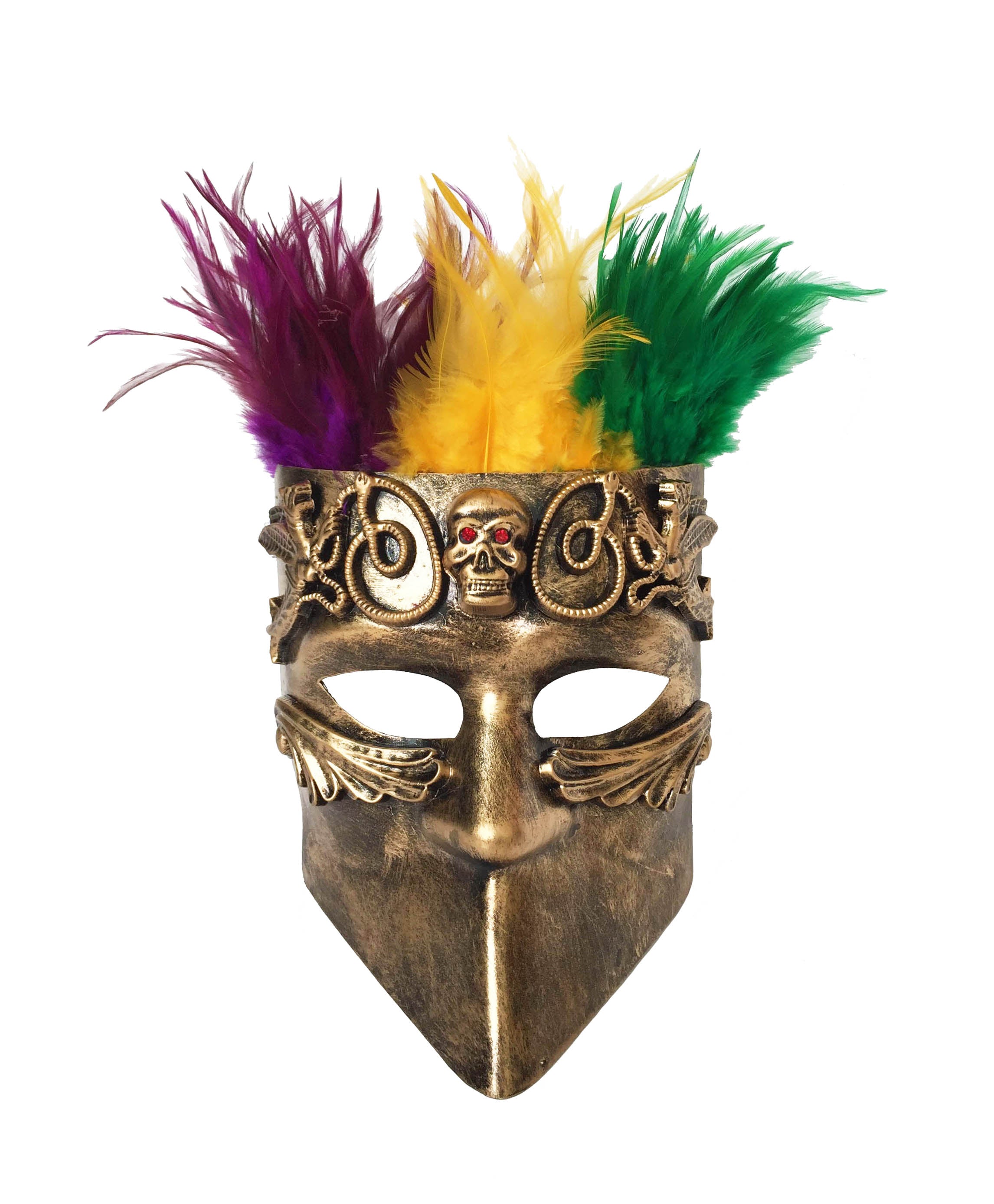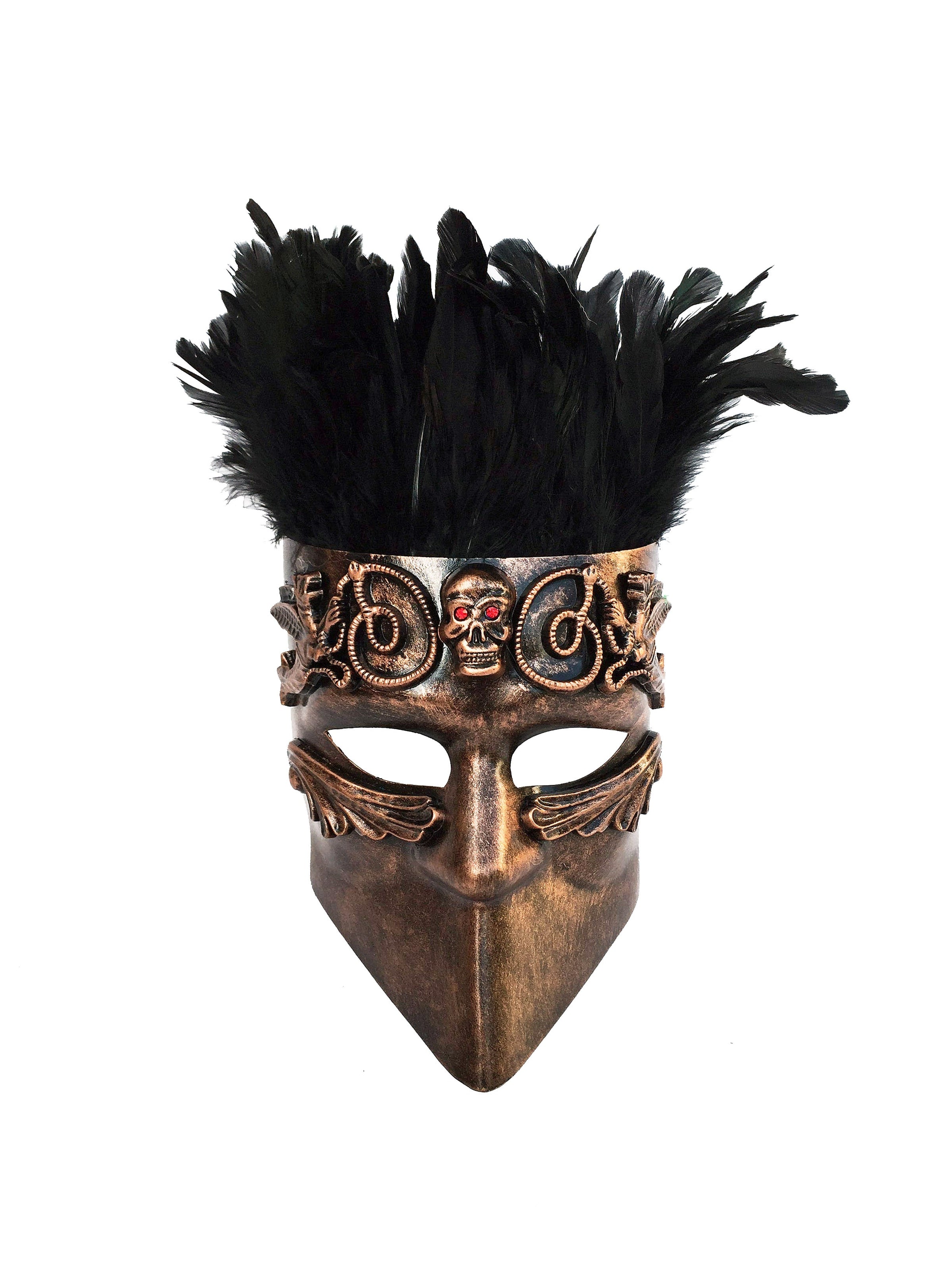 This warrior mask takes things in a new direction. Featuring a skull in the center with two griffins on each side holding coiling snakes. Textured feathering accents are under each eyelet. Features adorn the head of the mask. Each mask comes with black ribbons to tie.