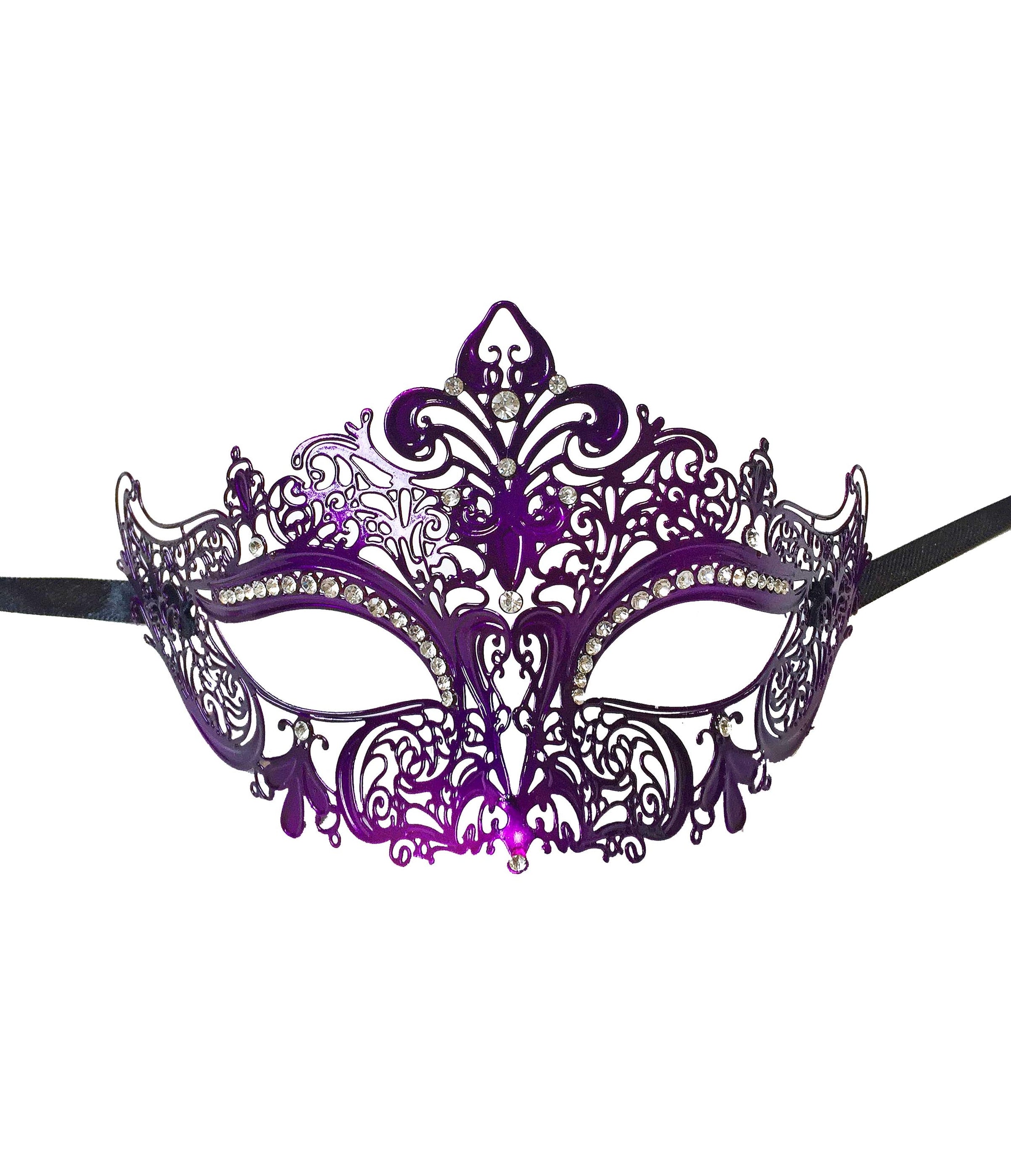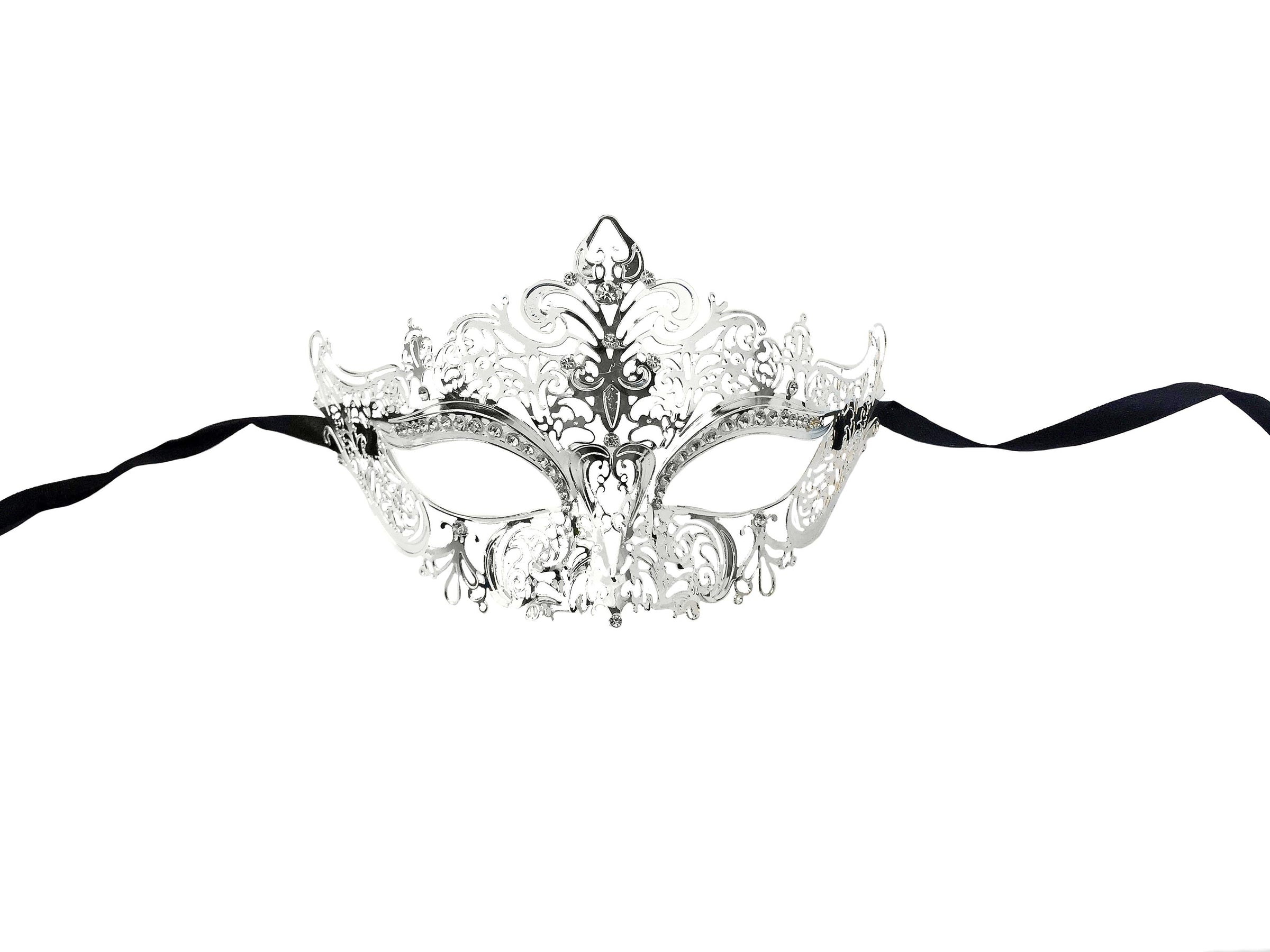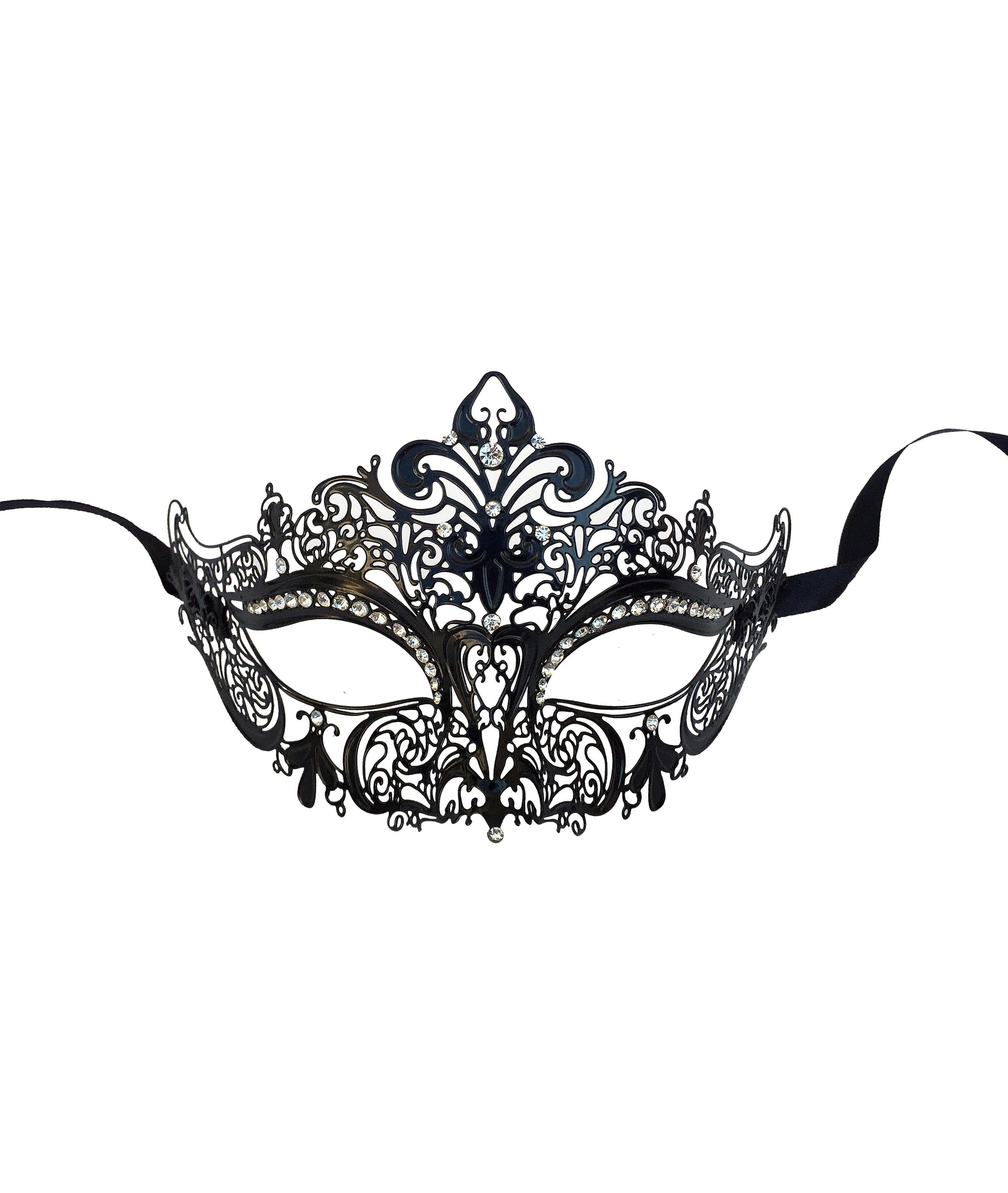This whimsical mask has tons of detailed swirls and peaks all around the mask face with a beautiful fleur de lis sitting in the center crown position. Each of these laser cut light weight metal masks come with black ribbons to tie.