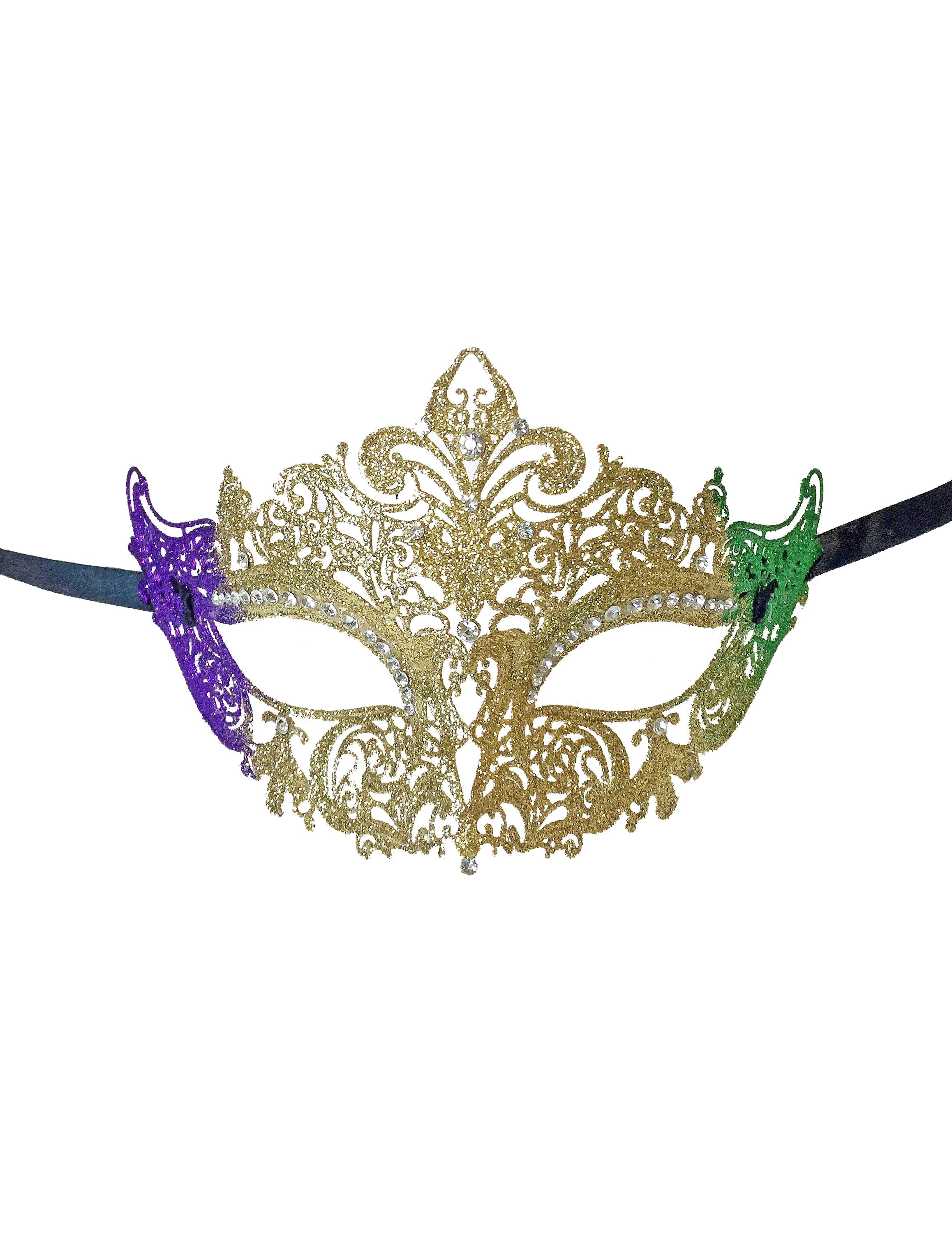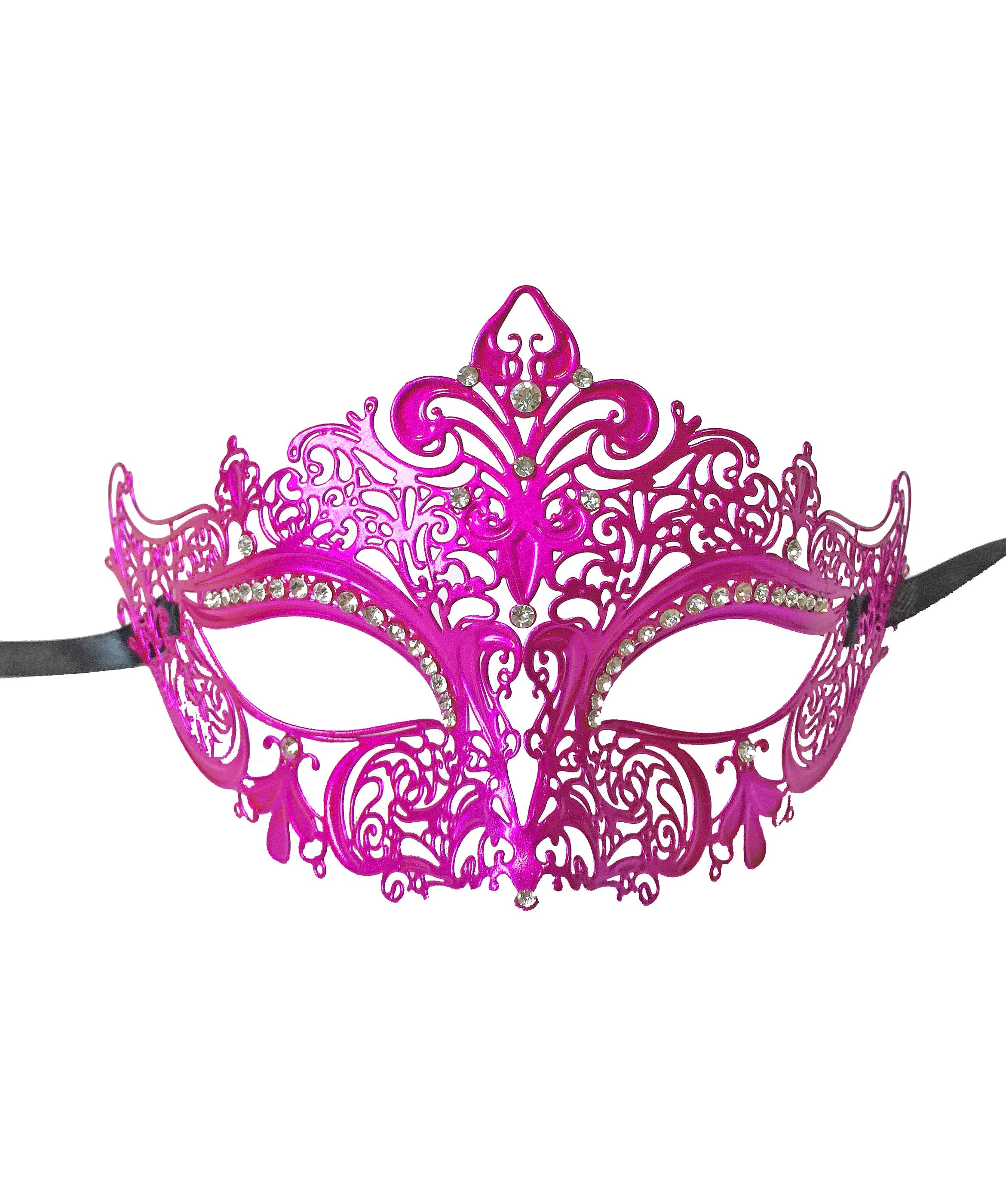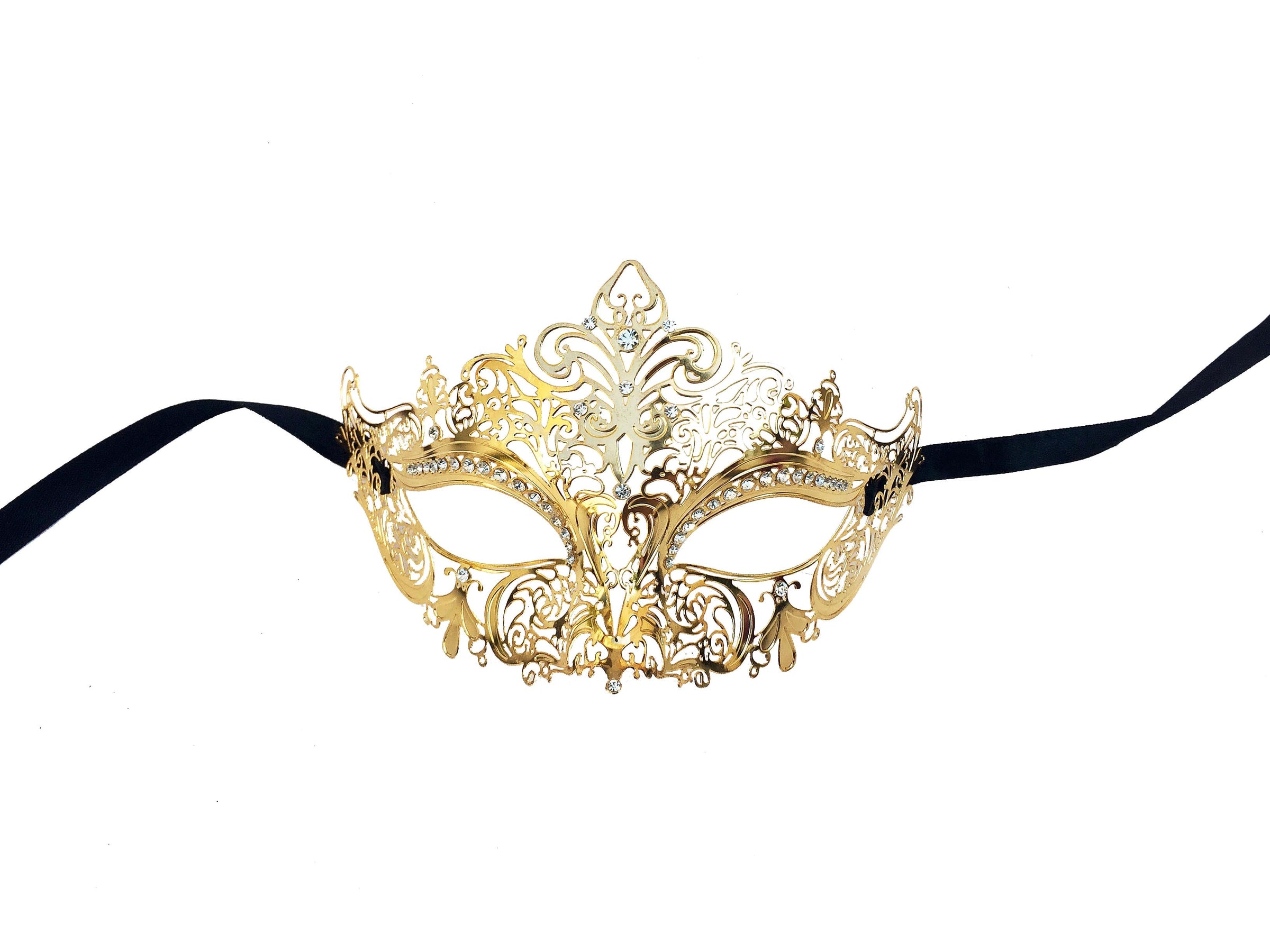 This whimsical mask has tons of detailed swirls and peaks all around the mask face with a beautiful fleur de lis sitting in the center crown position. Each of these laser cut light weight metal masks come with black ribbons to tie.