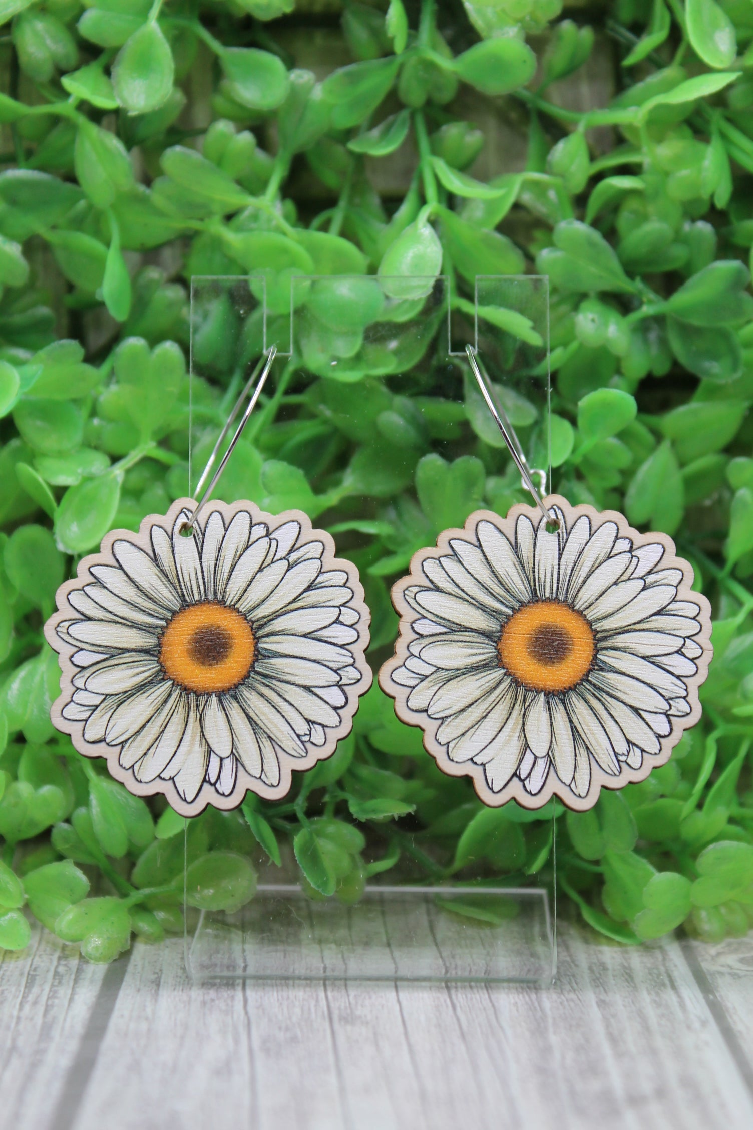 White Daisy Cutout Wood Hoop Dangle Earrings
