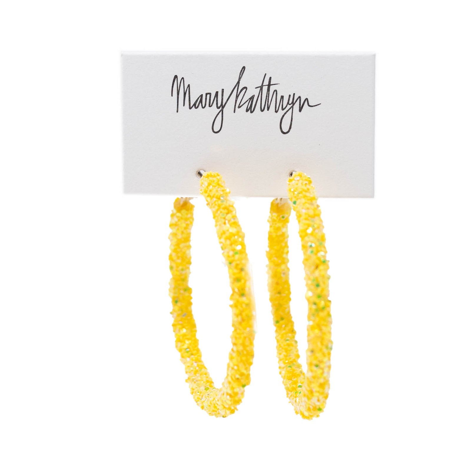 Be the life of the party in these bright yellow, glitter-embellished hoops. Whether you're heading to a shindig or just out for a fun night on the town, these Large Glitter Hoops will have you sparklin' and shinin'! P.S. With cuteness like that, you won't need any other accessory.