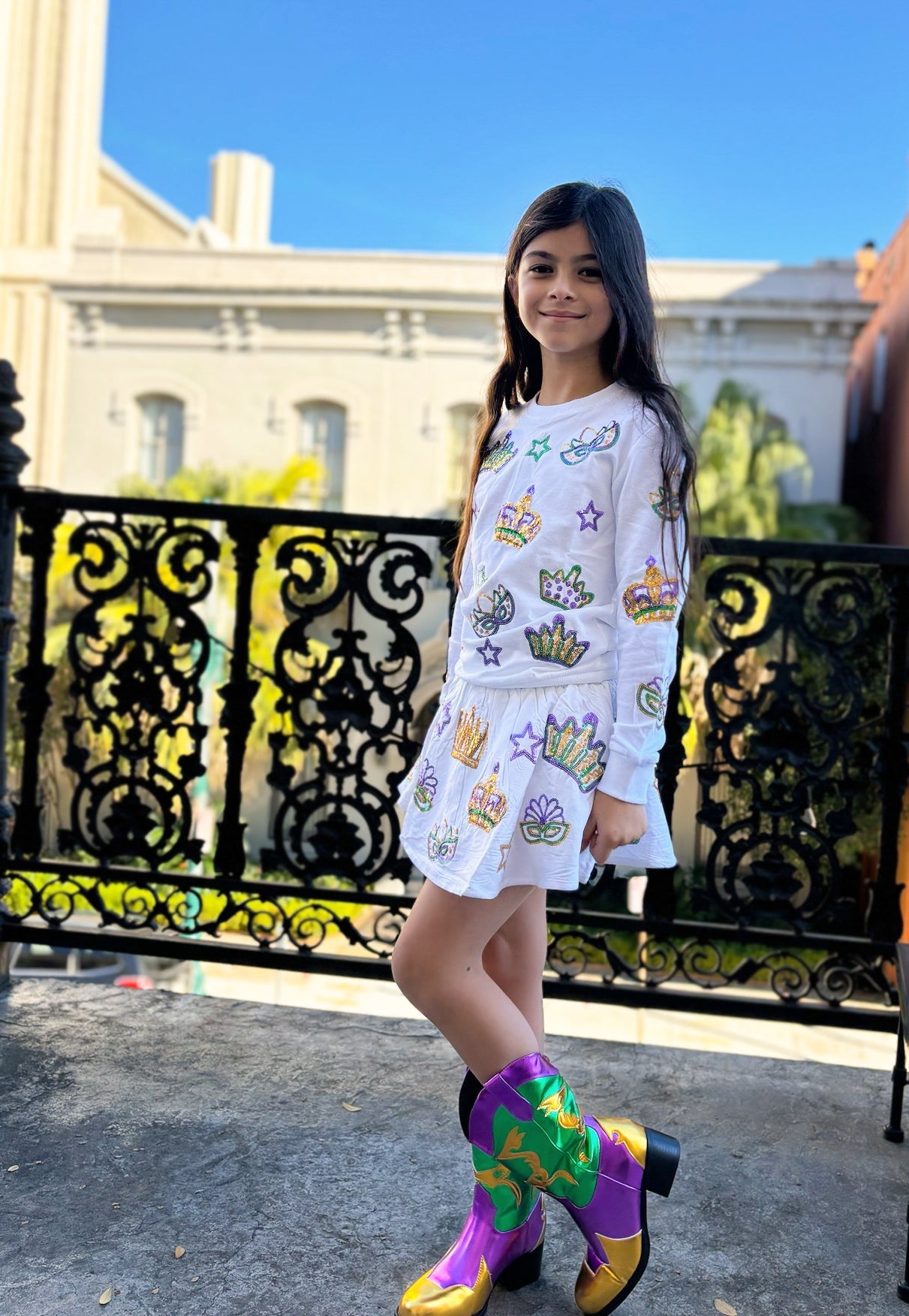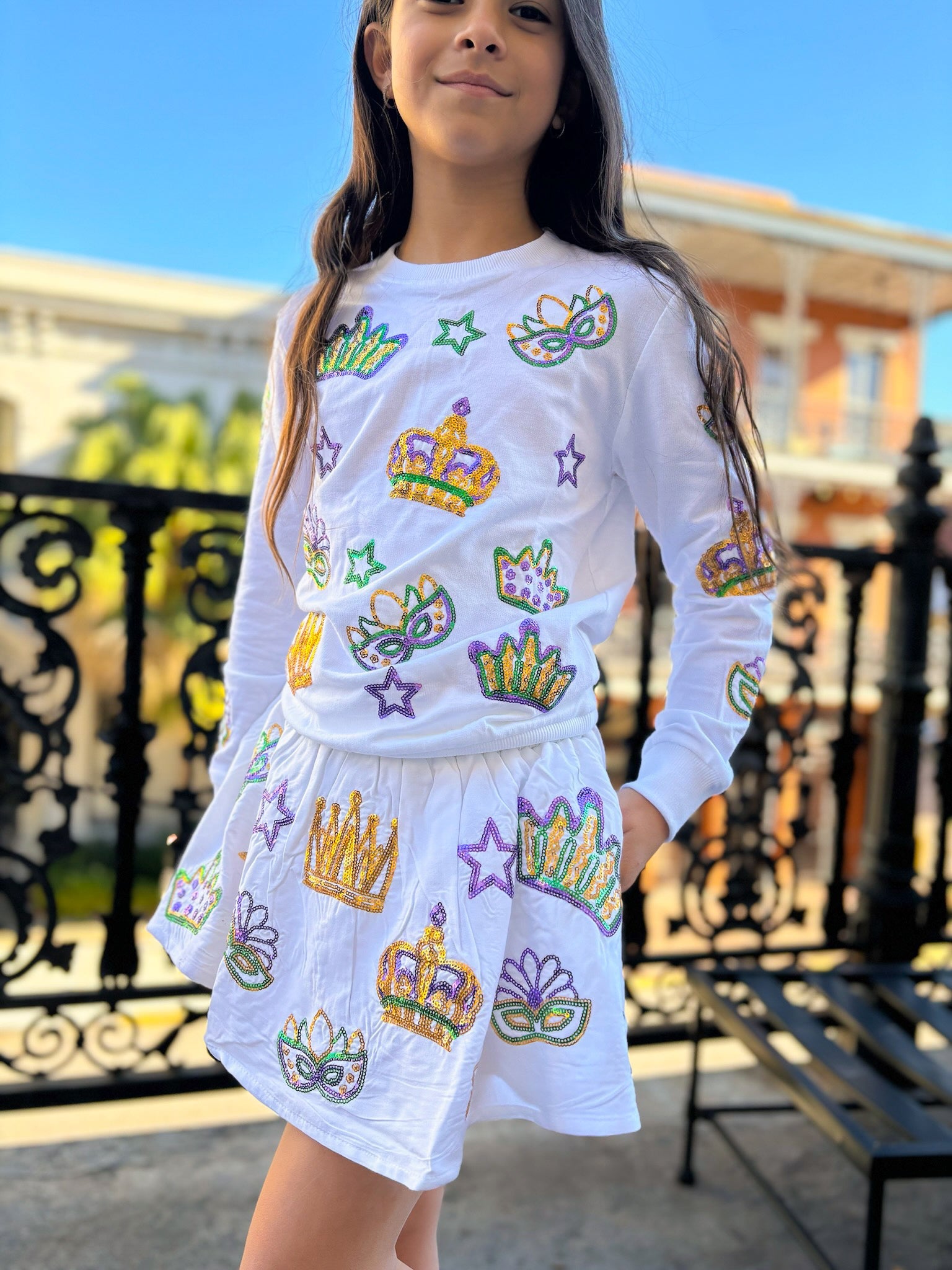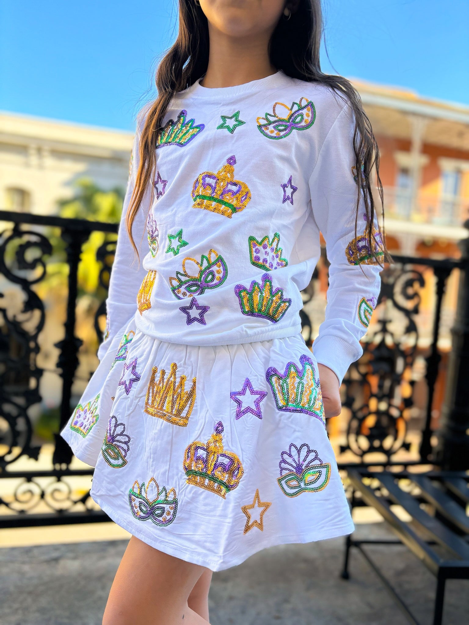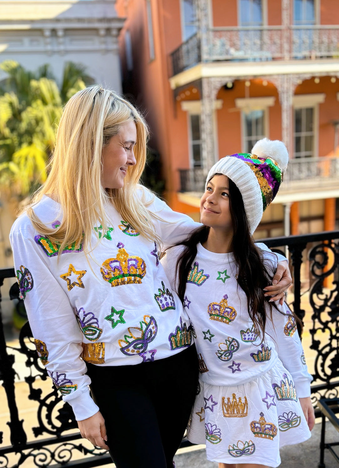 Show your little one's playful side with this quirky Youth Crowns and Masks French Terry Light Weight Pullover! Featuring sequin crown, mask, and star appliqués, this long sleeve cotton pullover is perfect for Mardi Gras festivities and will surely match your child's fun personality.